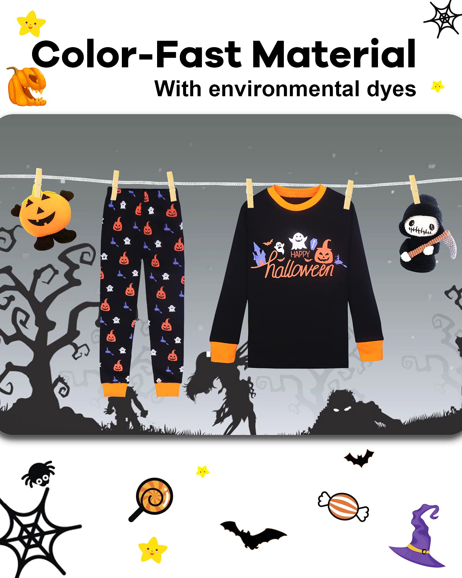 Safety: For kids' safety, our sleepwear is snug-fitting. And the T-Shirt pajamas sets are designed for the figure of most boys, including size 18-24M halloween kids pajamas, 2t halloween pajamas, 3t halloween pajamas, 4t halloween pajamas, size 5/5t halloween pajamas, size 6 pajamas, size 7 pajamas, size 8 pajamas, size 10 pajamas, size 12 pajamas. And we recommend checking the size chart carefully and sizing up if your little boy is a bit bigger than average