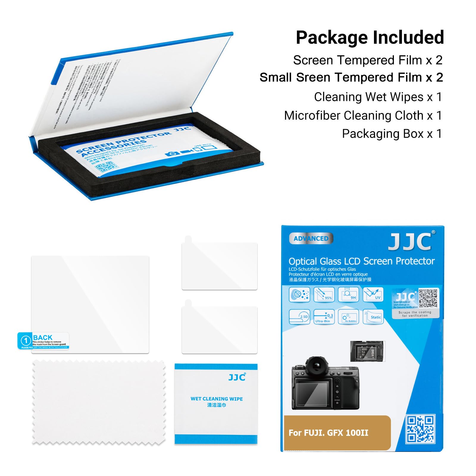 [2.5D Rounded Edges] :Provides a very comfortable and smooth surface to grip and prevent the edges from scratching fingers during installation. Packaging includes:2 Pcs LCD Screen, 4 Pcs Small Screen Film.Our Tempered Glass Screen Protector fits perfectly for your Fuji Fujifilm GFX 100II Camera.