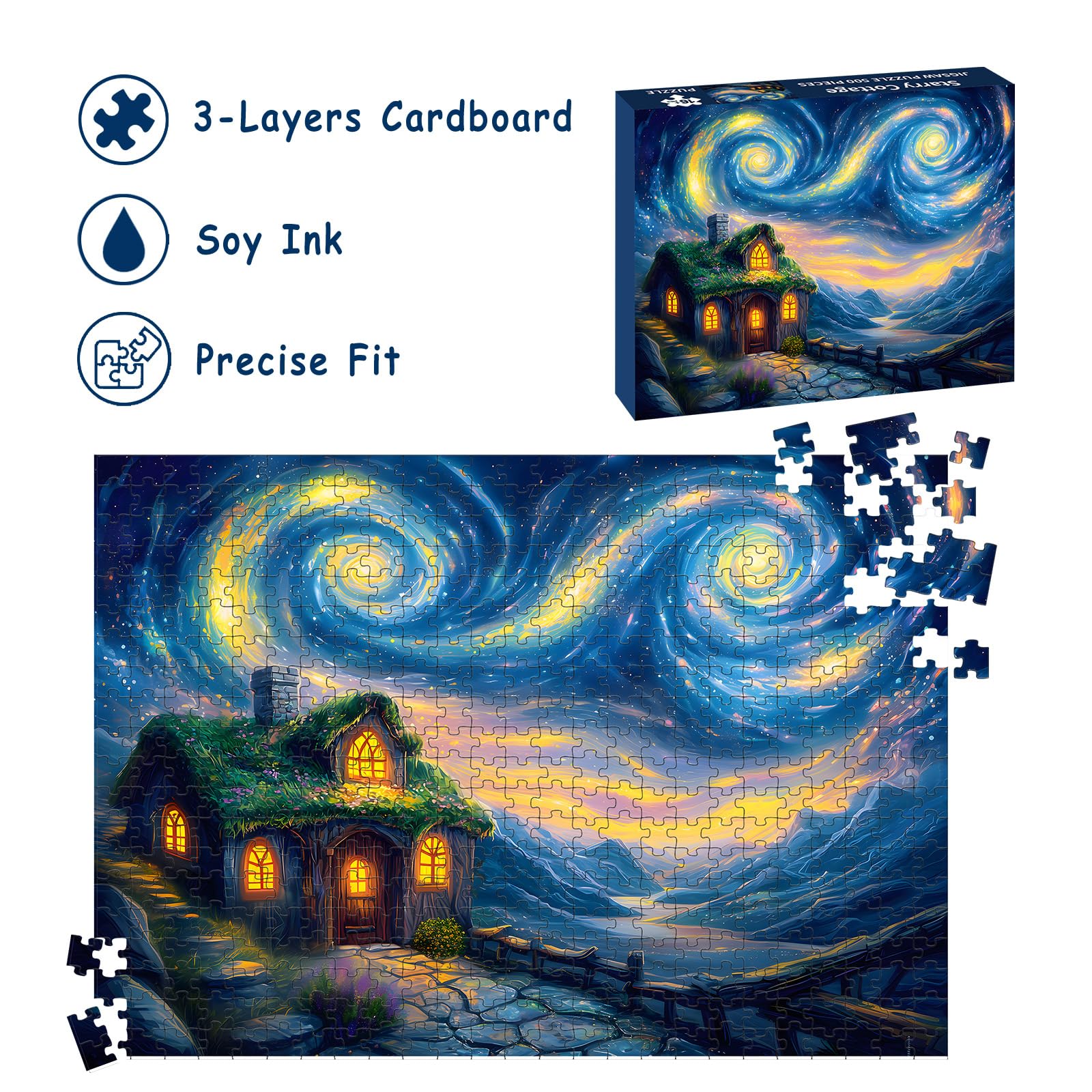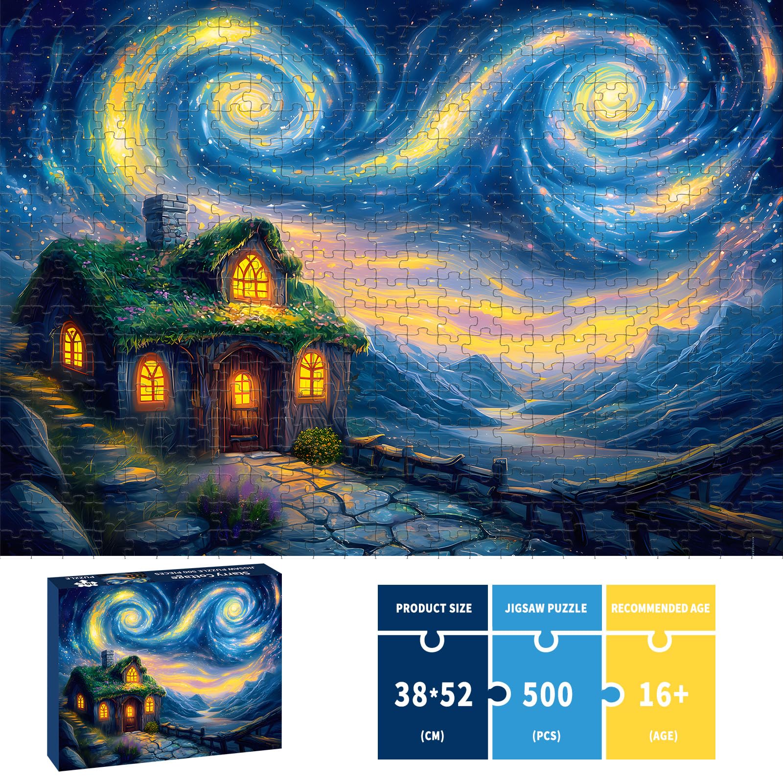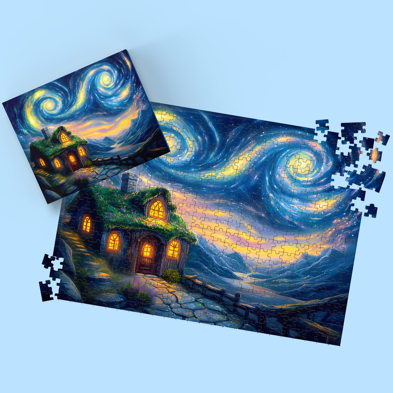 Puzzles for Adults 500 Pieces, Starry Night Jigsaw Puzzles 500 Pieces - Starry Cottage, Cottage Landscape Puzzles, Finished Size 20.47*14.96”, with 1:1 Poster, Letter on the Back