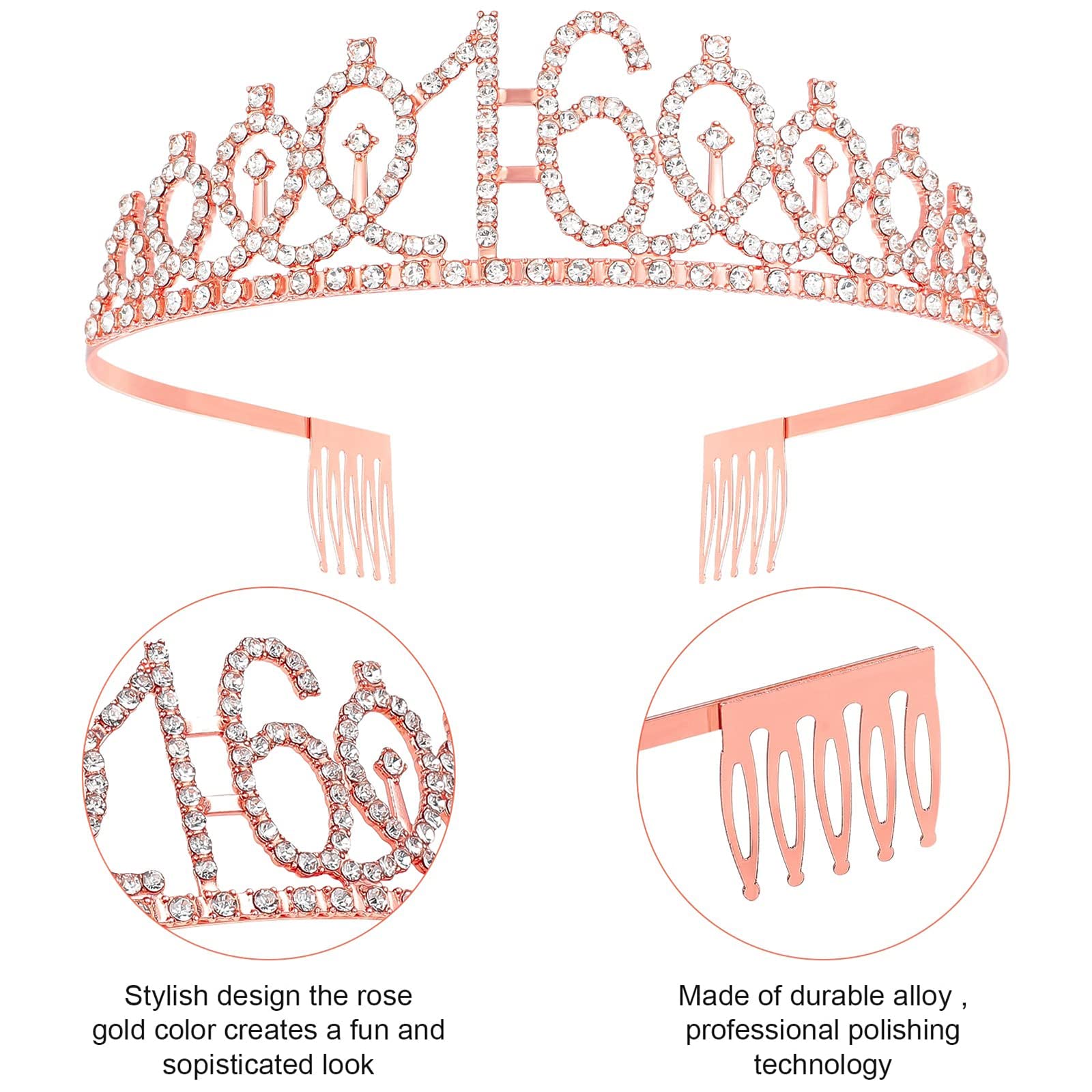 【Sweet 16 Tiara】: The 16th birthday crown headband is made of quality alloy and shiny rhinestones, the rose gold color highlights elegance. Crown with combs that make sure it can grip the hair more tightly for fitting girls.