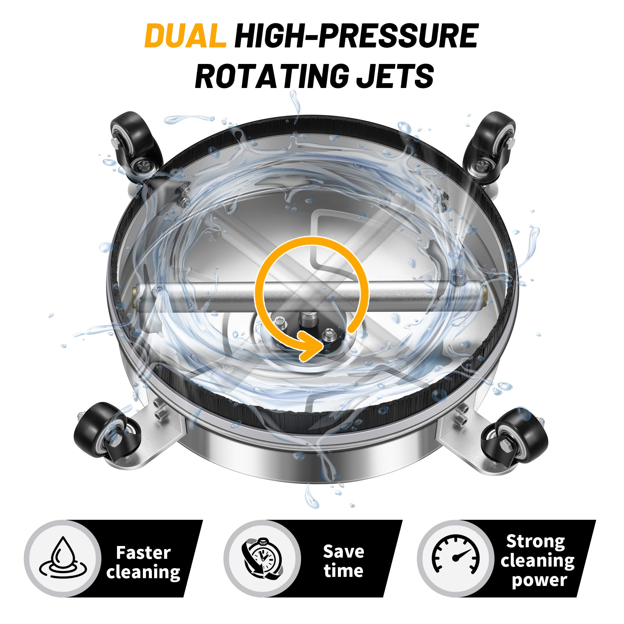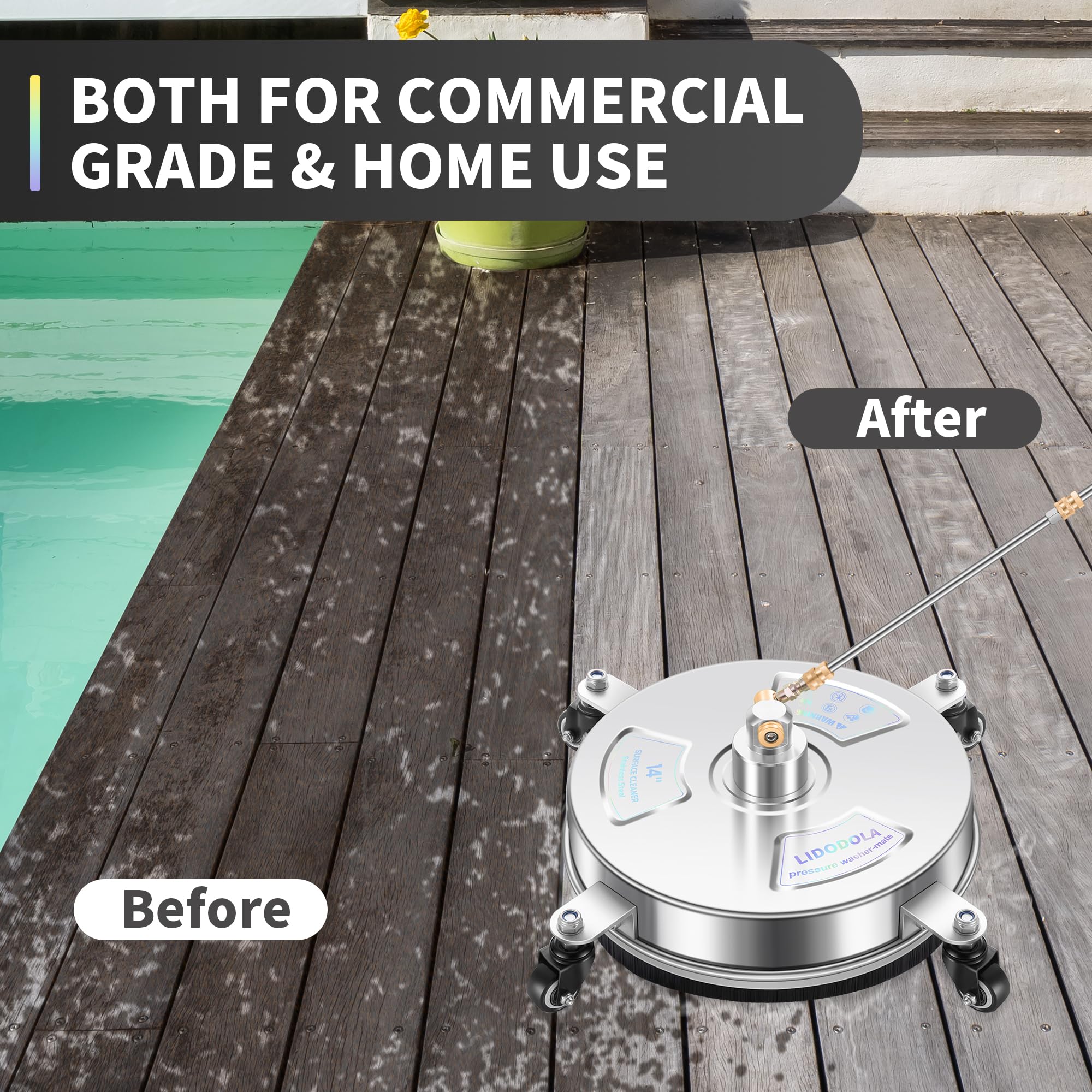PROFESSIONAL CLEANING – The Lidodola surface cleaner achieves high-performance cleaning across a 14" wide area with dual spinning nozzles, delivering thorough removal of stubborn stains on driveways, decks, sidewalks, and other large surfaces.