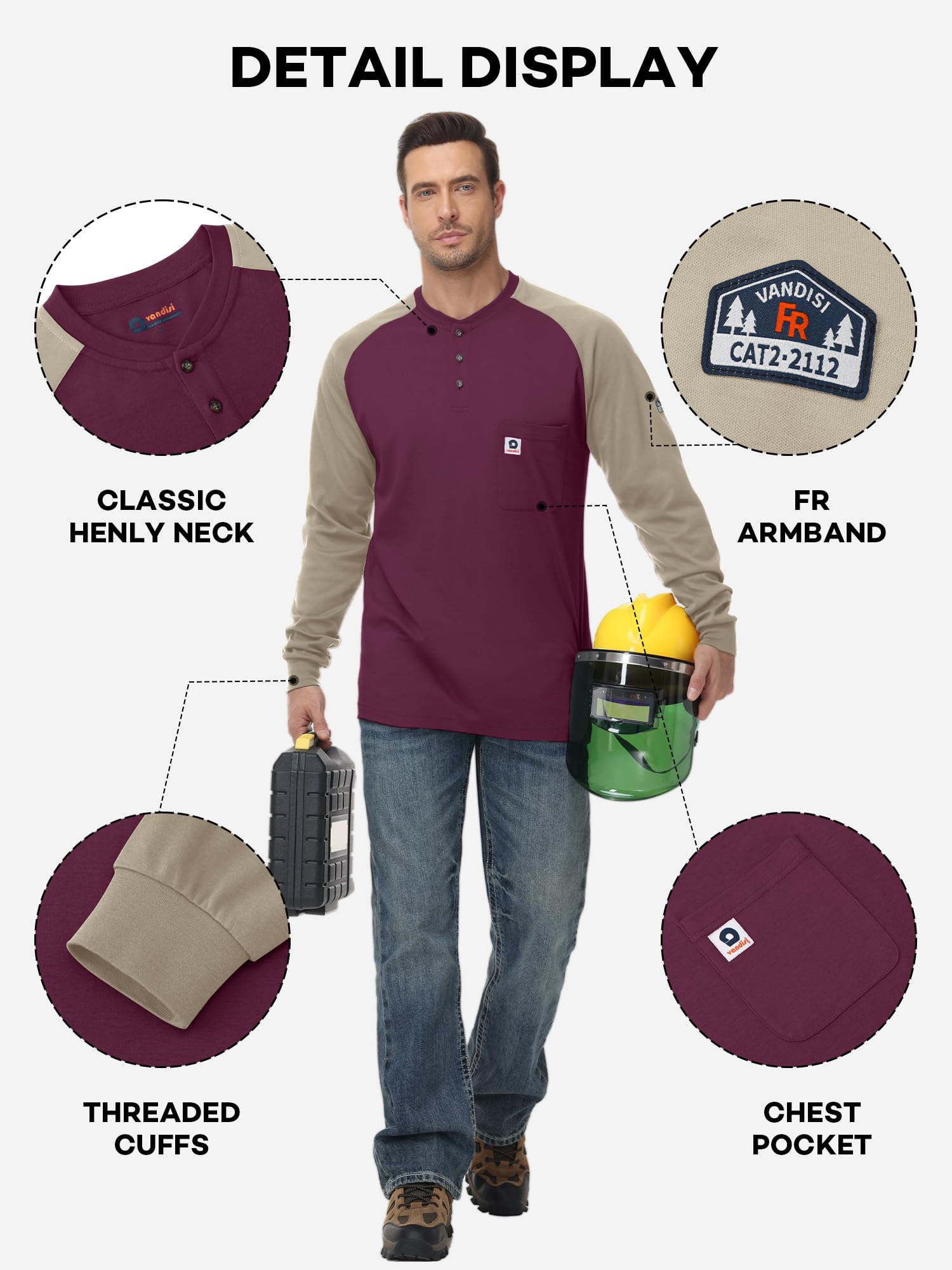 【Humanized Design】The Vandisi CAT 2 FR shirt features high-density seams and thermal transfer labels neckline for a true comfort experience. Henry collar and rib knit cuffs, enhanced fabric durability and stretch provide ease of movement and longer-lasting wear. Raglan sleeves significantly improve the fit of the shirt, 1 left chest pocket and 1 sleeve pocket for great convenience!