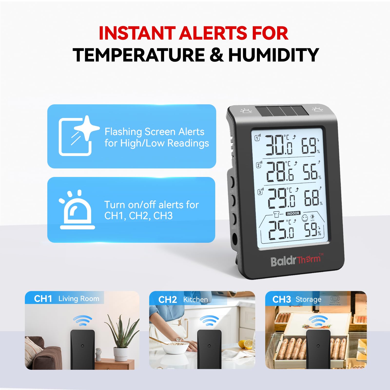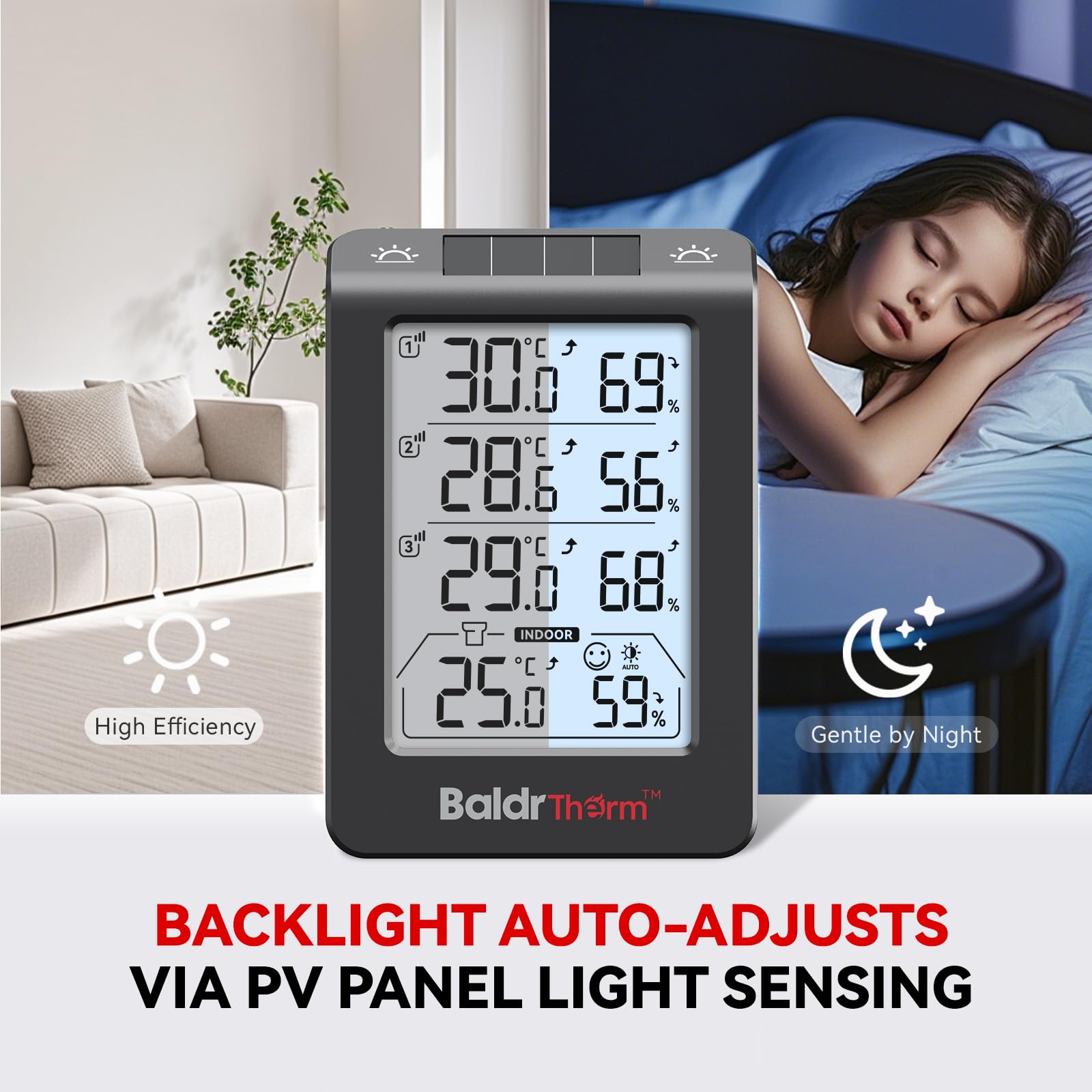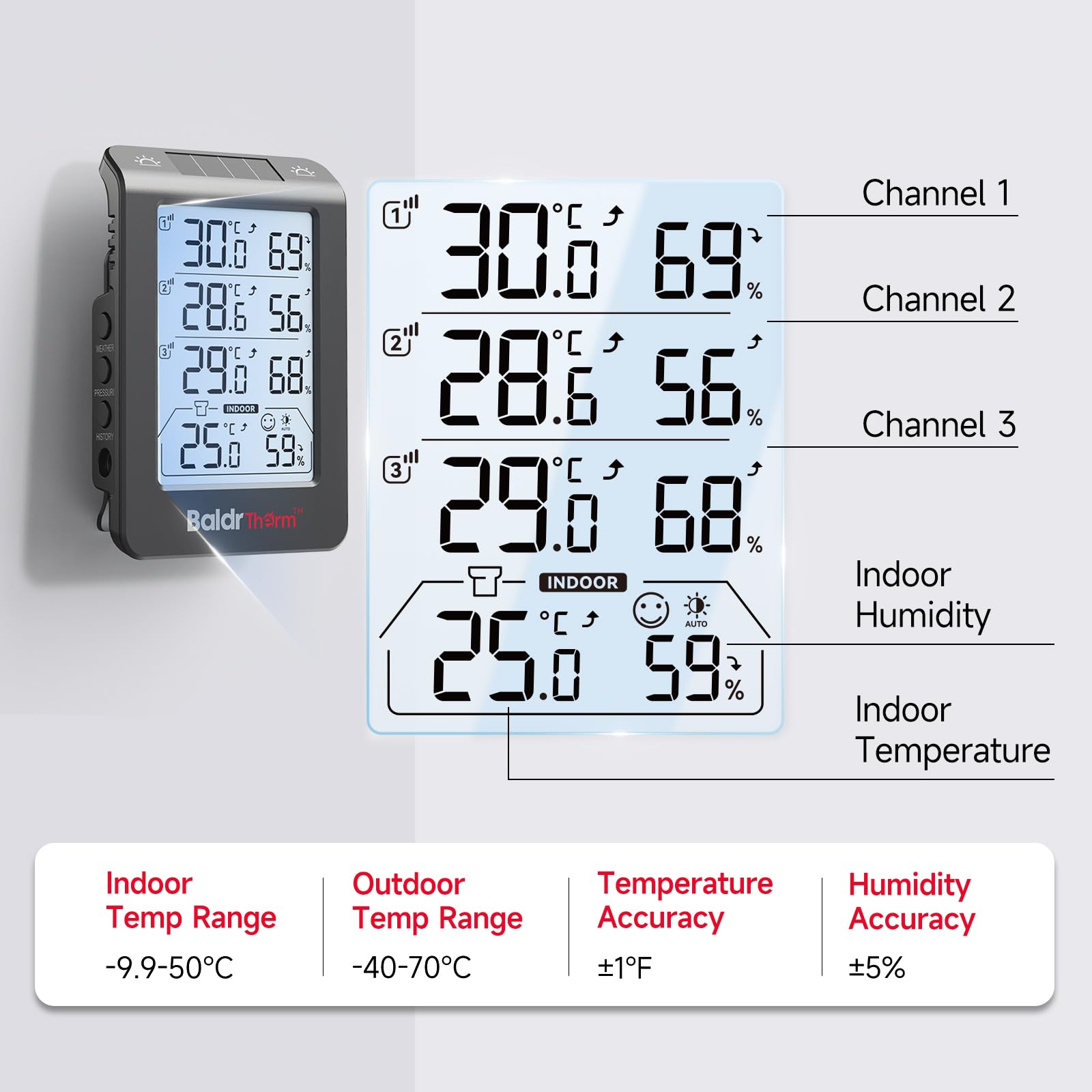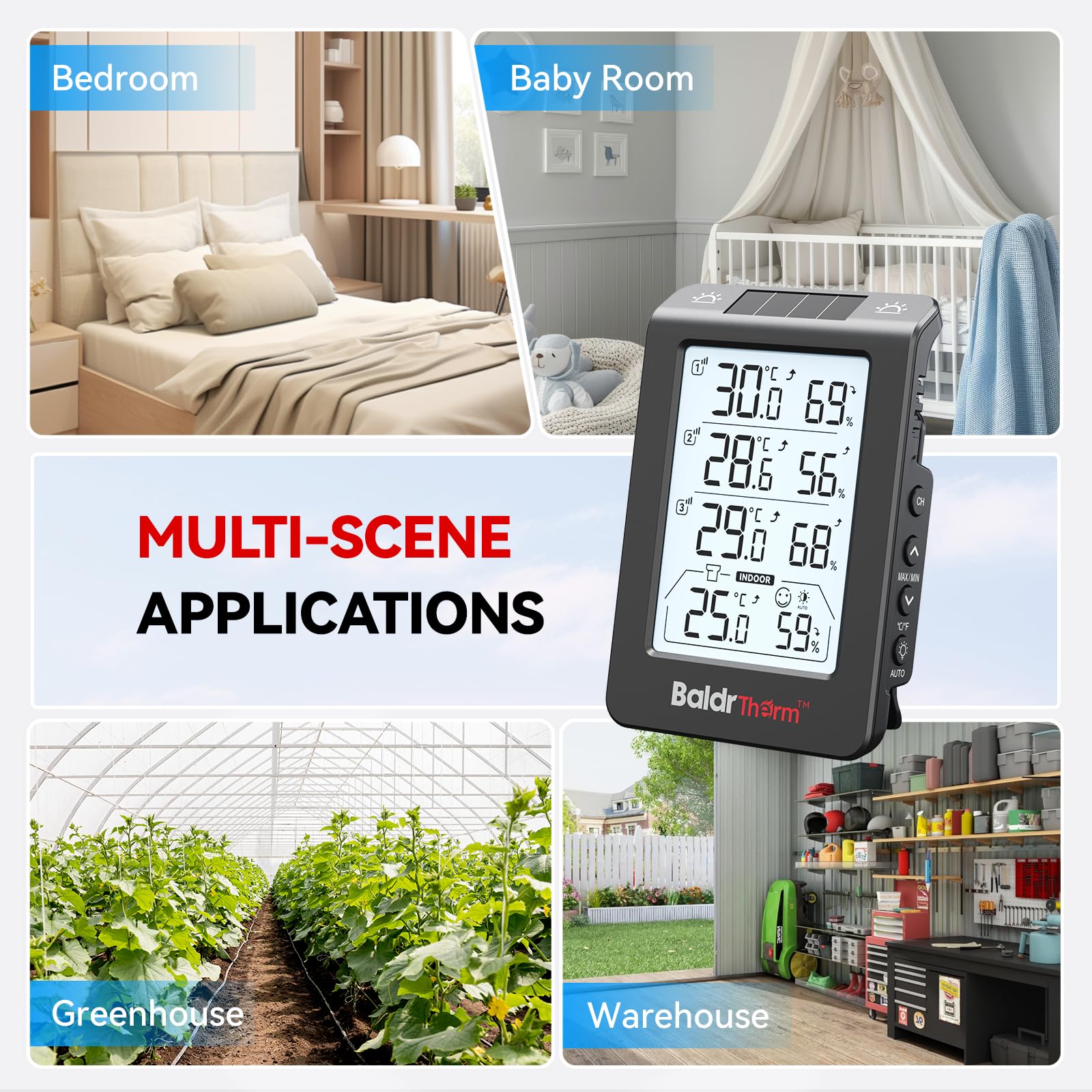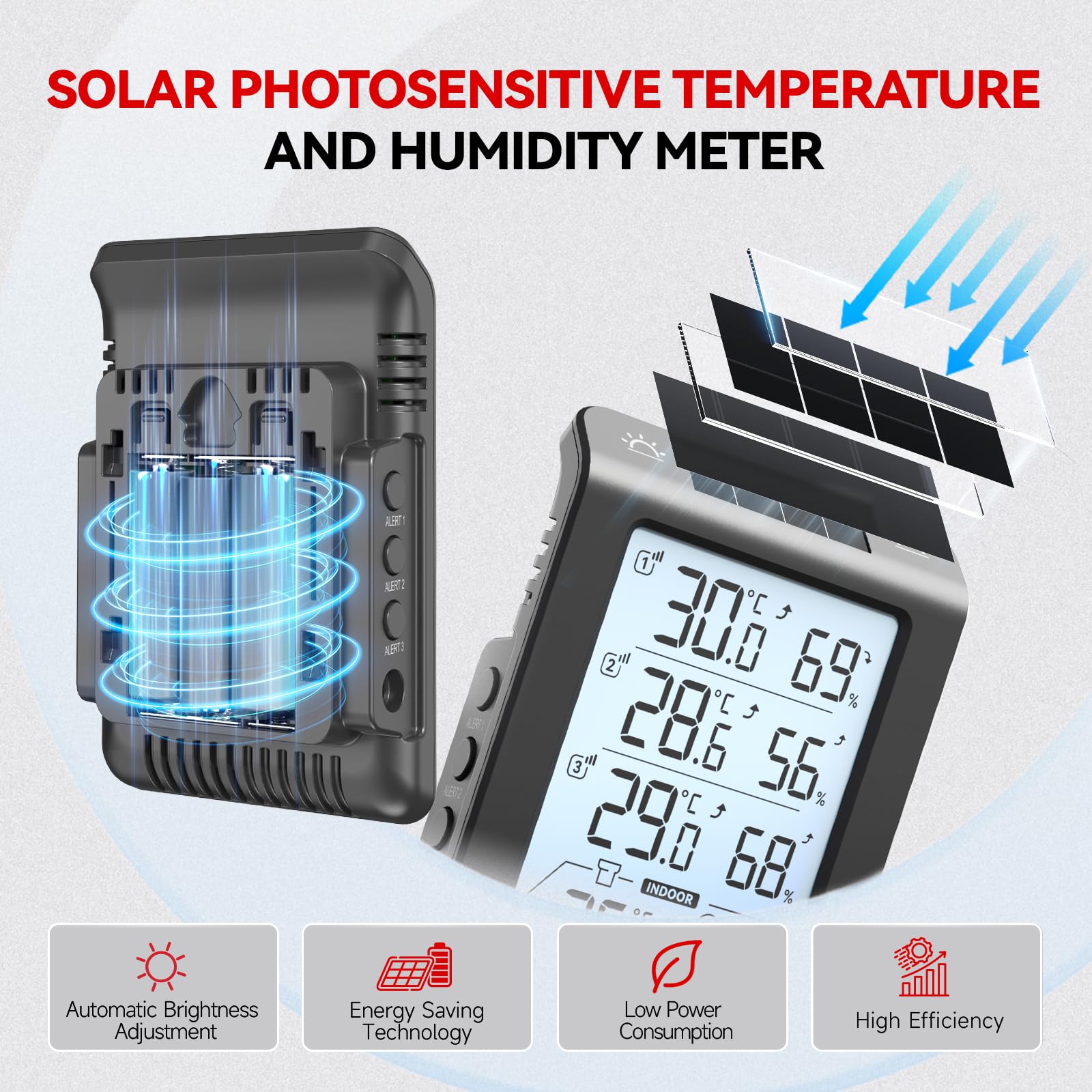 Solar Photosensitivity Thermo-hygrometer: This outdoor hygrometer uses advanced solar photovoltaic panels to quickly and accurately sense the surrounding temperature. Perfect for anyone seeking worry free, low maintenance solutions to monitor your garden, swimming pool, or outdoor space year-round. In addition, the main unit of the product is for indoor use, while the three sub units can be used outdoors.