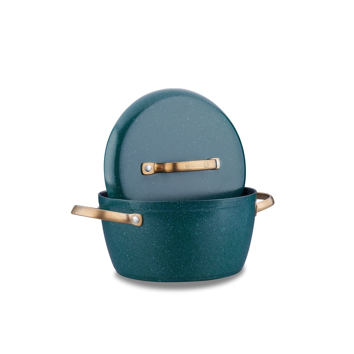 Korkmaz Vintage Cookware set is specially produced to meet the needs of chefs with its strong and state-of-the-art workmanship. Cooking becomes very easy with the nonstick coating. The green granite surface displays elegance and elevates the look of any kitchen. Korkmaz Vintage cookware set is the smart choice for savvy cooks. Korkmaz is among the most influential brands in Turkey and the world's leading brands producing stainless-steel kitchenware, electrical appliances, and tableware. You will pay not only for quality but also elegance by purchasing this cookware set. CARE INSTRUCTIONS BEFORE FIRST USE, clean with hot water and dish soap. In order to clean them, please use liquid dishwasher detergents. DO NOT RUB your cookware set’s surface with wire or any other kind of hard cleaning materials. Rubbing may lead to scratching the surface of your cookers and losing their brightness and granite surface. DO NOT LEAVE your set on fire without water in any circumstances. Depending on the detergent used, washing pots in the dishwasher may fade their glossary surface.