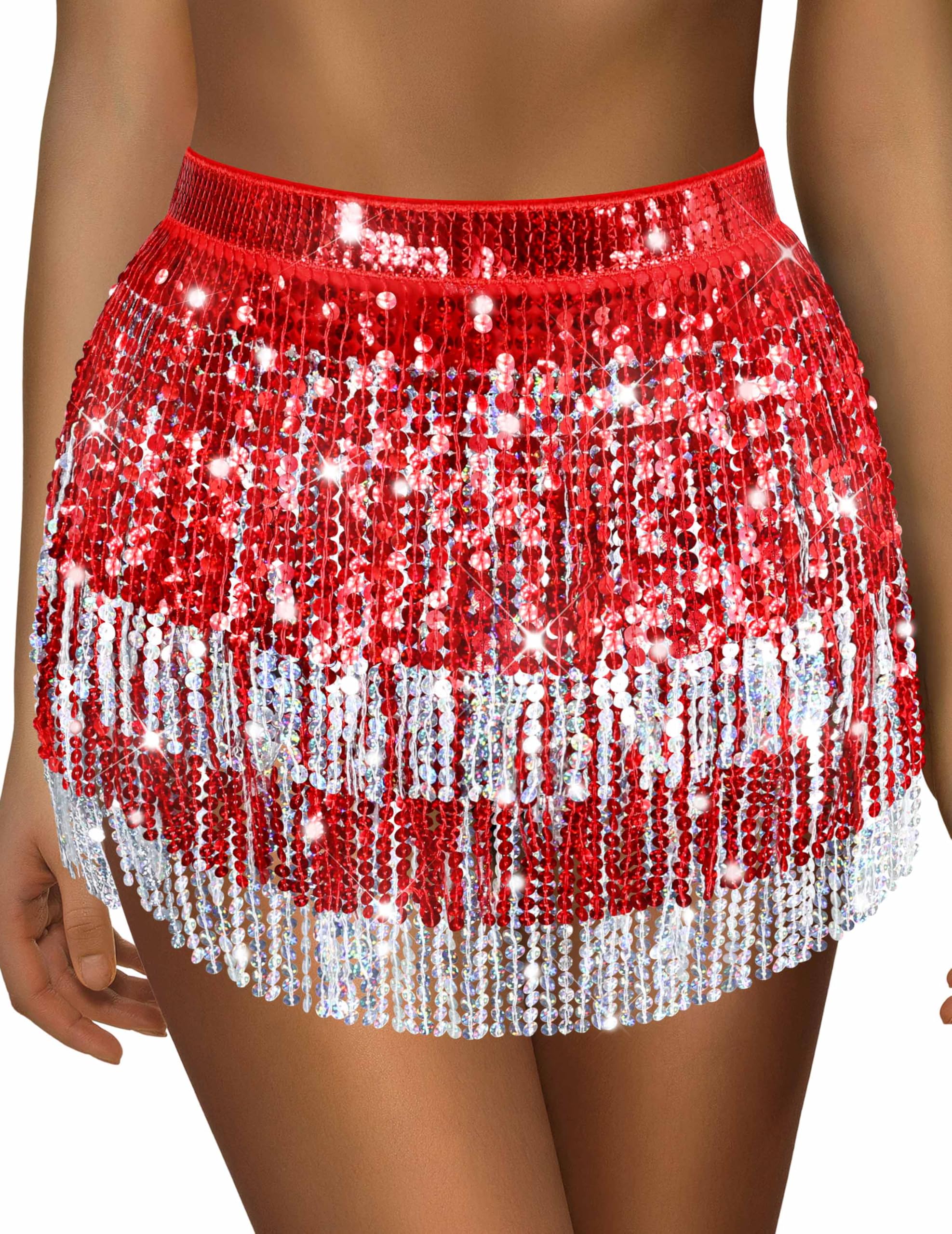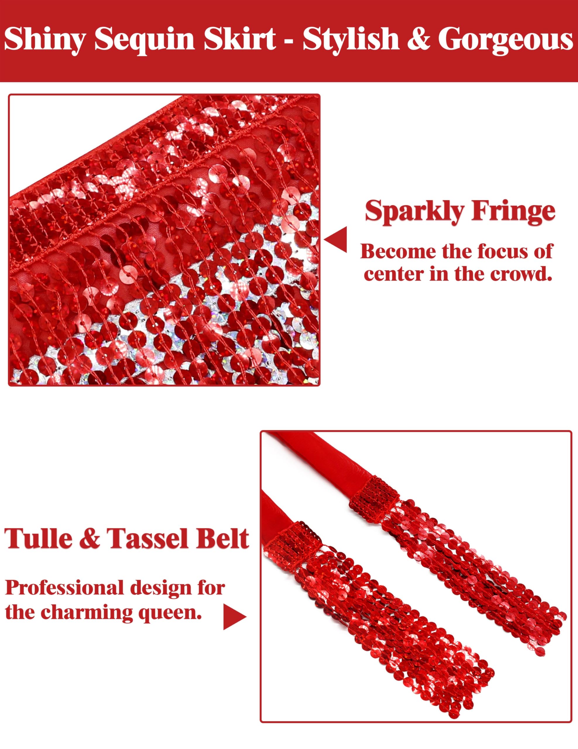 GORGEOUS SEQUINED FRINGE: The belly dance skirt with four-layered sequins and fringes is shinier and more gorgeous, which makes you more acctractive. What's more, the tinsel skirt perfectly fits your curves and showcases your most glamorous side. When you wear this sparkle skirt, people will pay more attention to you and you will be the focus in the crowd.