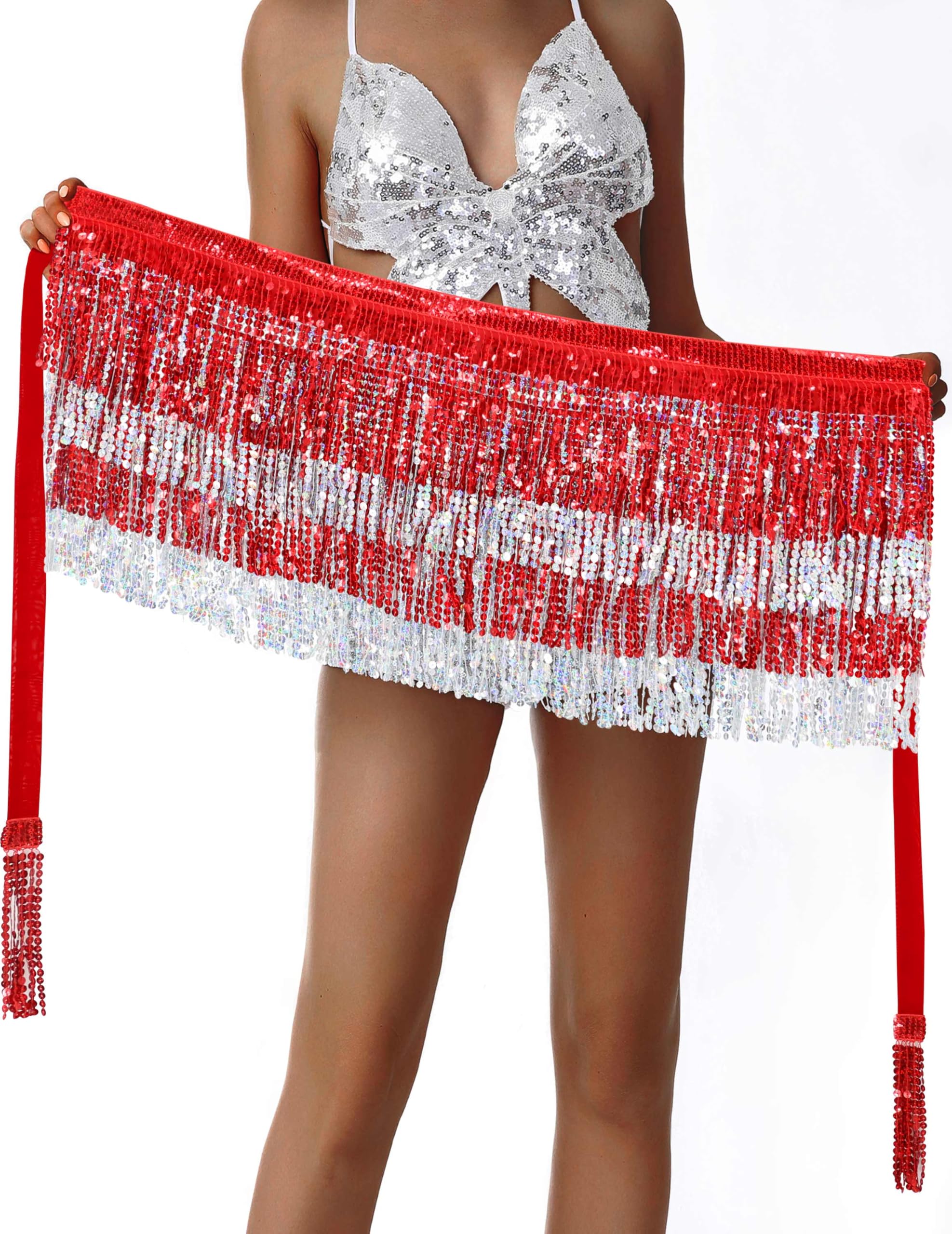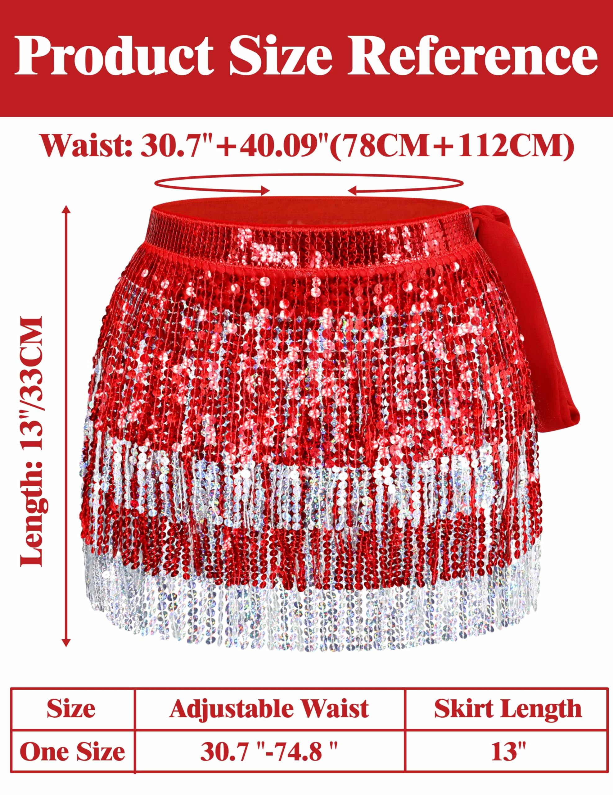ONE SIZE FITS MOST: The tassle skirt is designed of lacing belt , which allows you to adjust the length of the belt to suit your waistline. The waistline of belly dancer skirt can be adjusted approximately from 30.7'' to 74.8". The total length of the sequince skirt is 74.8''(190cm), the length of belt is 44.09''(112cm), the fringe length is 13''(33cm). It is not only durable, but also very easy to put on and take off.