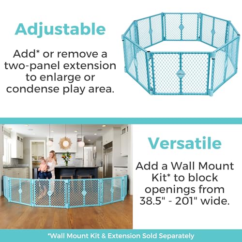 ADJUSTABLE & FLEXIBLE - Adjust our toddler playpen to fit your space. The hinges move independently for angled or straight setups. Need a bigger area? Add a 2-Panel Extension (sold separately) for 6.5 ft. corner to corner, a 34.4 sq. ft. play area.