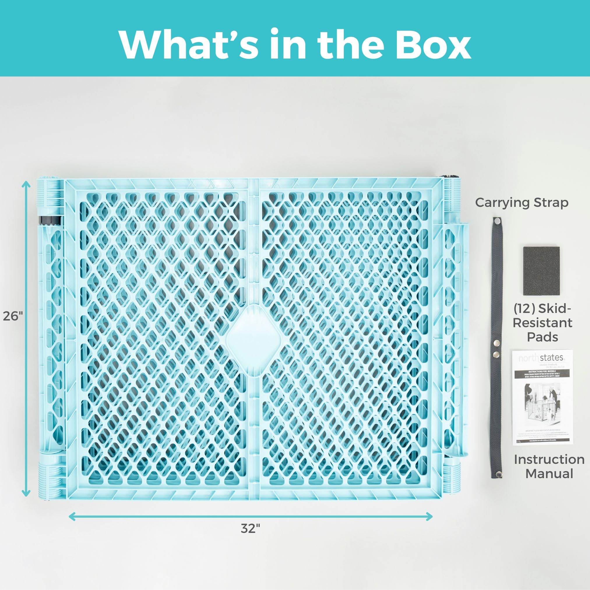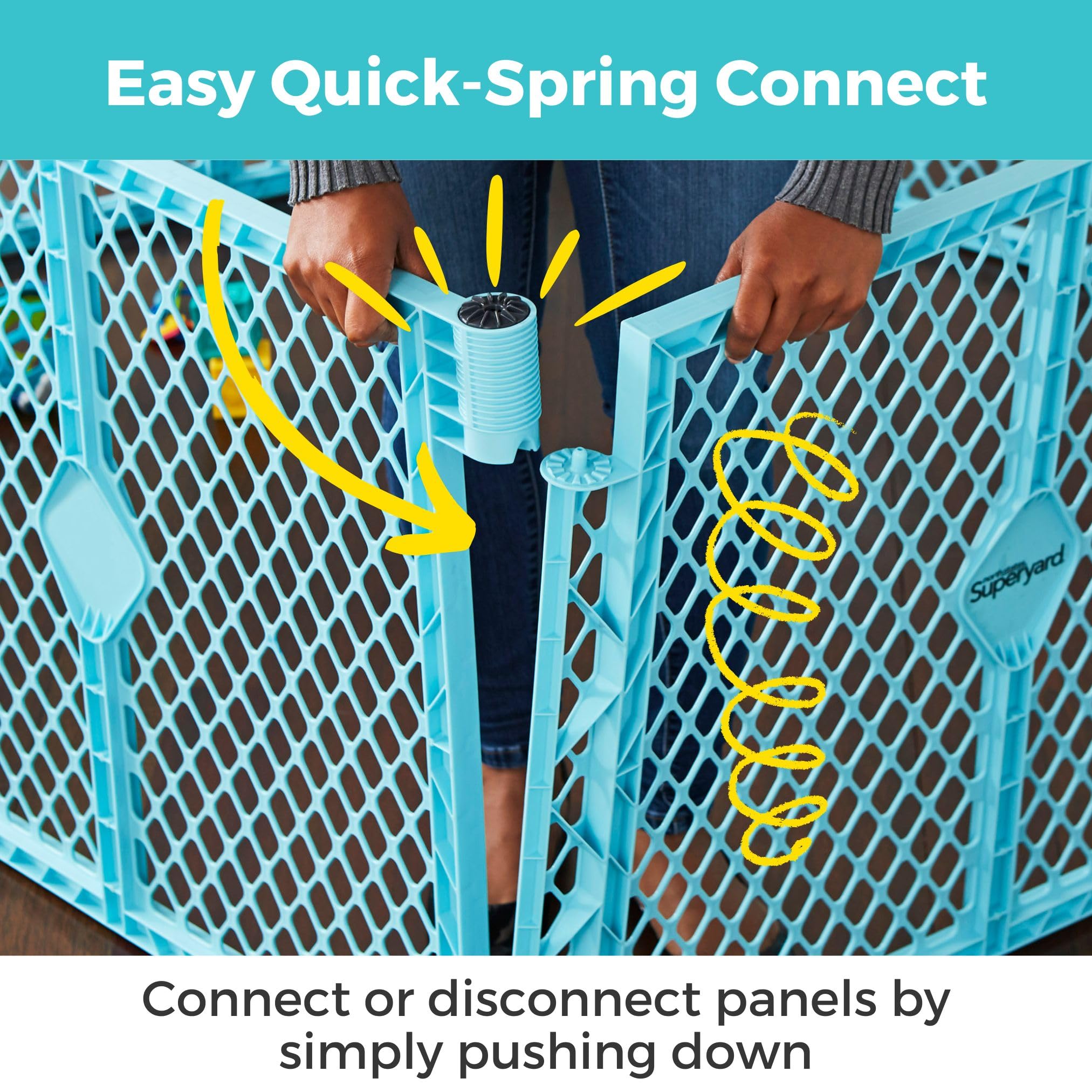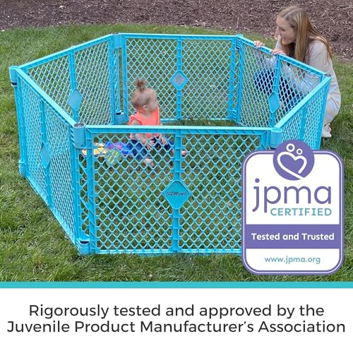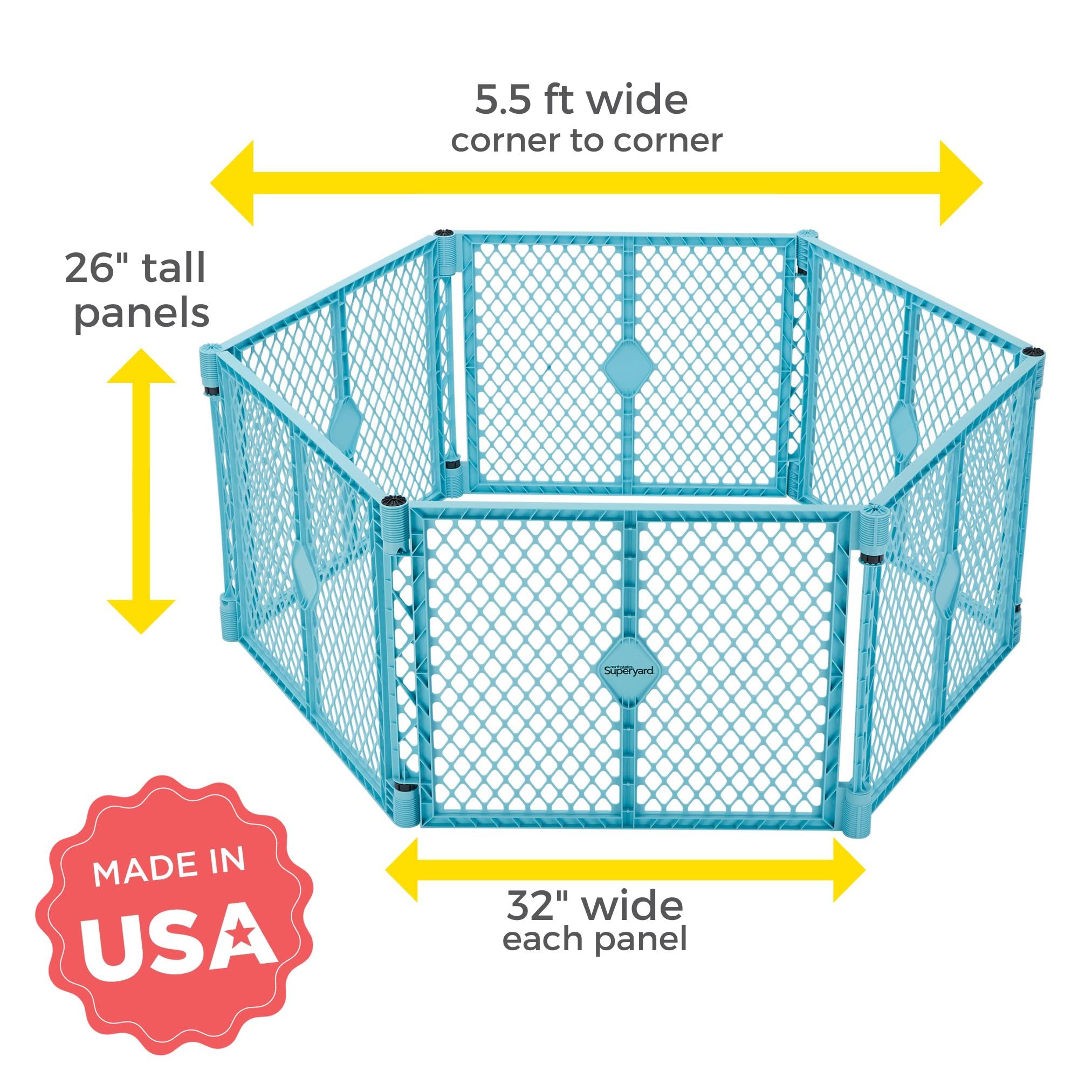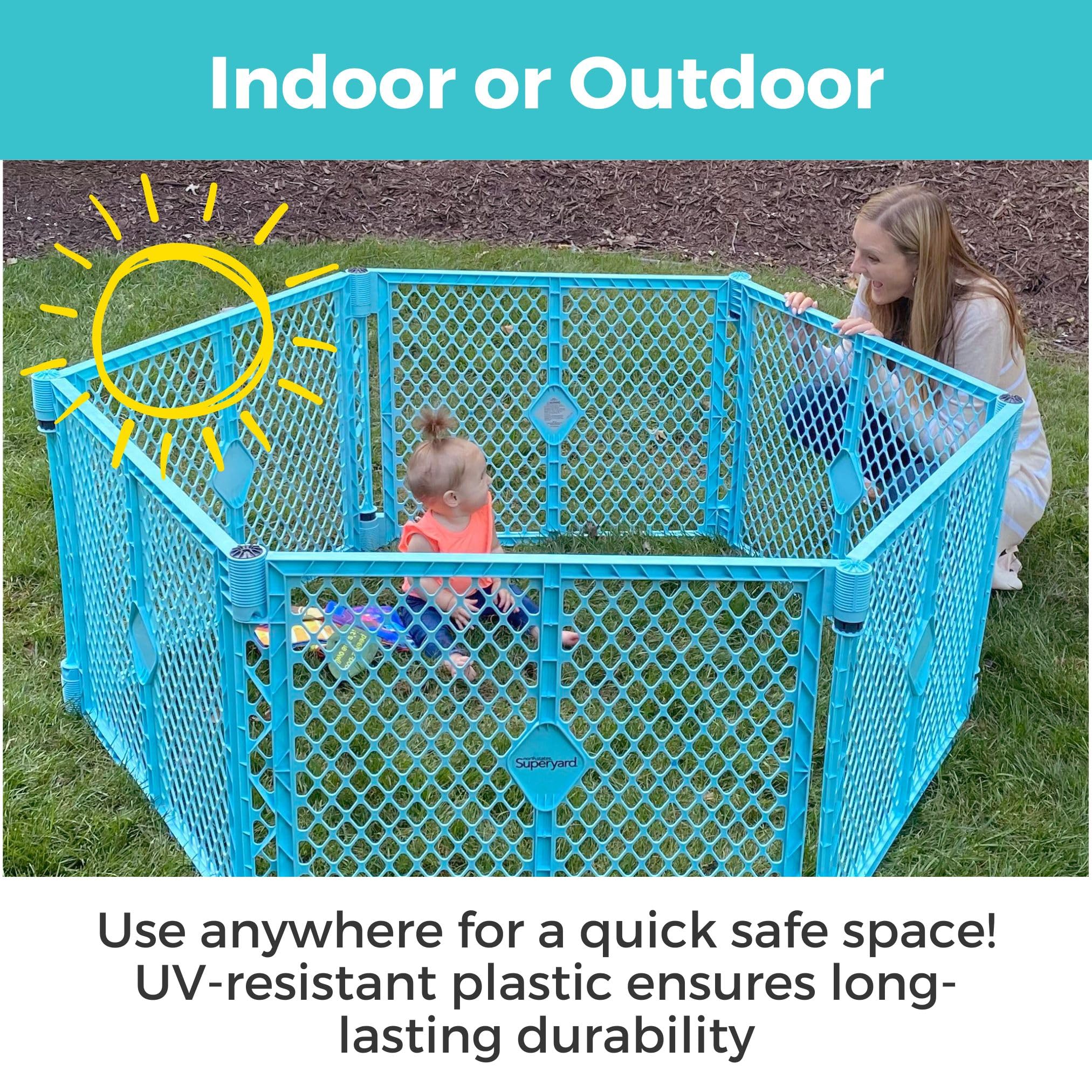 About the Superyard Baby Play Yard: Large spaces make it even tougher to keep tabs on your child! Ensure he or she is safe and secure with our baby playpen designed for indoor or outdoor use. The UV-resistant design keeps colors vibrant and ensures long-lasting durability. The 6-panel play yard encloses up to 18.5 sq. ft. and is 26 in. tall. The 6 pre-connected panels come ready to go, simply unfold and connect the ends together. Our portable baby fence folds quickly and includes a carry strap for easy transport. This baby barrier features SuperGrip feet and skid-resistant pads to prevent movement and protect hardwood floors. The plastic play pen has self-locking hinges that only bend in one direction. The clicking noise ensures the hinges are locked. For added home safety convenience, the play yard can be converted into an extra-wide baby gate using our Superyard Wall Mount Kit (sold separately). Every Toddleroo by North States play yard is JPMA and ASTM certified. Our plastic gates and plastic play yards are made of non-toxic polypropylene and pigments that contain no heavy metals (no lead), no Phthalates or PVCs, and are BPA free. Proudly made in the USA. About Toddleroo by North States: We pride ourselves on U.S. manufacturing because it allows us to maintain the highest standard of quality control. Since 1953, our products have been built by skilled craftsmen and women who are dedicated to making the finest products in America. Our innovative, superior-quality products are designed to achieve the highest standards in safety, durability, and ease of use. You’ll always find us ahead of the curve and on the cutting edge of the industry.
