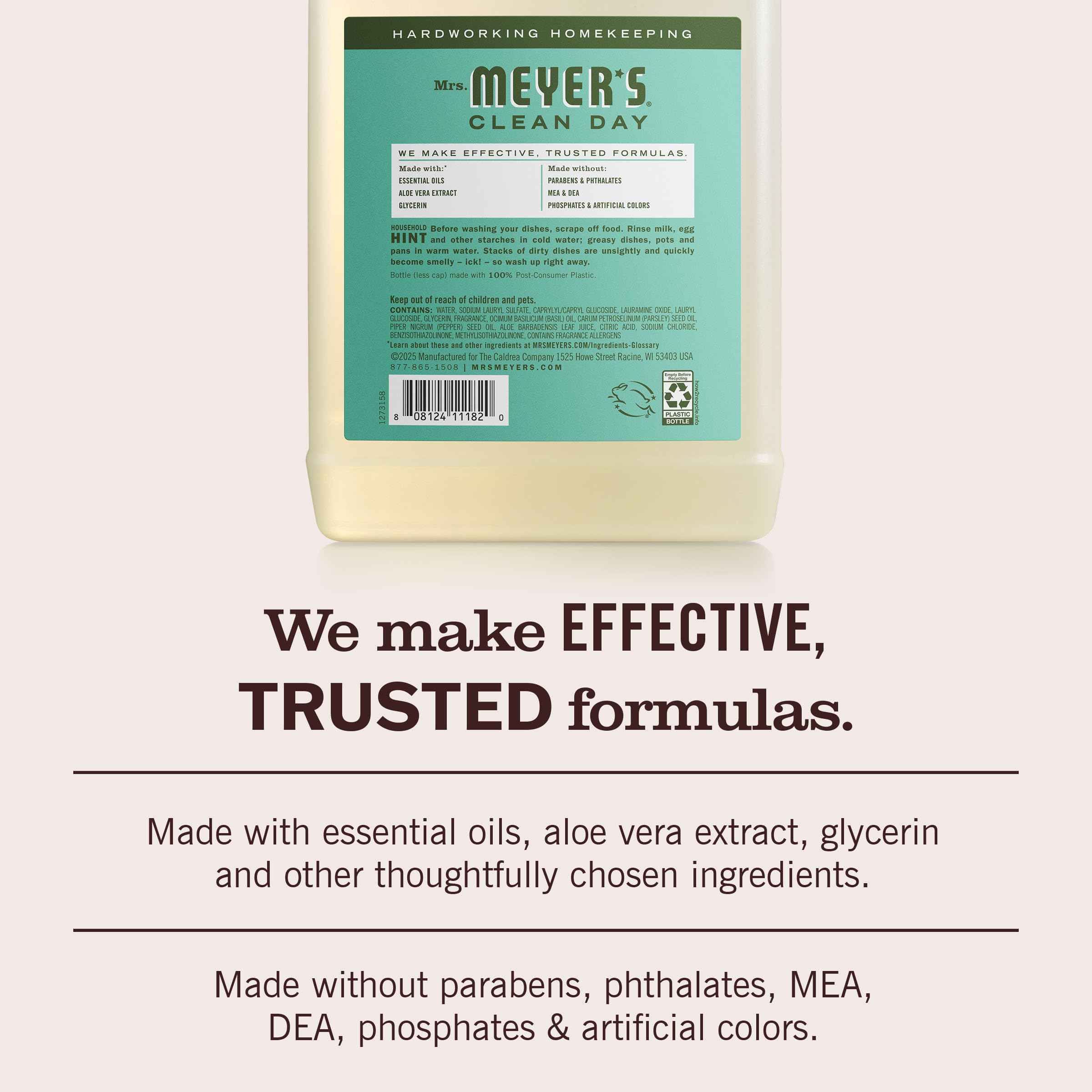Mrs. Meyer's Clean Day liquid dish soaps are specifically made to make grease disappear, while also providing a special, singular scent for your home. The Basil scented liquid dish soap has a cool, crisp scent that is uplifting & grounding, familiar & exotic - all at one time. Such an inviting herbal smell, the garden's friendly boost of green. Our biodegradable formula dish liquid cuts through grease and is designed for hand washing dishes, pots, and pans. The liquid dish detergent contains plant-derived cleaning agents and other thoughtfully chosen ingredients that make dishes clean and bright. It's a Dish Soap made without parabens, phthalates, or animal-derived ingredients. And of course, this is a cruelty-free formula product. Also available in other garden-inspired scents and products such as Hand Soap and Multi-Surface Cleaner. Mrs. Meyer's - Rooted in Goodness.