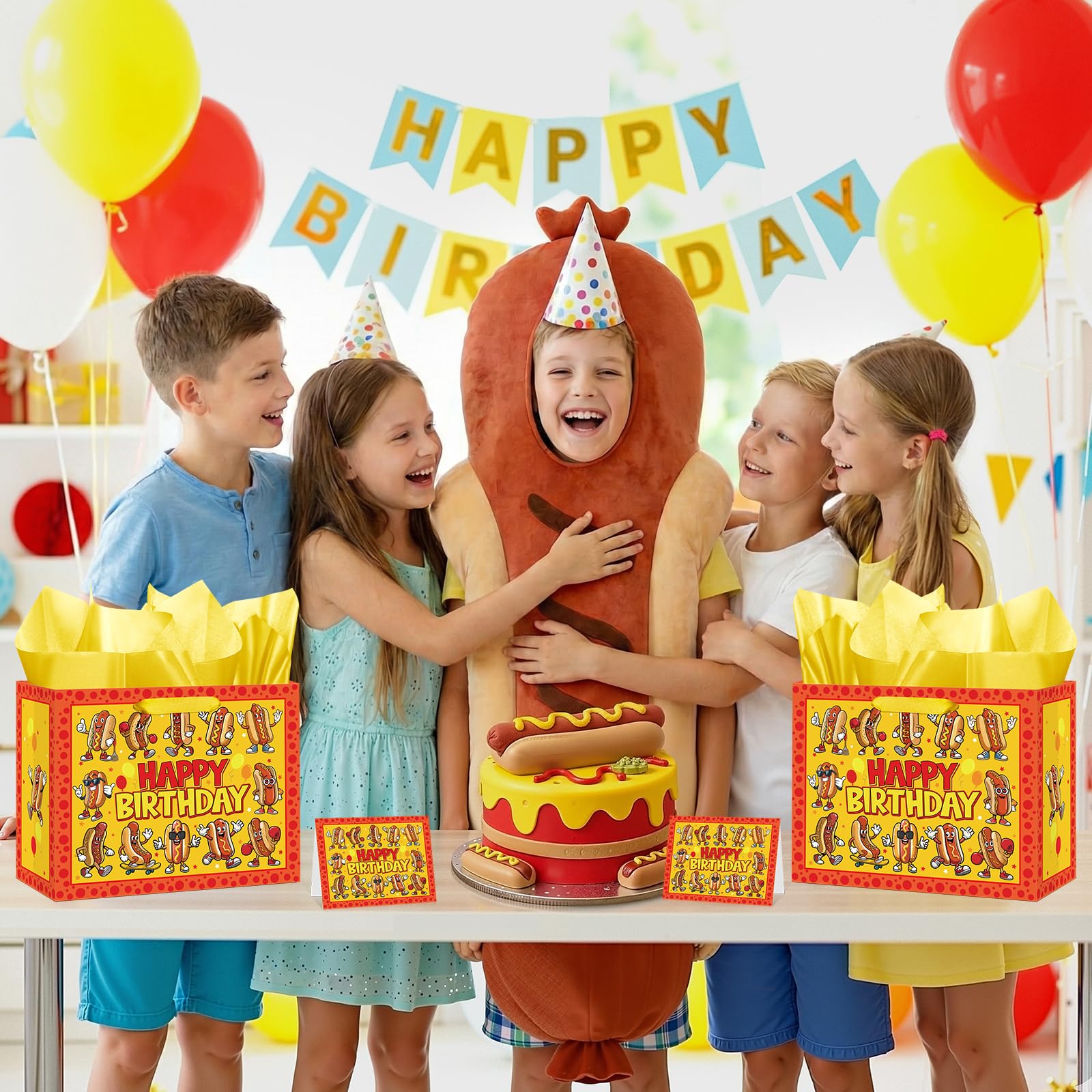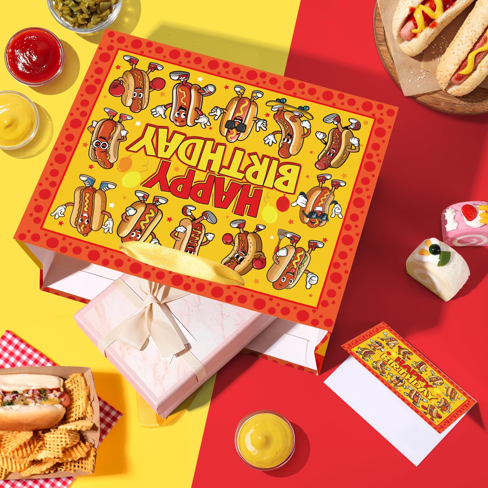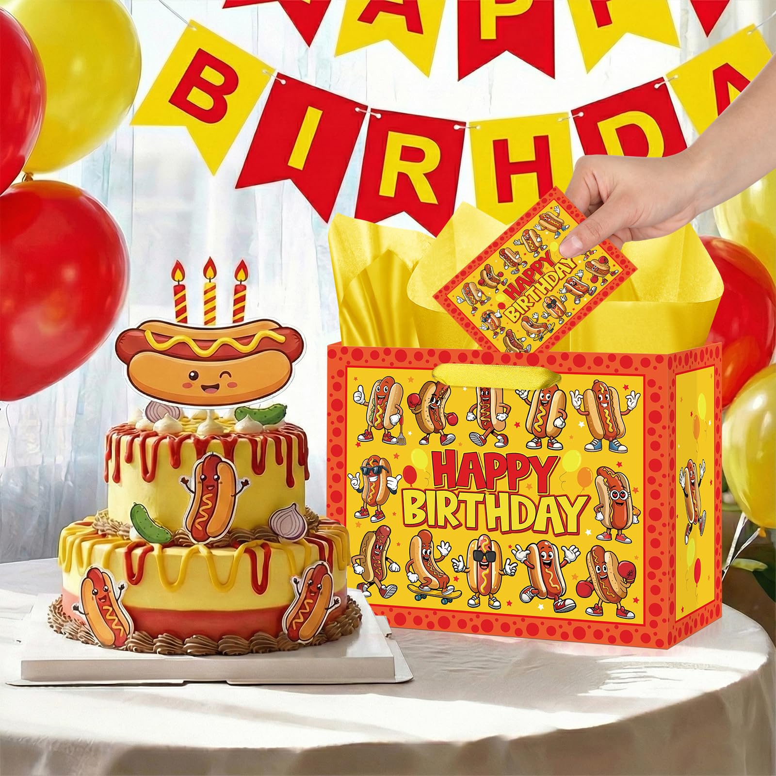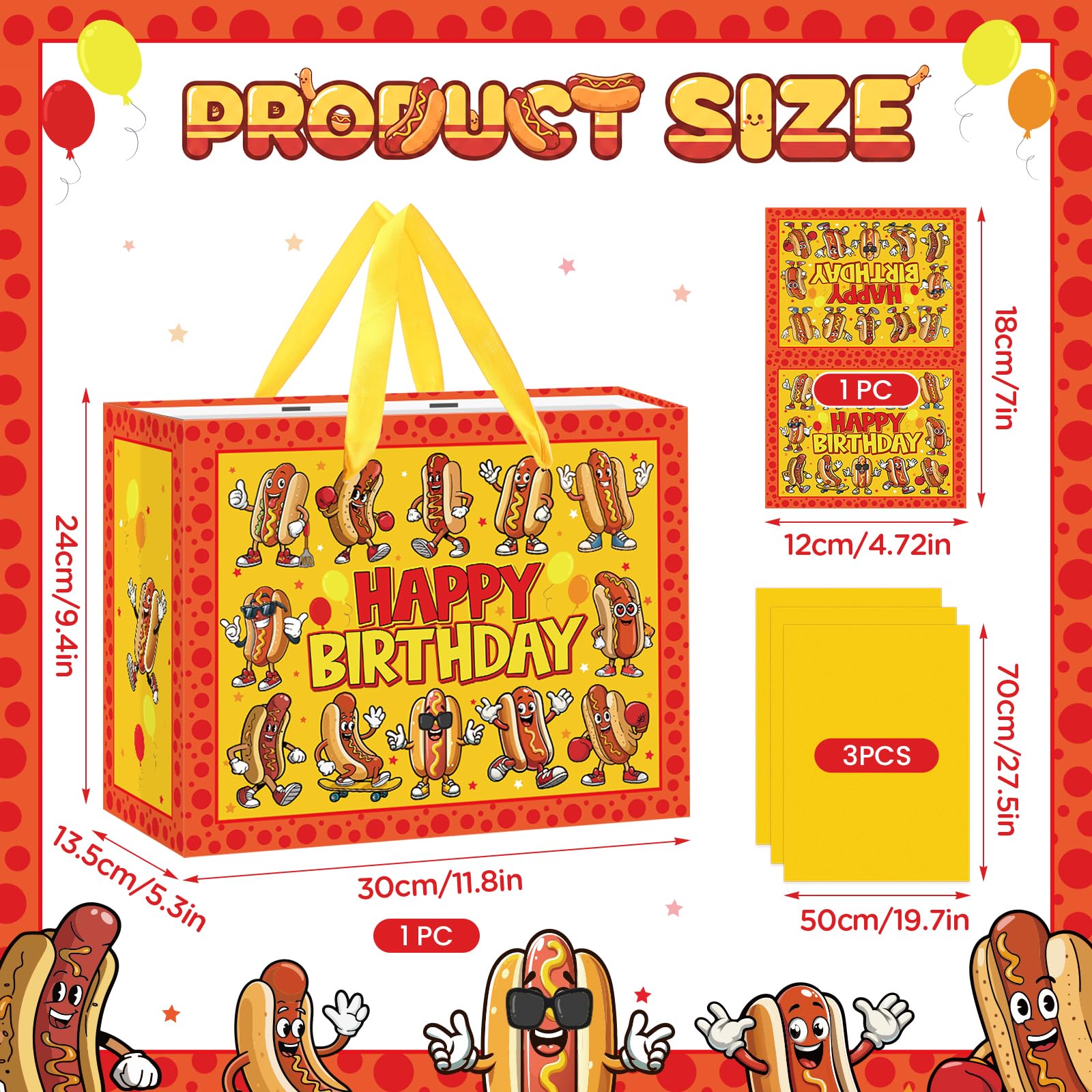 Suitable Size: The size of the hot dog party favors bag is 11.8 x 9.4 x 5.3 inches, which is big enough to store drinks, hot dog themed gifts, chocolate, candies, cakes, snacks, etc. The yellow hot dog tissue paper measures 19.7 x 27.6 inches, which can wrap most bagged items, and the hot dog birthday card measures 4.72 x 7.09 inches