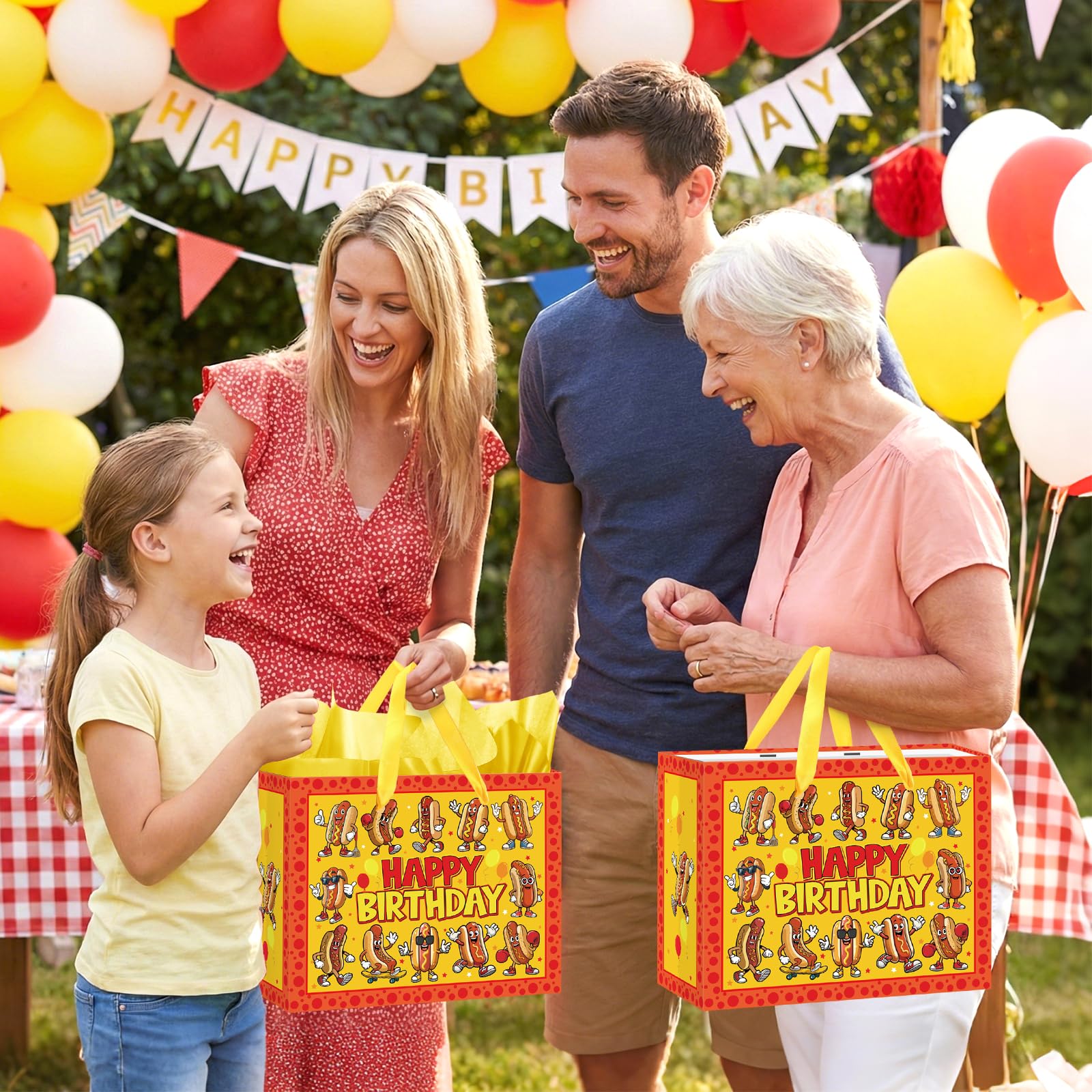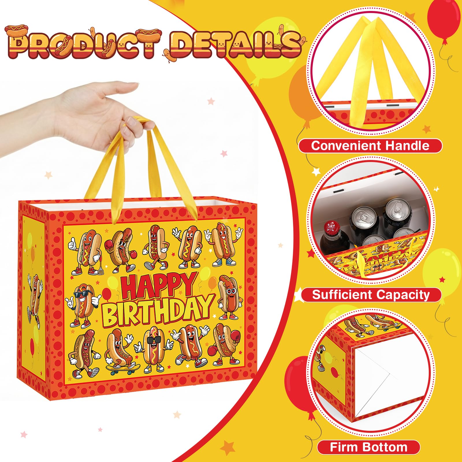 Package Includes: You will get 1 piece of cute hot dog birthday gift bag with handle, 1 piece hot dog birthday greeting card and 3 pieces yellow tissue paper; and you can write your blessings on a blank hot dog birthday card, then wrap the present in tissue paper and place it into our BBQ party gift bag