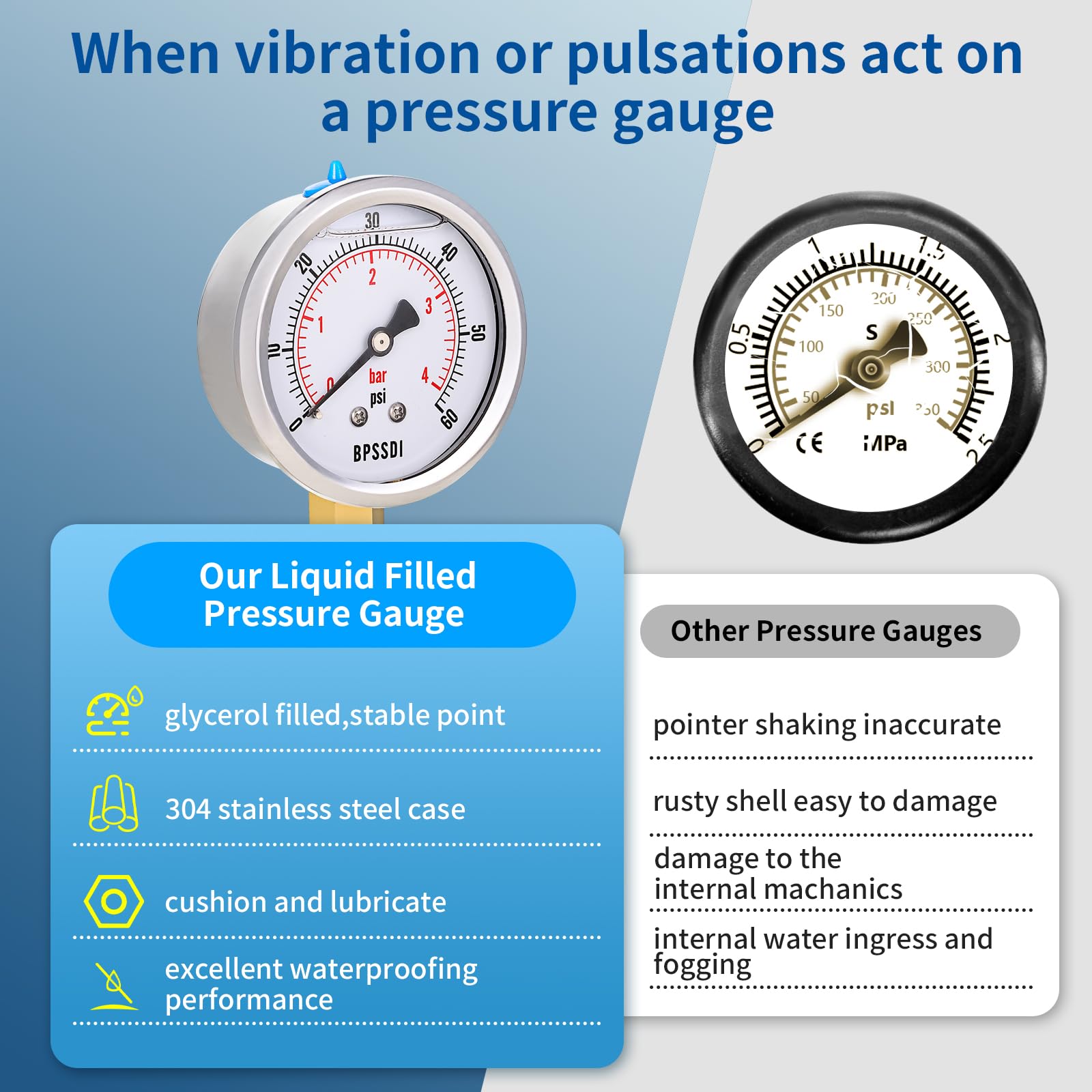 Glycerin Filled - Inhibits pointer flutter and prevents damage to the internal mechanics from vibration and pulsation.