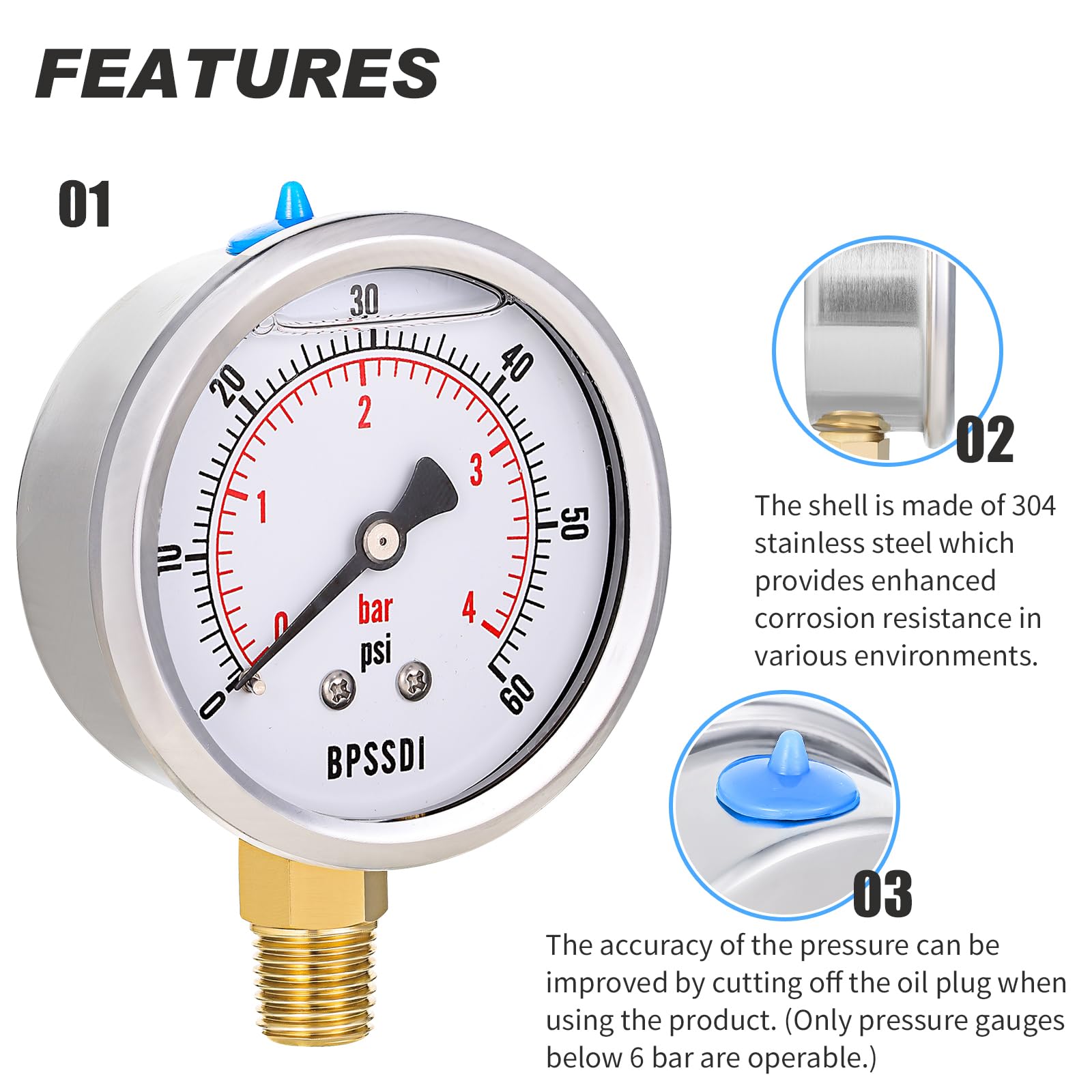 Dual Scale Display - The 2.5" pressure gauge dial is in Psi/Bar with 2.5% accuracy rating for a variety of pressure tests.