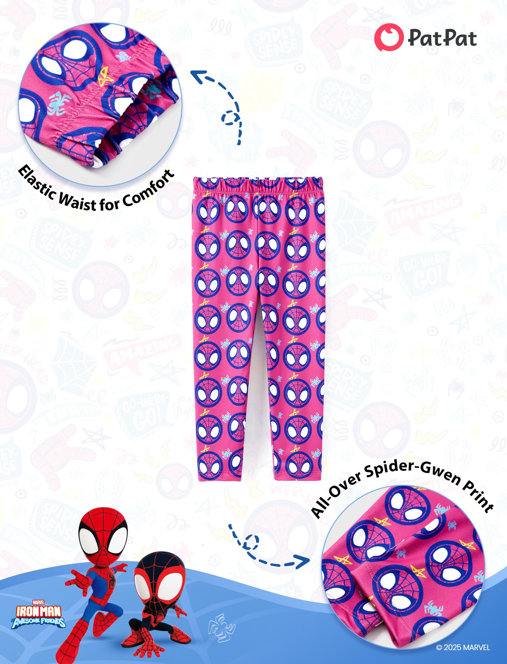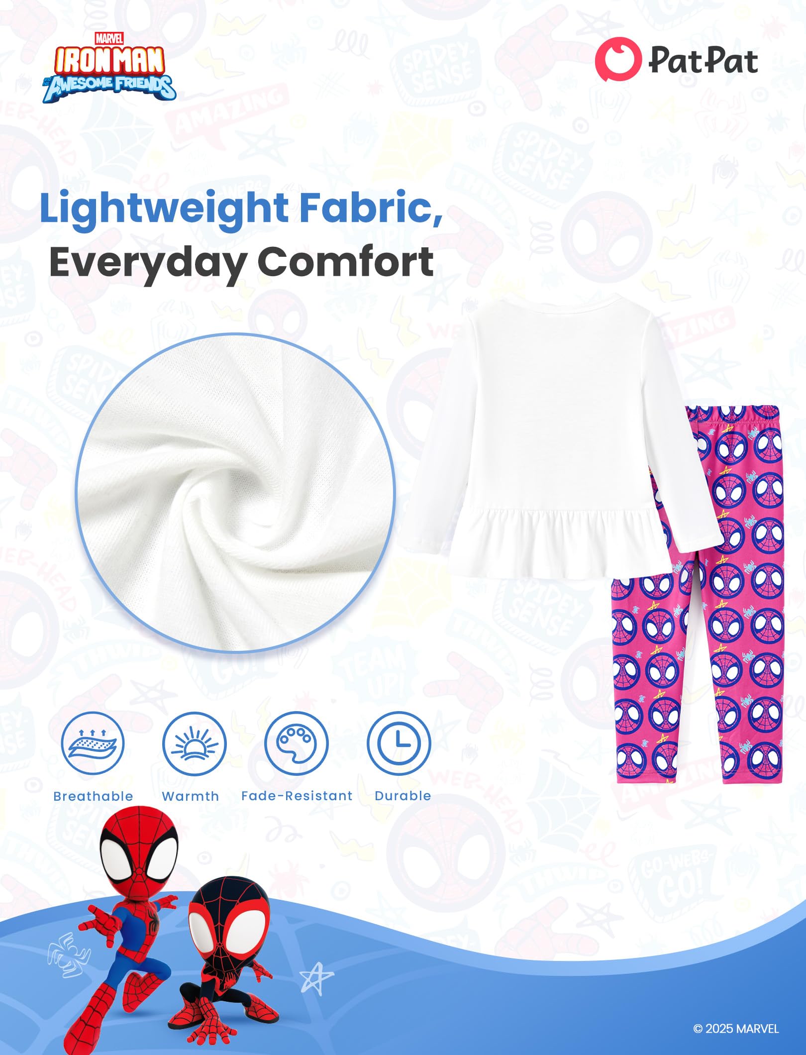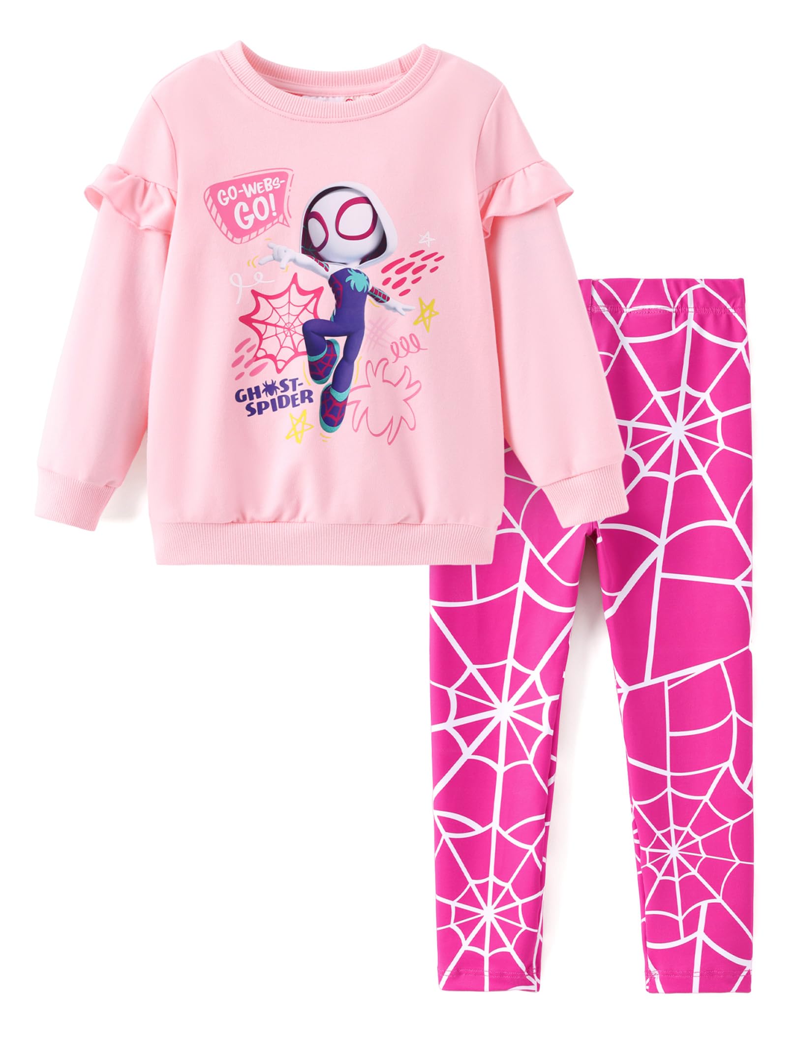 Heroic & Playful Design: Features a ruffle-hem shirt with Ghost-Spider in comic style, paired with purple leggings printed with mini Ghost-Spider faces. Cute, bold, and photo-ready. This two-piece girls sweat set highlights her love for superheroes in a playful way