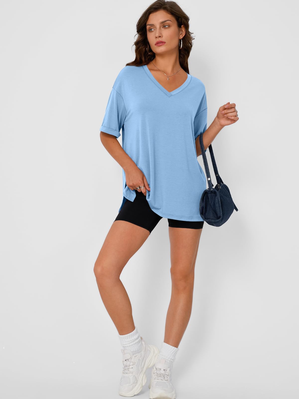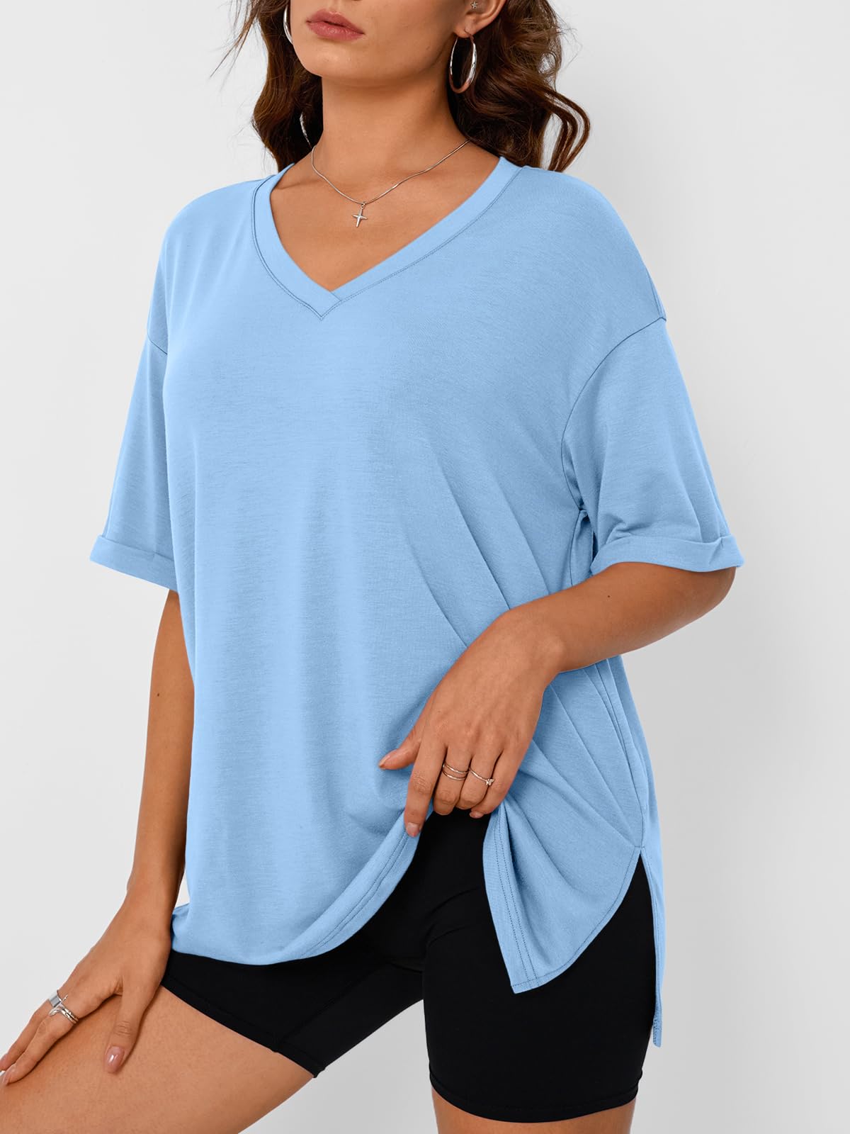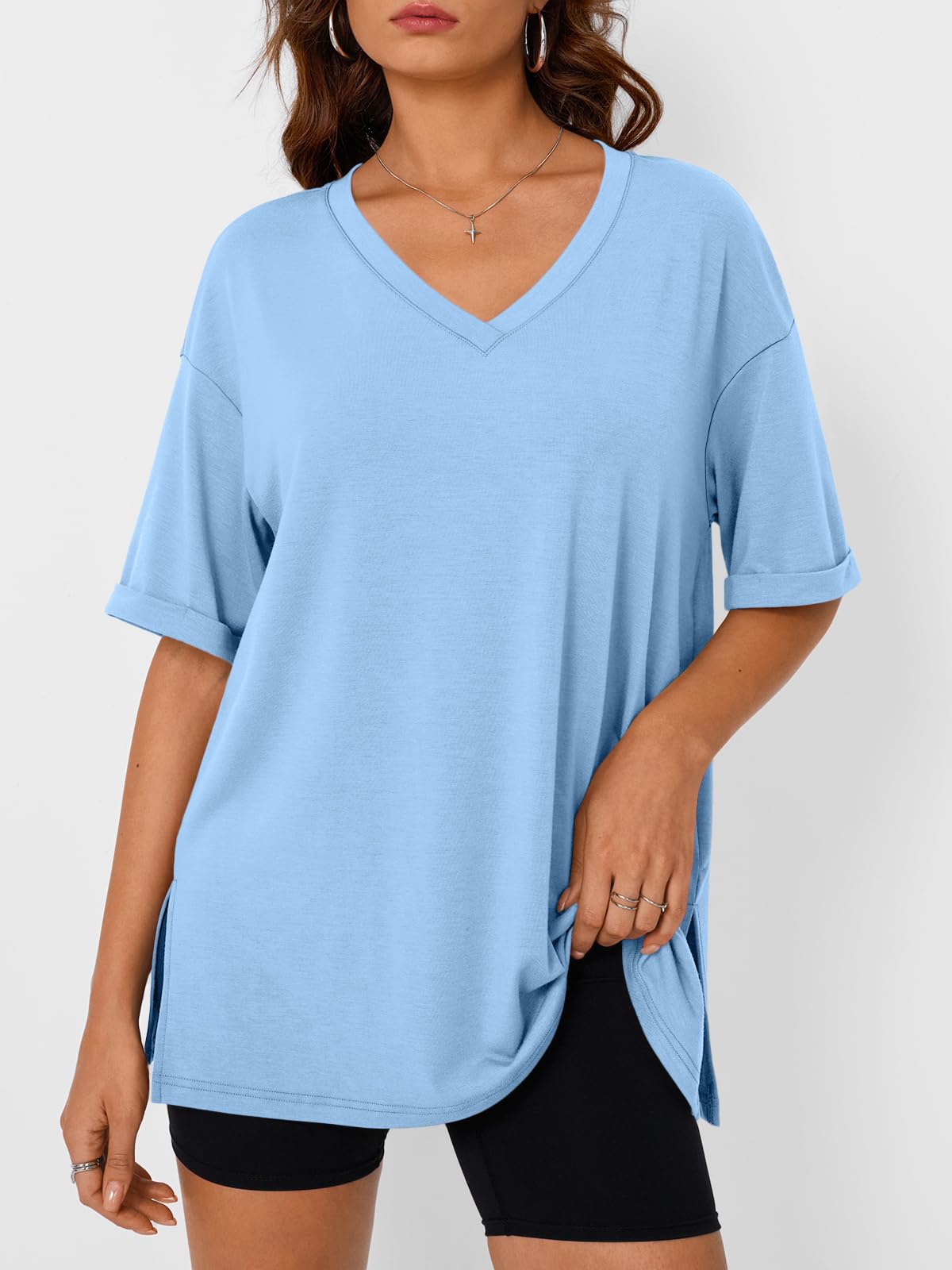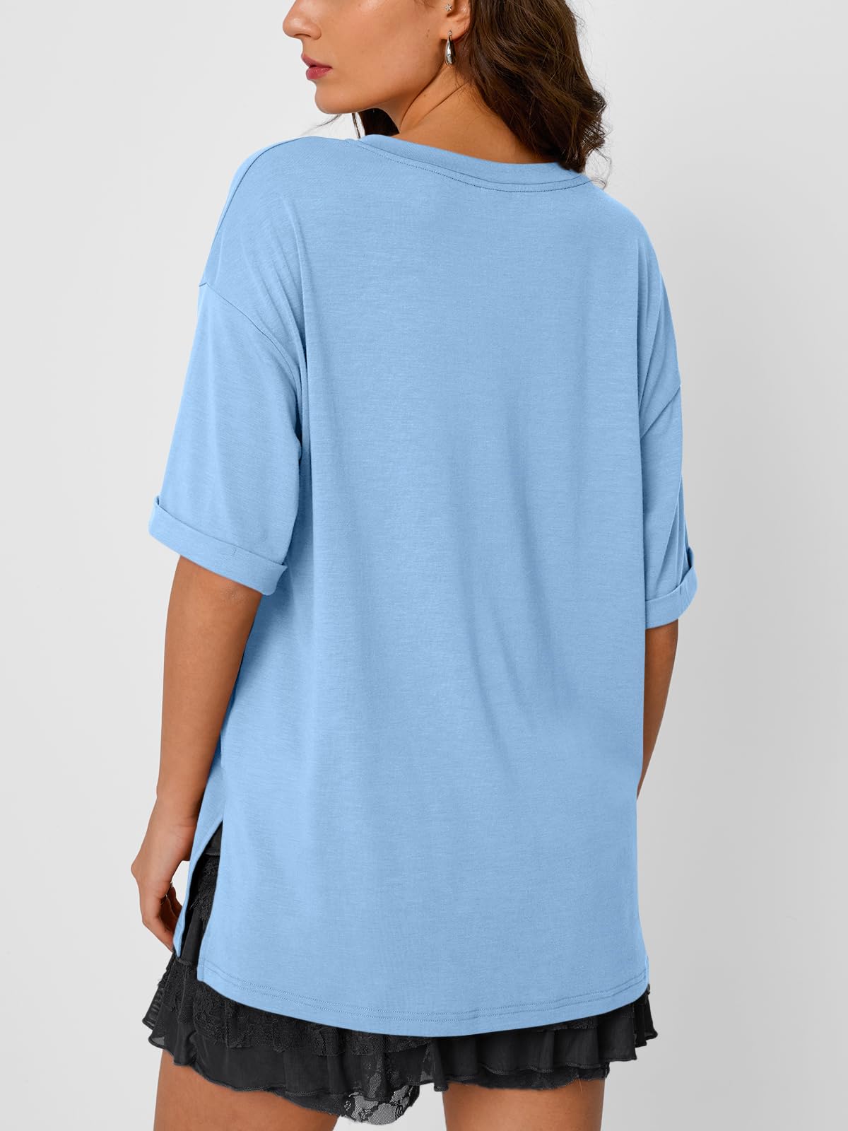 Design: Oversized tshirts for women, with loose fit design, v-neck, short sleeve, simple solid color style, with drop shoulder sleeves, fashionable and classic, casual style, suitable for spring and summer.