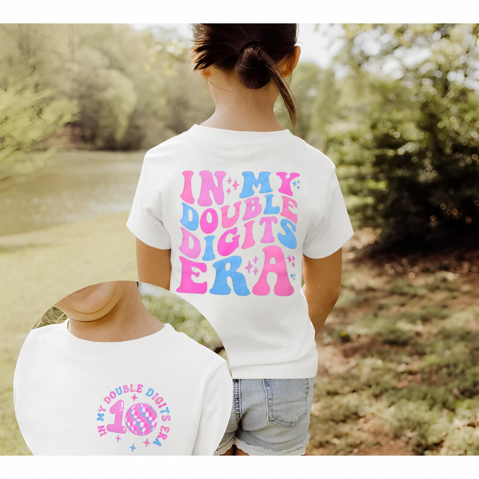 ใDesignใIn my double digits era 10th birthday version colorful groovy retro double-sided printing design, funny birthday gifts for 10 year old girls, makes the perfect 10th bday gift idea for kids. Girls ten b-day party tee tops, age 10 girls short sleeve summer clothes.