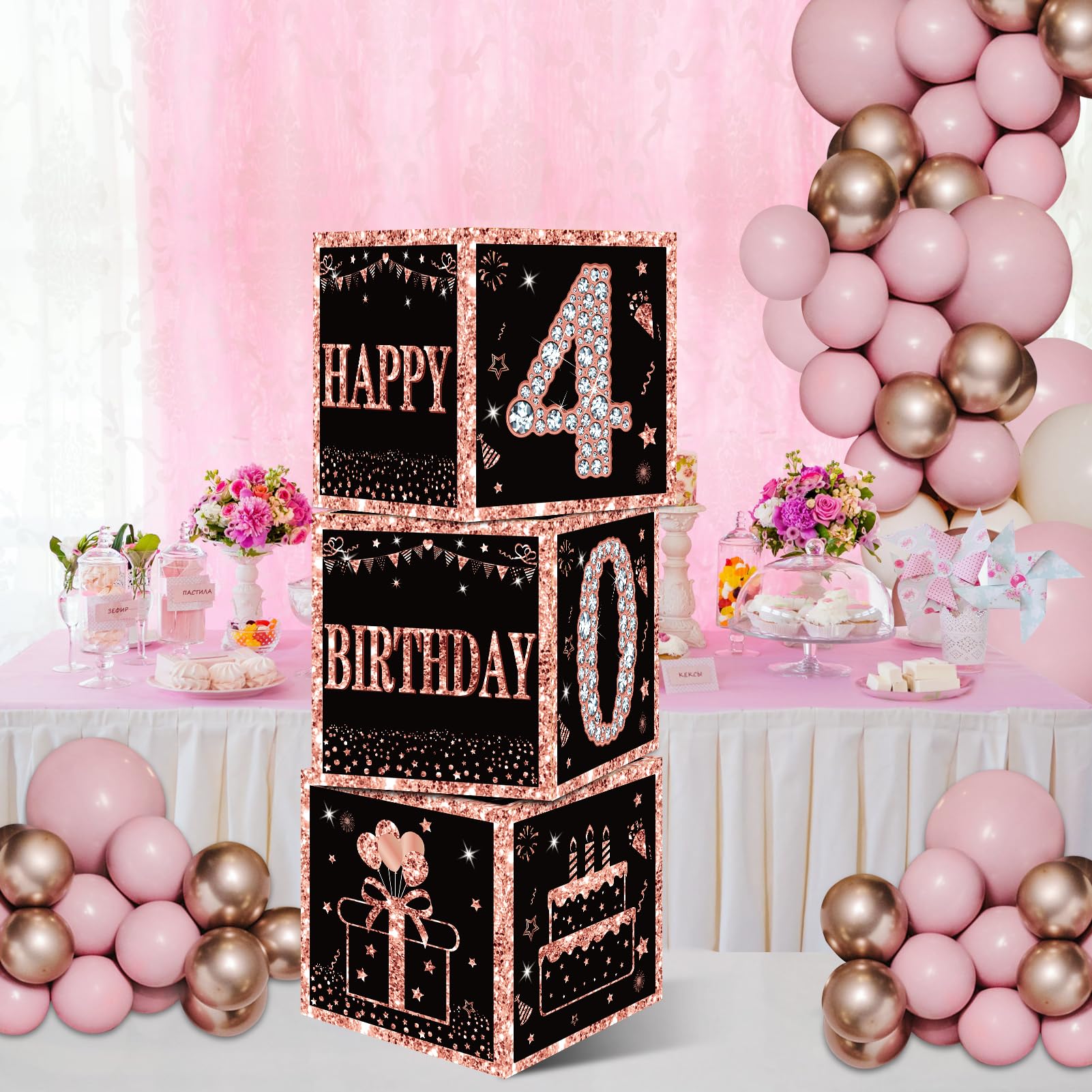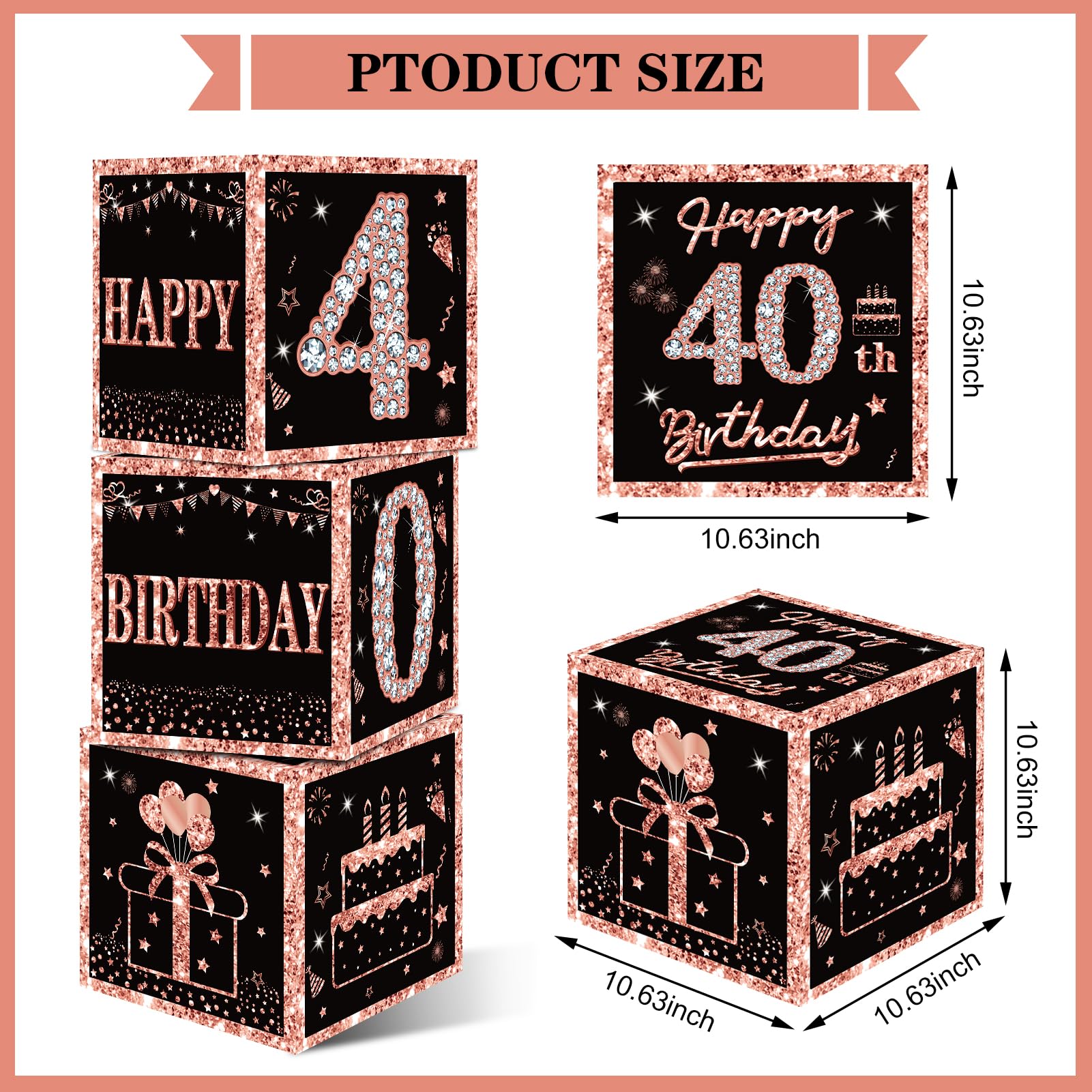 [You Will Receive] -3pcs rose gold 40th birthday balloon boxes decorations, the size of each box is 10.62×10.62×10.62inch. This set of great 40th birthday party display decorations. (Note: This set of decorations does not include balloons).