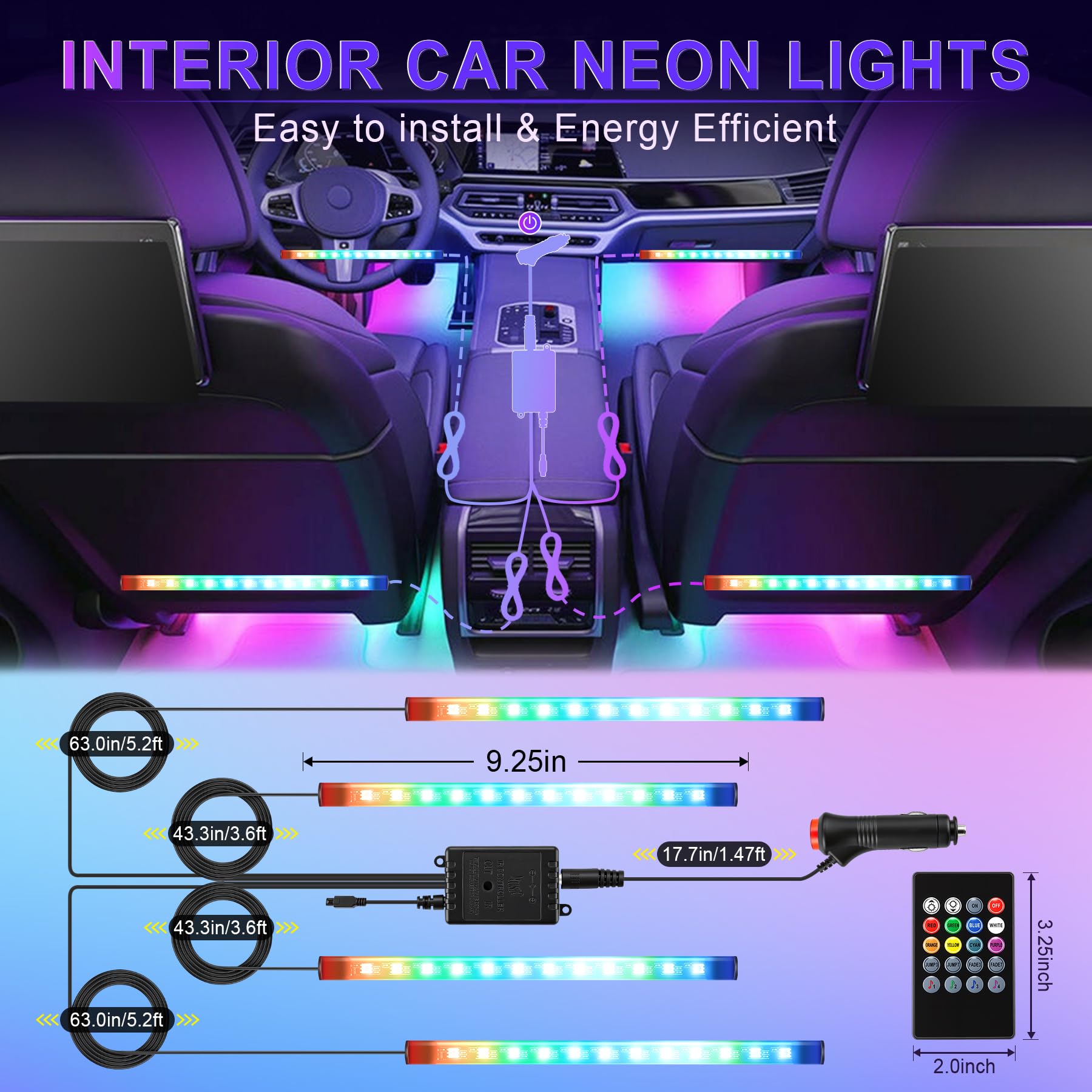 Easy Installation& Double Sticky: Just Plug and play. Peel off the double-sided tape and paste the car led light strips under the seats or in the footwell area. Finally press on the cigarette lighter switch, then begin to enjoy the colorful lights.