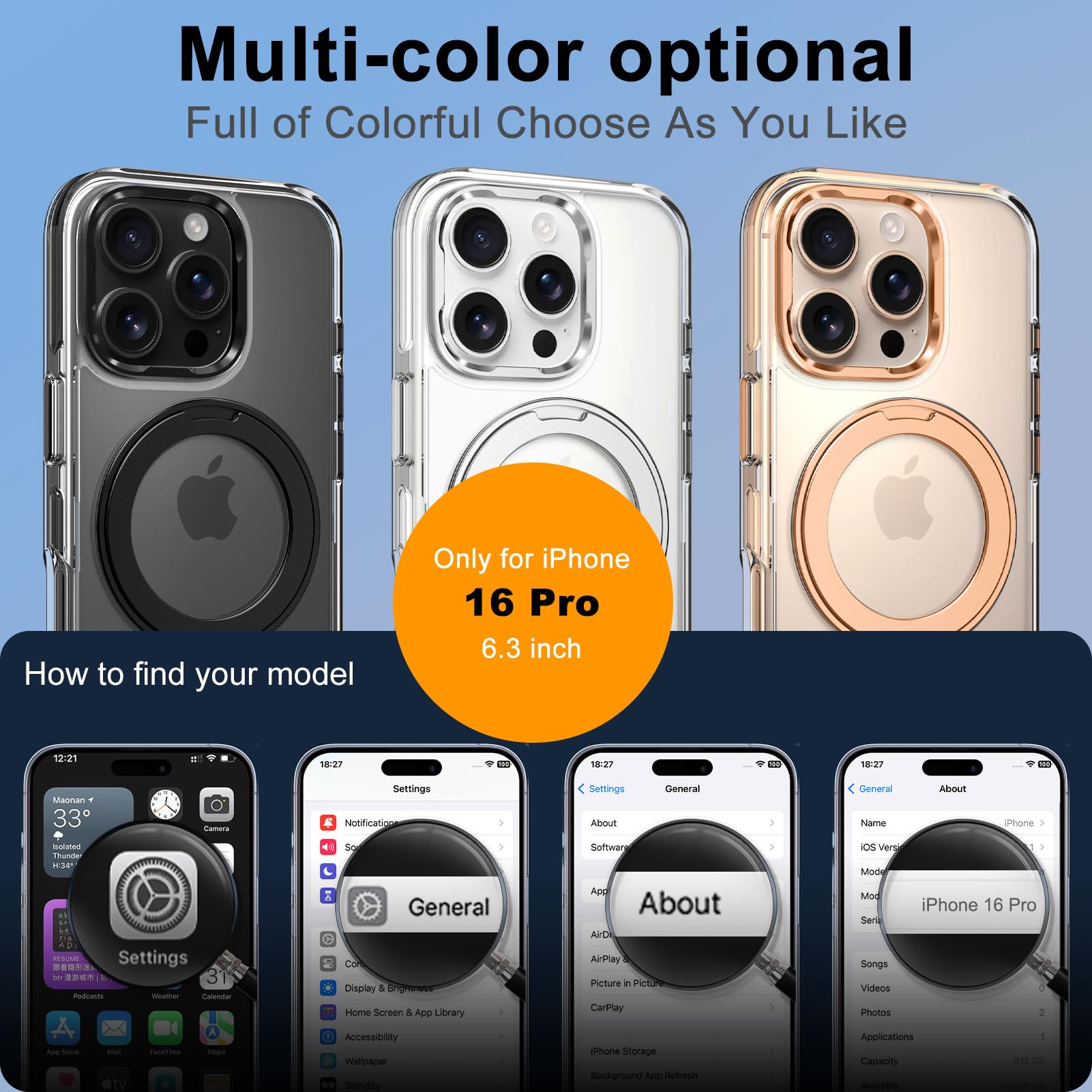 ONLY Compatible with iPhone 16 Pro Case: The clear phone case with ring stand of this page is ONLY design for 6.3 inch iPhone 16 Pro,please select the right model option you need before purchasing, thank you