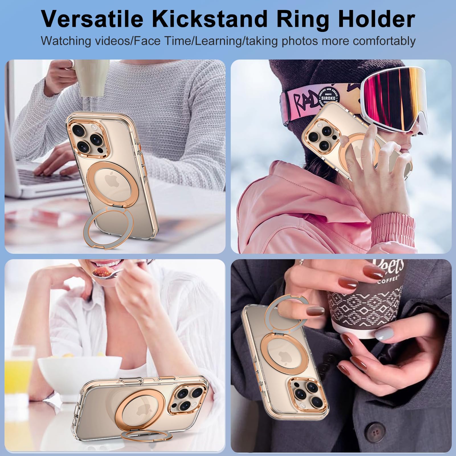 360 Degree Rotating Ring Stand: This clear magnetic iPhone case comes with a 360° aluminum alloy rotating stand on the back, which can be stabilized on a flat surface. You can adjust the tilt of the stand as you like to free your hand and bring you a better viewing experience