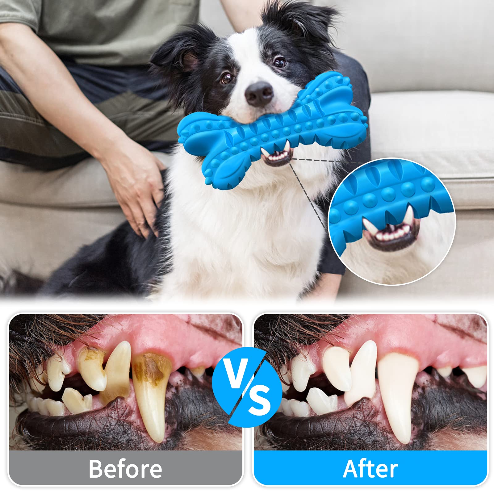 SAFE DOG TEETH CLEANING TOY: Natural rubber dog toy with light milk coconut scent have different shapes for multifunction, deep sawtooth outline are matching for shape of teeth, add with toothpaste to achieve effective teeth cleaning. Dots around help to gently massage gums, great designs to relieve discomfort during teething for puppies as puppy teething toys. Dog toothbrush toy without any sharp edges would not harm delicate oral skin, protect their oral health, cultivate proper chewing habits