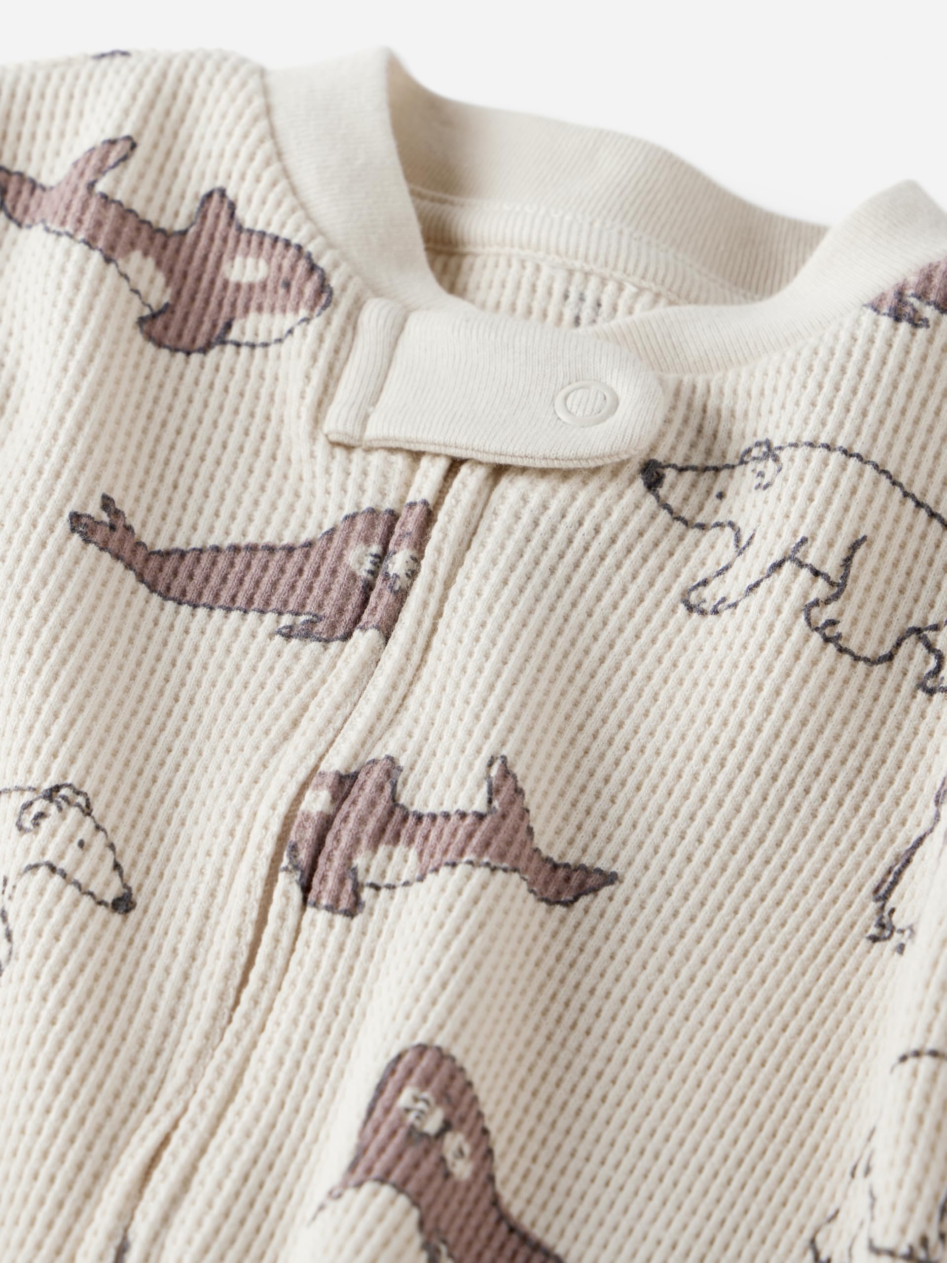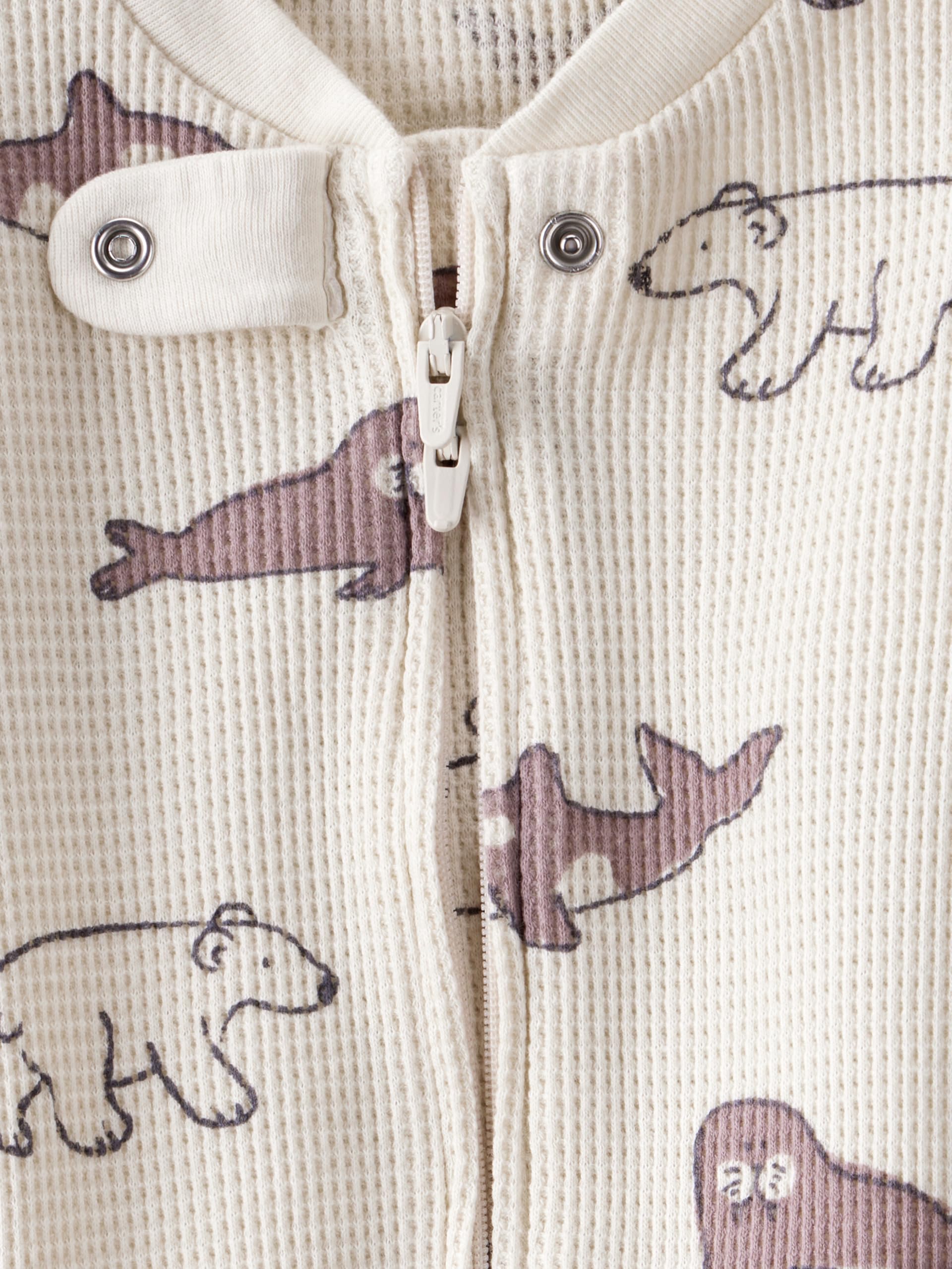 Description Cuddle baby up in this soft, certified organic cotton sleep & play. Made for daily adventures in tummy time, nap time and beyond, this piece is blooming with thoughtful details like a 2-way zipper to keep baby's arms & torso warm during diaper changes, plus built-in footies to keep tiny toes cozy. In our exclusive print, this one piece is wildly cute!