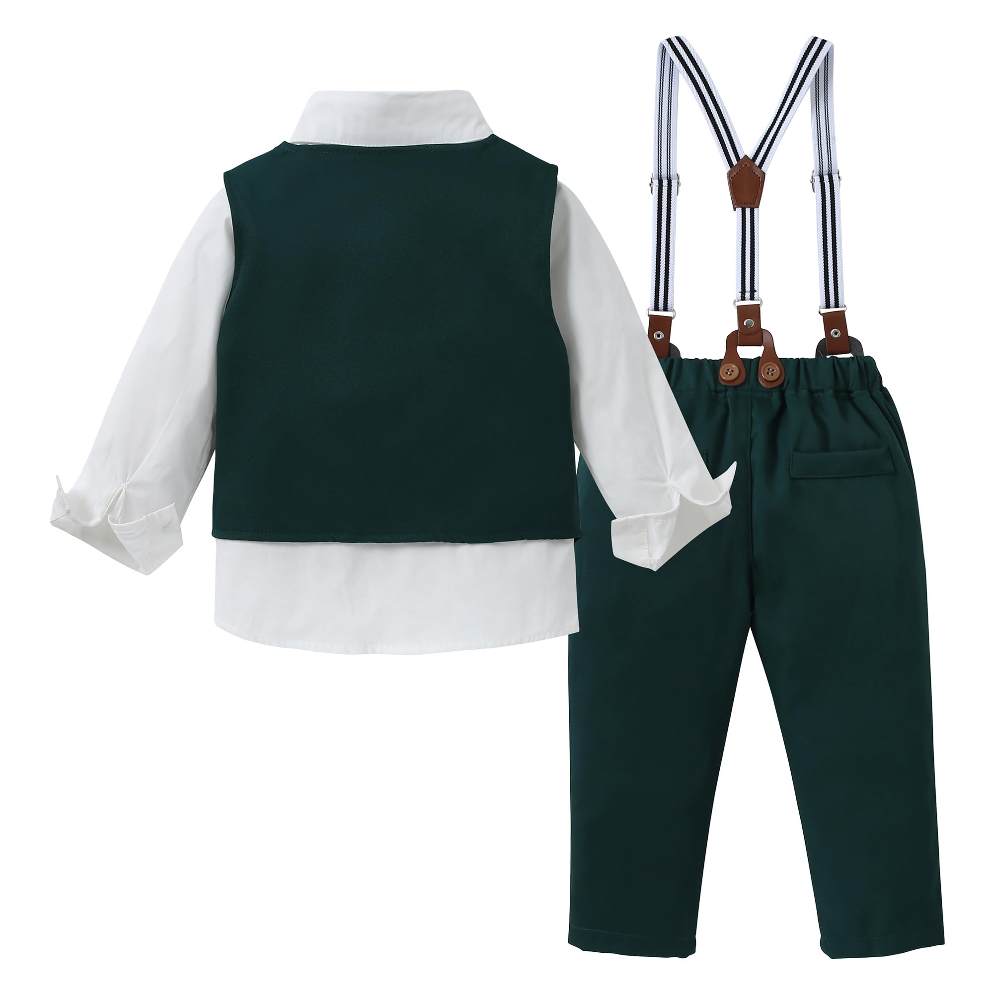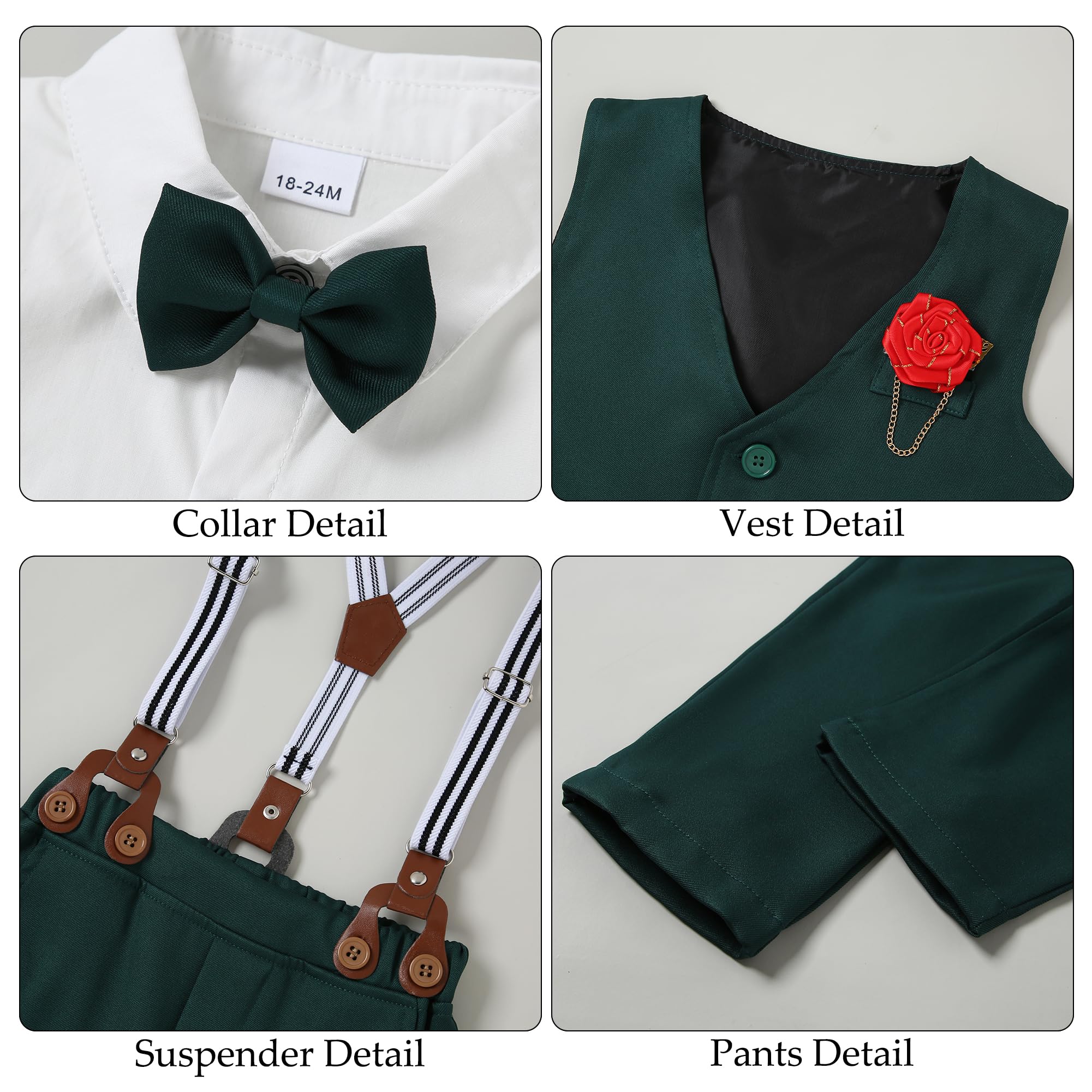 6-Pieces Formal Suit Set: This toddler suit including 1PC long sleeve dress shirt+ 1PC vest + 1PC suspender pants + 1PC detachable bow tie + 1PC elegant boutonniere.
