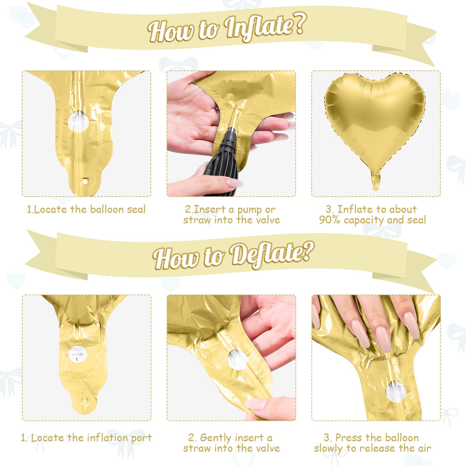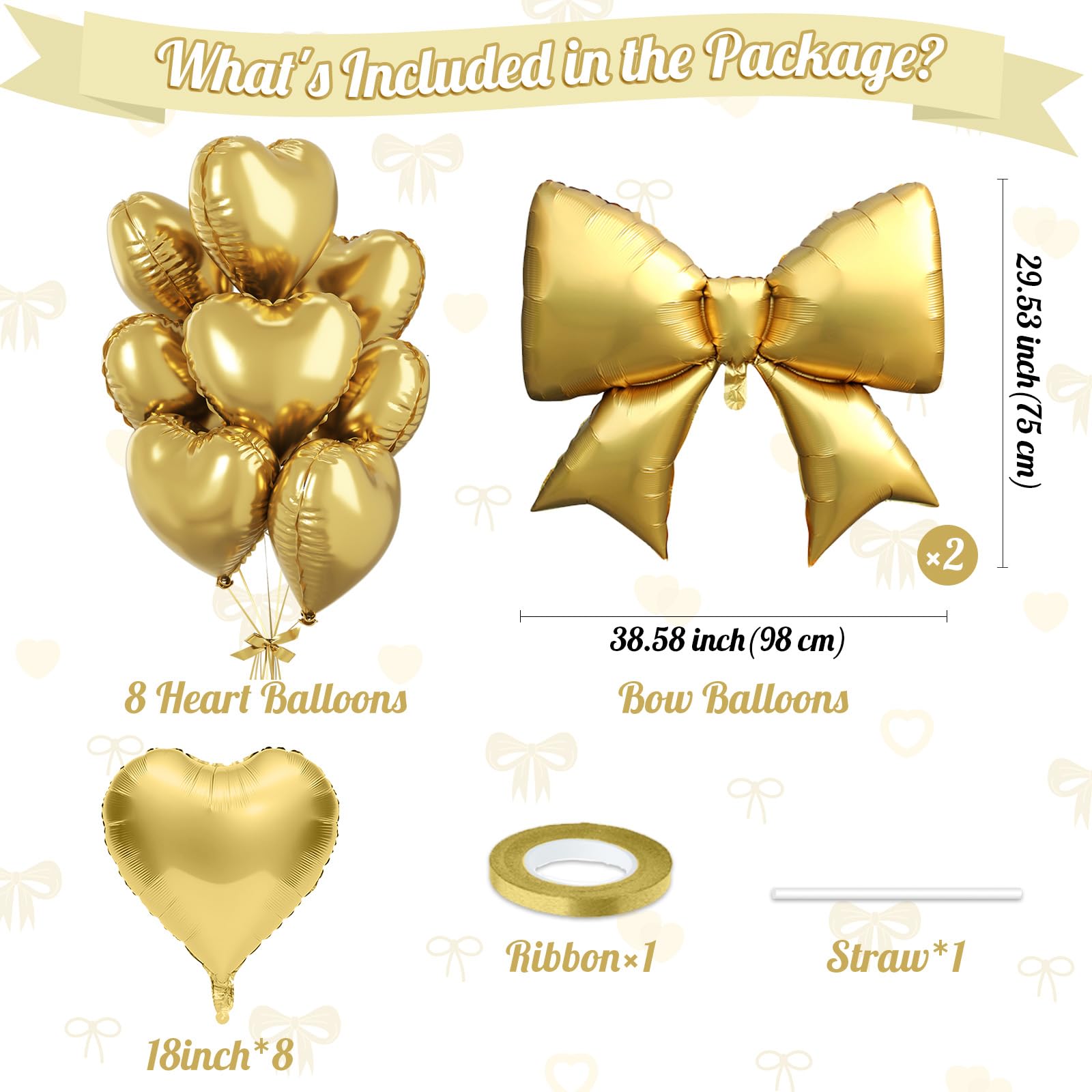 Package Includes: This luxurious gold heart and bow balloon set comes with 8 × 18 inch gold heart balloons, 2 × gold bow balloons (38.6 × 29.5 inch), 1 × straw, and 1 × gold ribbon—Complete set to make your celebration extra special and add a sparkling, elegant accent to weddings or parties.