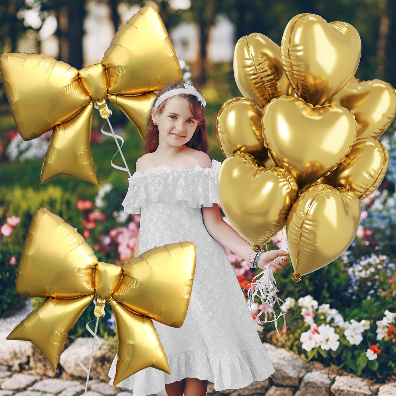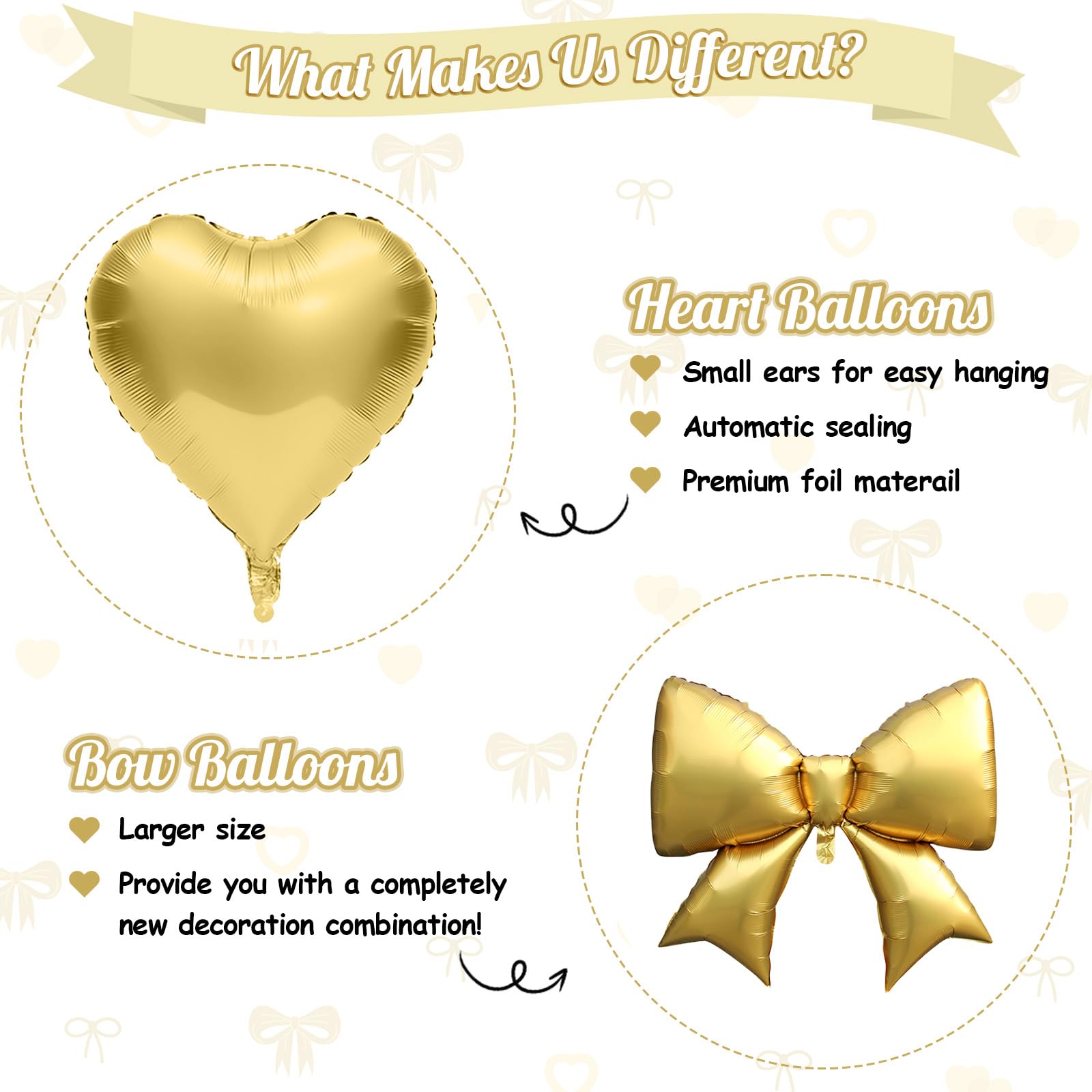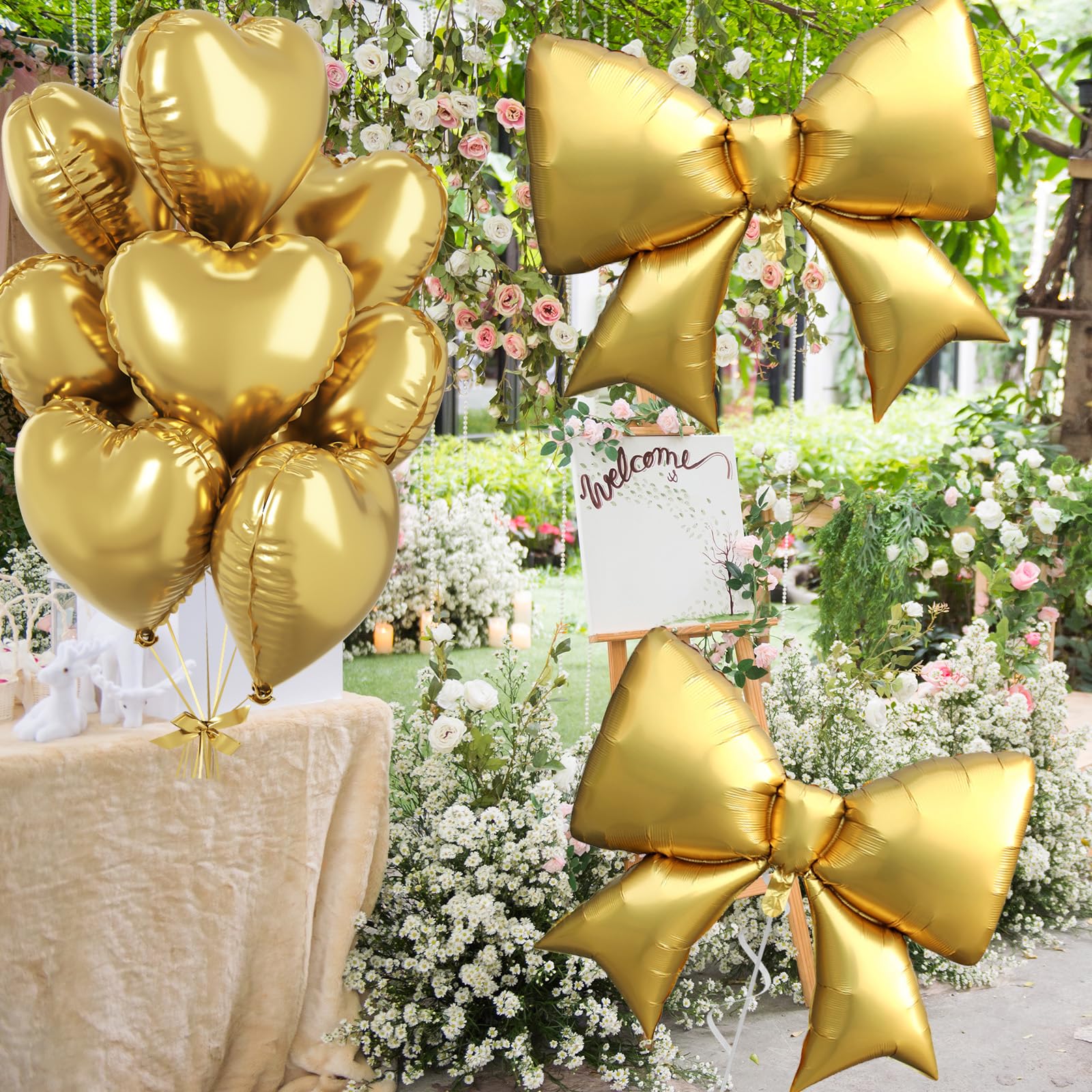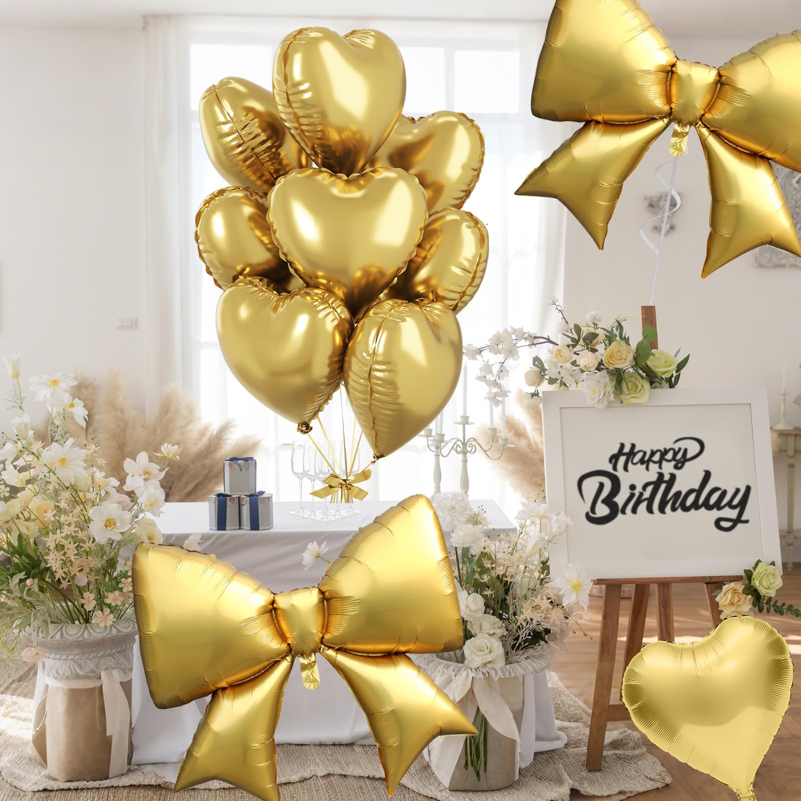 Romantic Heart & Bow Balloon Combinations: The combination of shiny heart foil balloons and extra-large bow balloons creates a sweet and elegant decoration style. Whether you want romantic heart balloons for a wedding, cute bow balloons for a princess party, or just need metallic gold balloons for a chic birthday backdrop, this set adds charm to your party occasion.