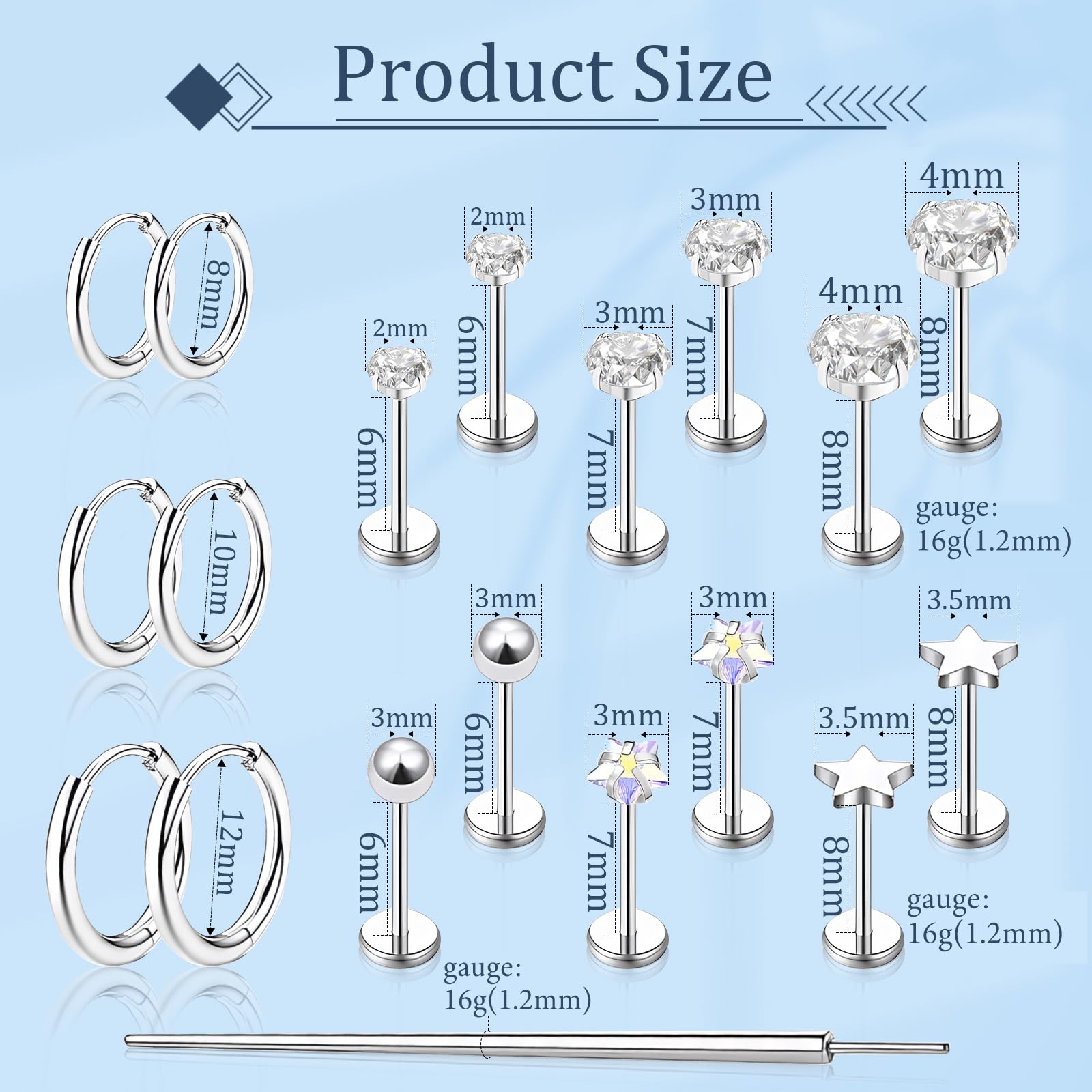 Tragus Piercing Jewelry Size: Stud 1.2mm (16 grauge), Diamonds: 2mm (0.08 in) / 3mm (0.12 in) / 4mm (0.16 in), Bar Length:6mm (0.23in) / 7mm (0.27in) / 8mm (0.3in), jagosen surgical steel earrings are available in a wide range of sizes, including ball studs, star studs, pentagonal diamond studs, and three pairs of different sizes of cubic zirconia studs. earrings and three pairs of cubic zirconia studs in different sizes.