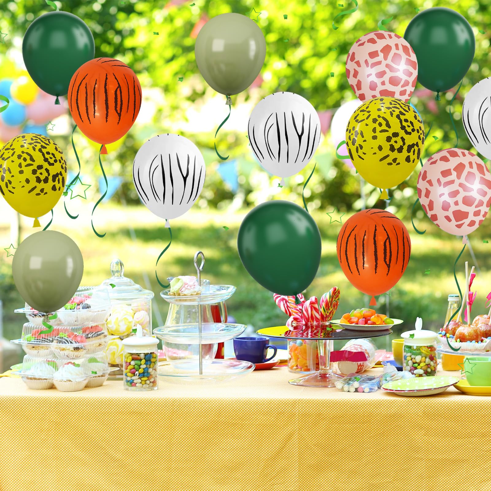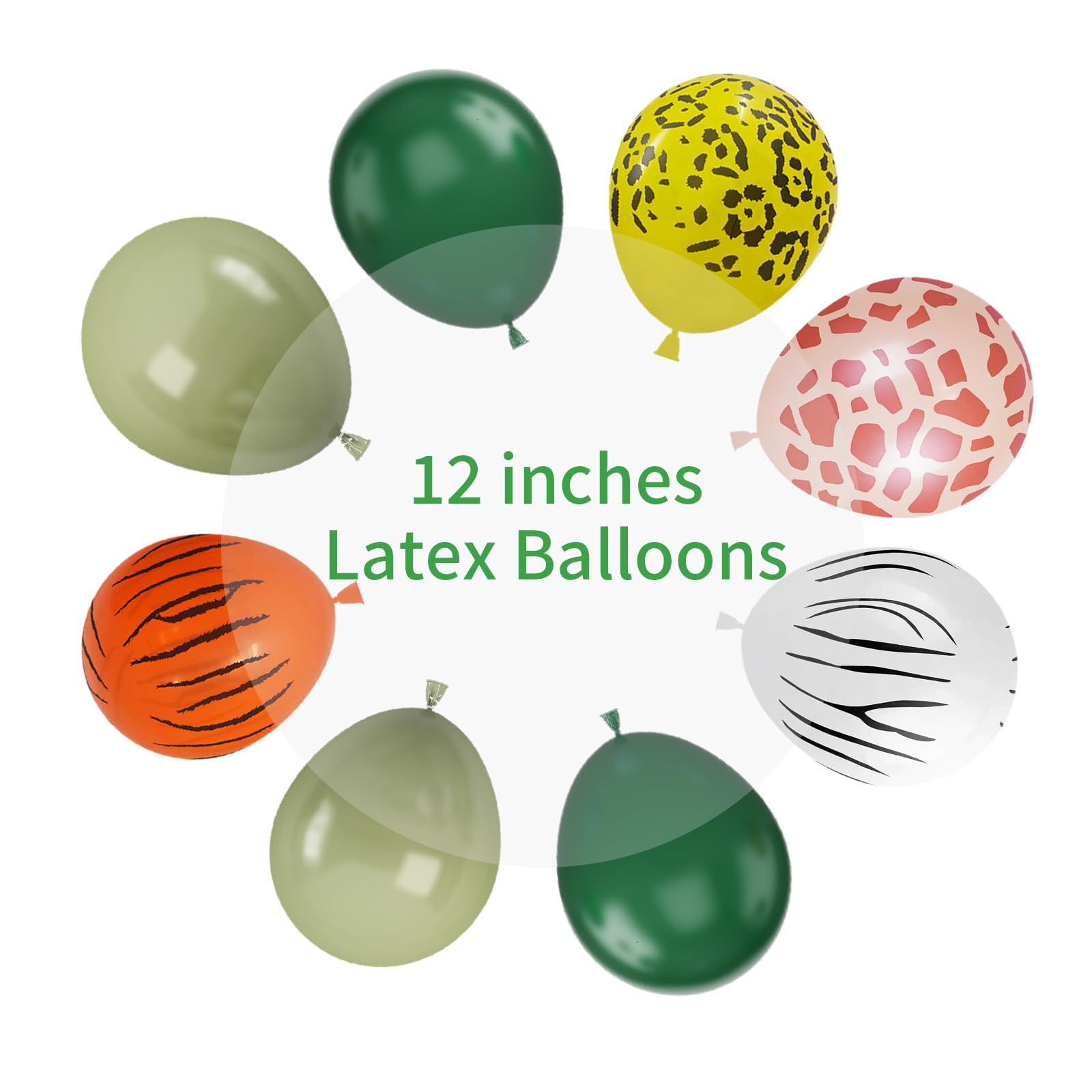 12 Inch jungle balloons: Package content includes 5pcs leopard print balloons, 5pcs zebra print balloons, 5pcs deer print balloons, 5pcs Tiger print balloons, 5pcs sage green balloons, 5pcs retro green balloons, a balloon ribbon.