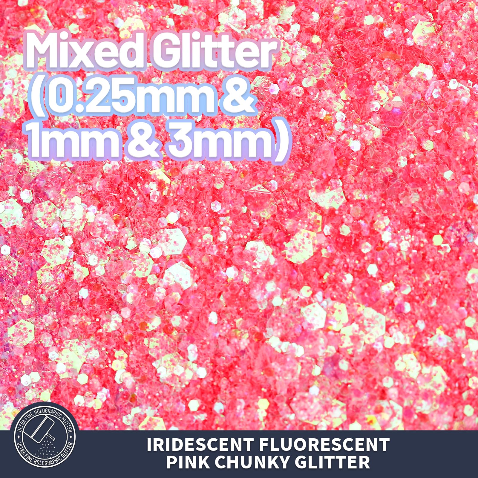 Mixed Chunky & Fine Glitter: Consist of different sizes of iridescent pink chunky glitter and fine glitter, with extra sparkling effect, and can mix nicely with epoxy resin, paint, glue, nail polish, etc, add sparkle to your art pieces.