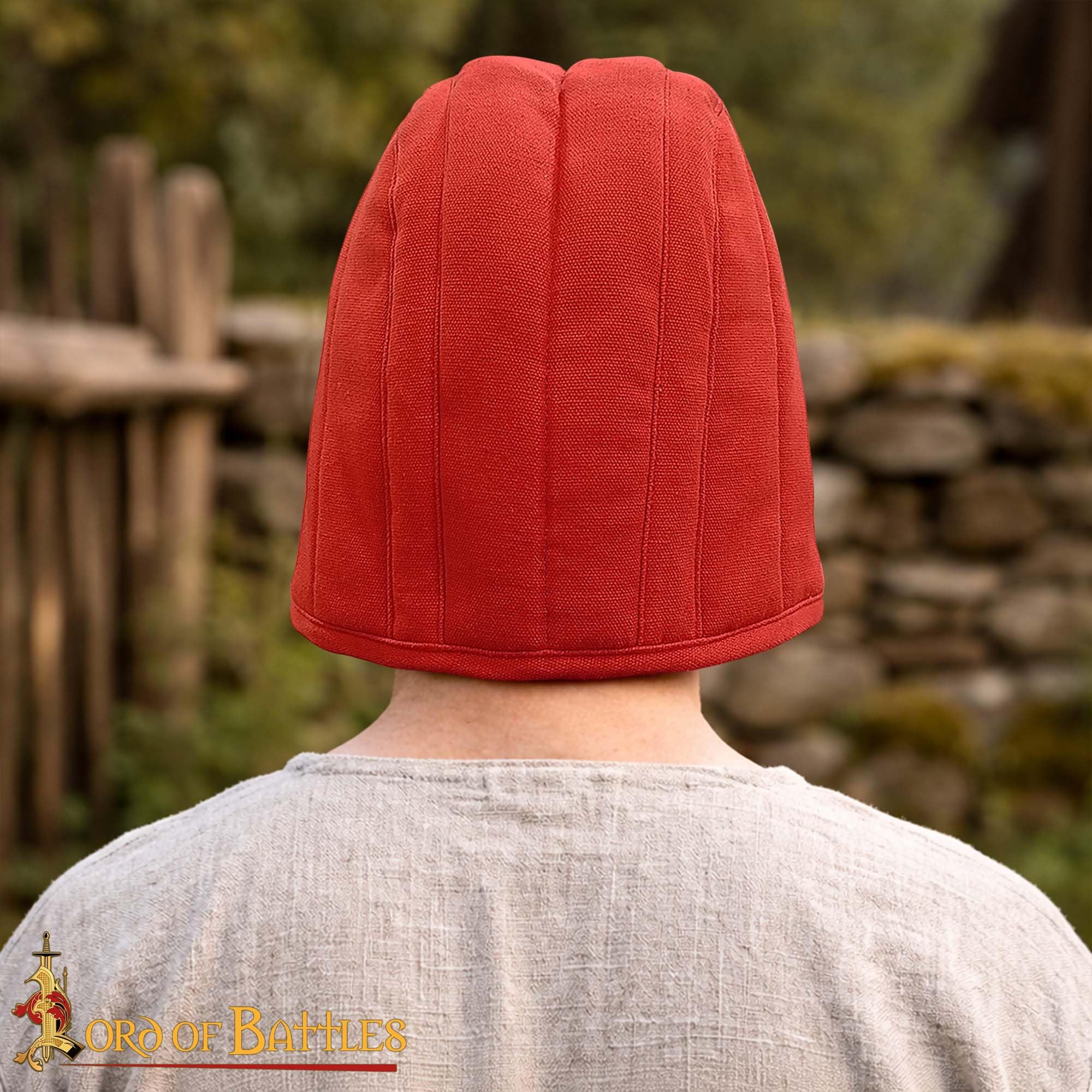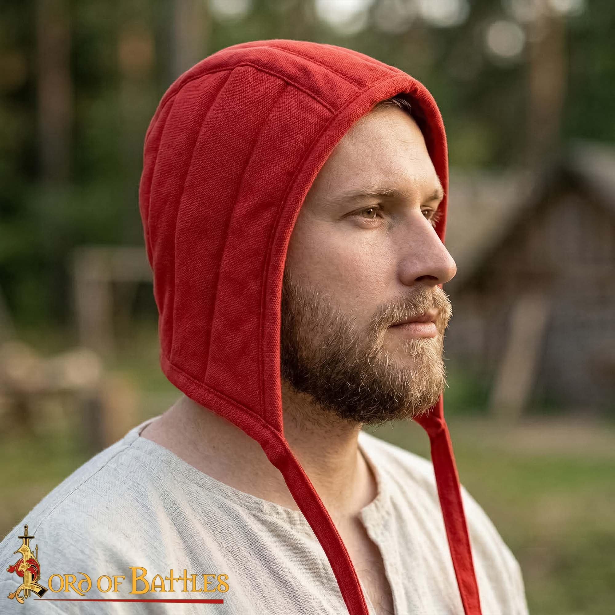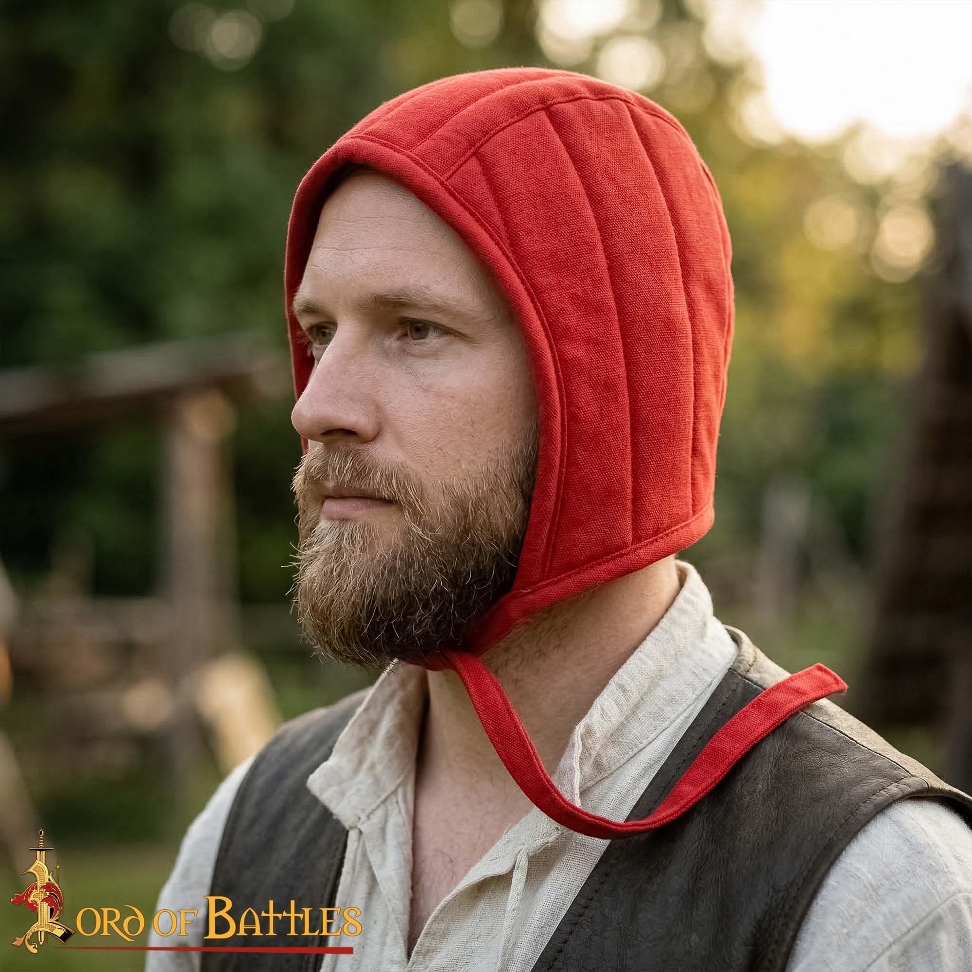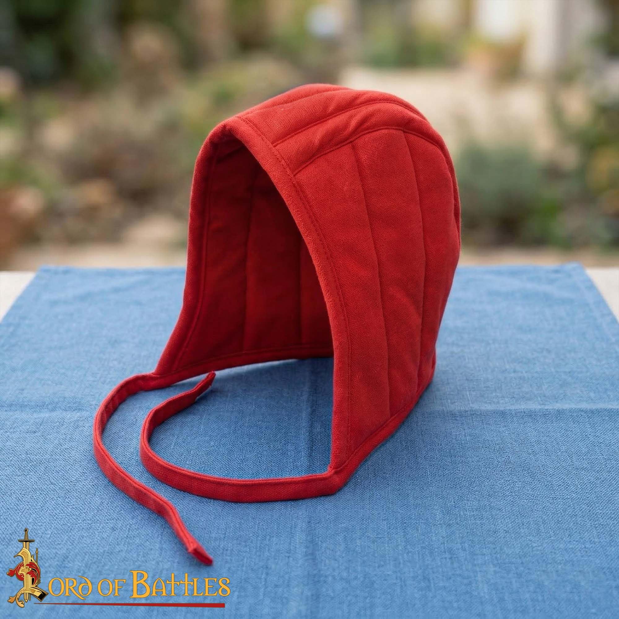 Description Genuine Lord of Battles product, handcrafted from durable quilted canvas cotton for added comfort and protection under helmets. Acts as a shock-absorbing layer, ideal for knights, soldiers, and medieval reenactors wearing helms or mail coifs. Designed in a size large to fit most adult head sizes comfortably; total length approximately 25 cm. Available in three authentic colors: black, ecru, and brown—perfect for matching different historical outfits. Ideal for medieval reenactments, LARP, cosplay, SCA events, and themed weddings