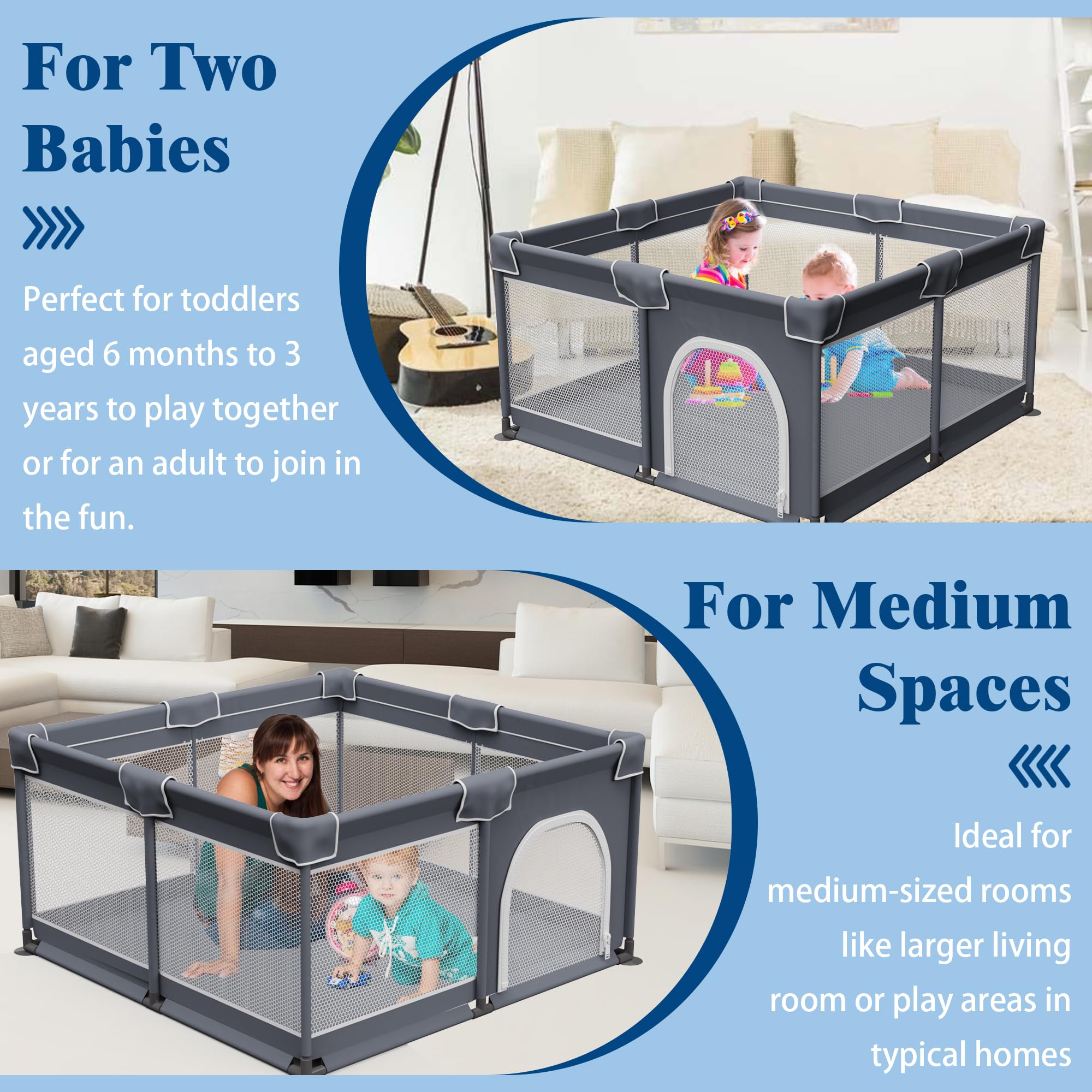 Playpen for Babies and Toddlers: This playpen includes two pull-up rings and a storage bag. Measuring 50x50 inches, it provides a footprint of about 17 square feet. It comfortably accommodates two babies playing together or allows an adult to interact with a child. Ideal for medium-sized rooms like larger bedrooms or play areas in medium-sized homes, it offers ample space for active play without overcrowding.