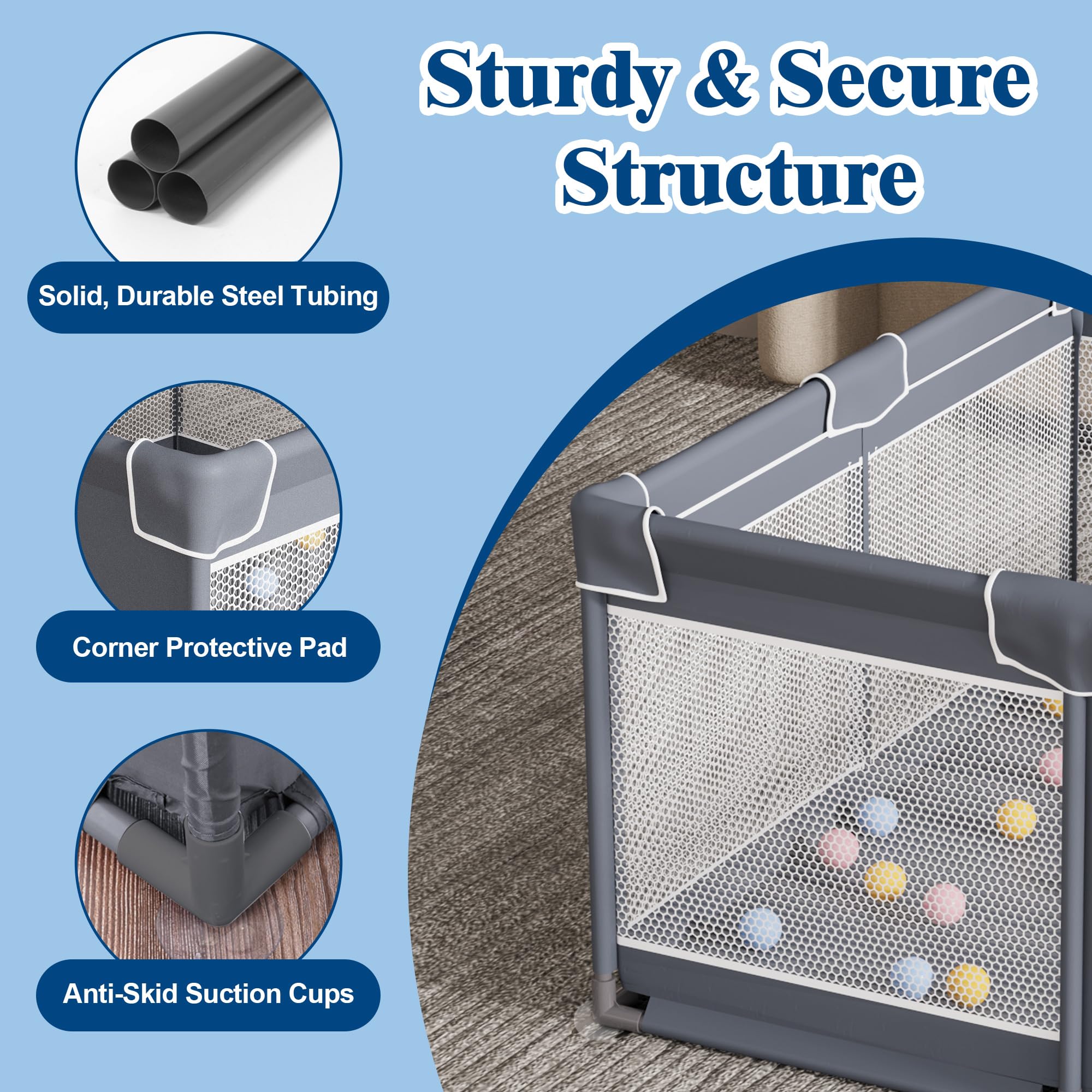 Baby Safety Play Yard: Sturdy safety suction cups on the playpen's bottom prevent tipping. Adding two drops of water to the suction cups at the bottom will enhance its stability even further. Soft corner cushions minimize accidental bumps, ensuring your baby's safety.