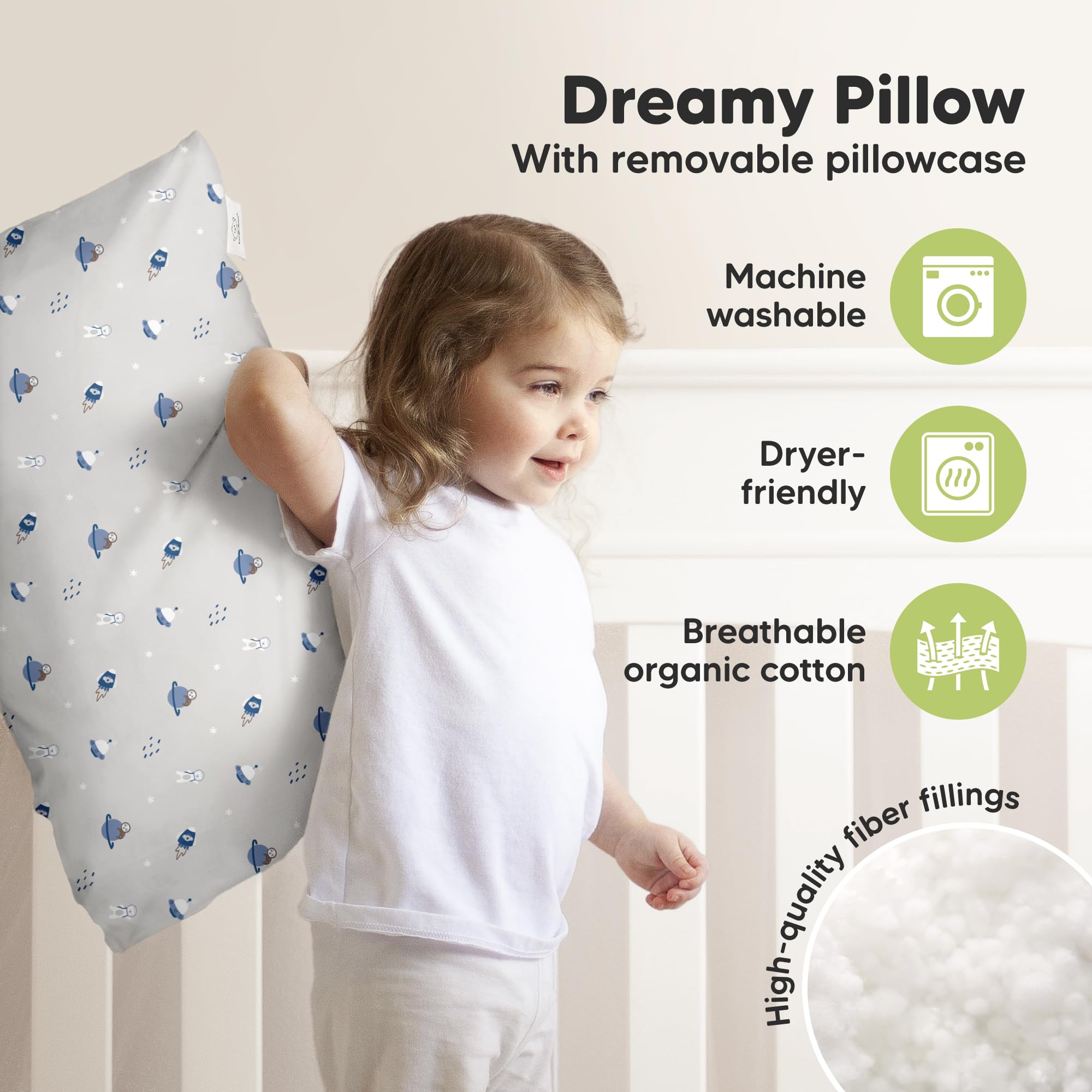 Natural Cotton - Our toddler pillowcase and cover are made of OEKO-TEX 100 Standard and GOTS Certified CU 1042833 Organic Cotton. This soft & breathable toddler pillow for kids is the perfect kid pillows for sleeping and travel pillow for 2 year old.