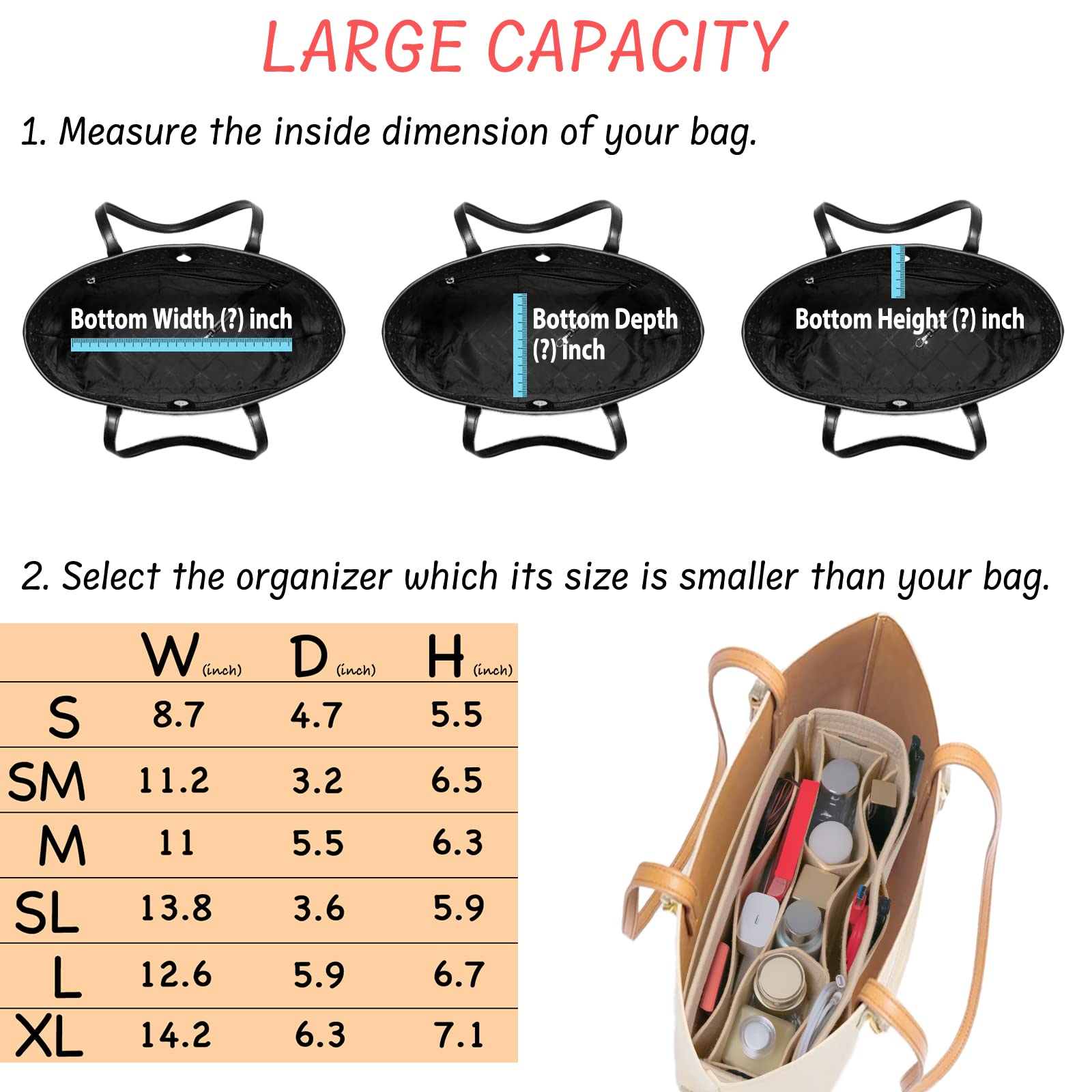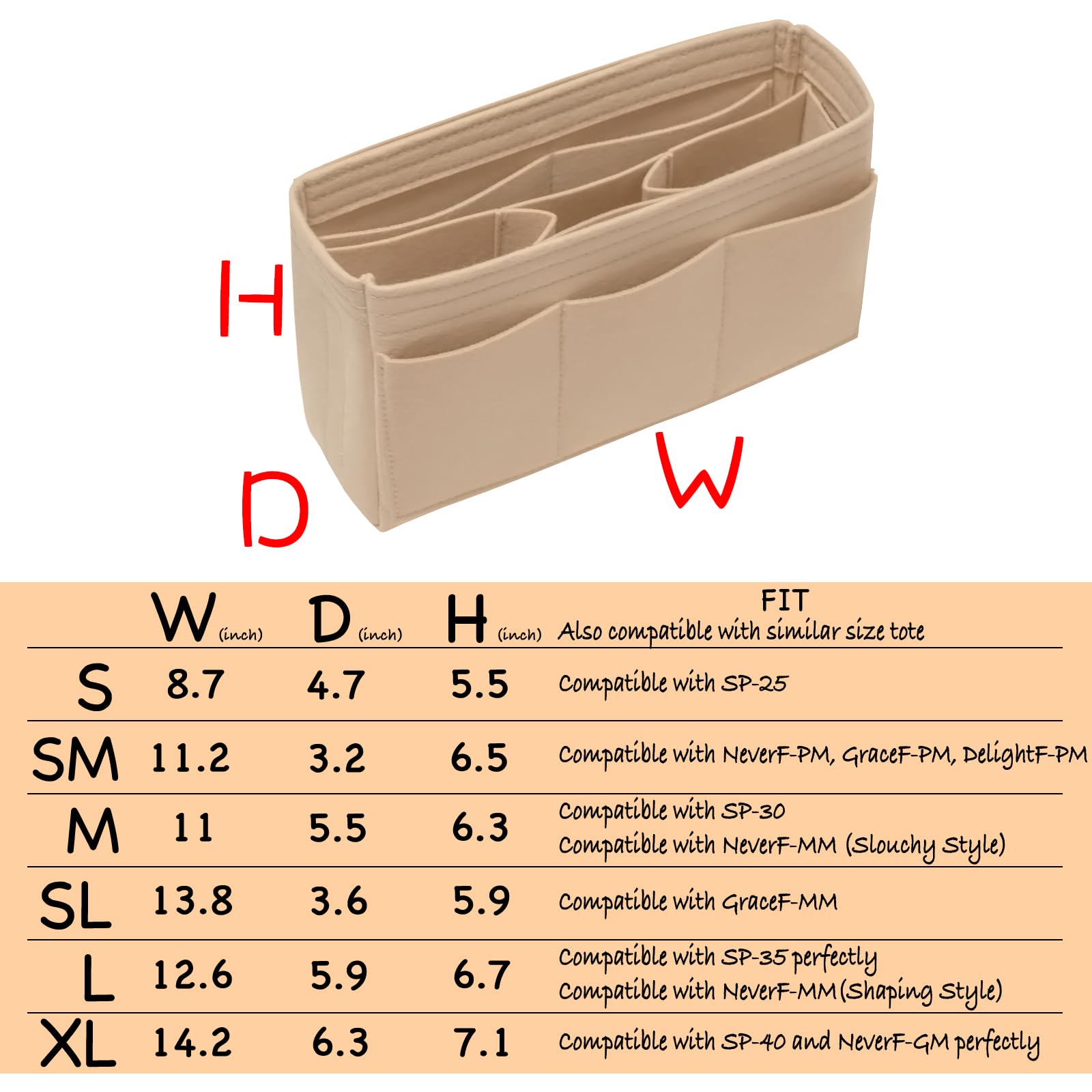 【PURSE INSERT FOR HANDBAGS】 S=8.7"W x 4.7"D x 5.5"H, compatible with SP-25, MINI & SMALL MJ TOTE. SM= 11.2"W x 3.2"D x 6.5"H, compatible with NeverF-PM, GraceF-PM, DelightF-PM. M=11"W x 5.5"D x 6.3"H, compatible with SP-30, MEDIUM MJ TOTE, with NeverF-MM(Slouchy Style). SL=13.8"W x 3.6"D x 5.9"H, compatible with GraceF-MM. L=12.6"W x 5.9"D x 6.7"H, compatible with SP-35, with NeverF-MM(Shaping Style). XL=14.2"W x 6.3"D x 7.1"H, compatible with SP-40, LARGE MJ TOTE BAG, and NeverF-GM.