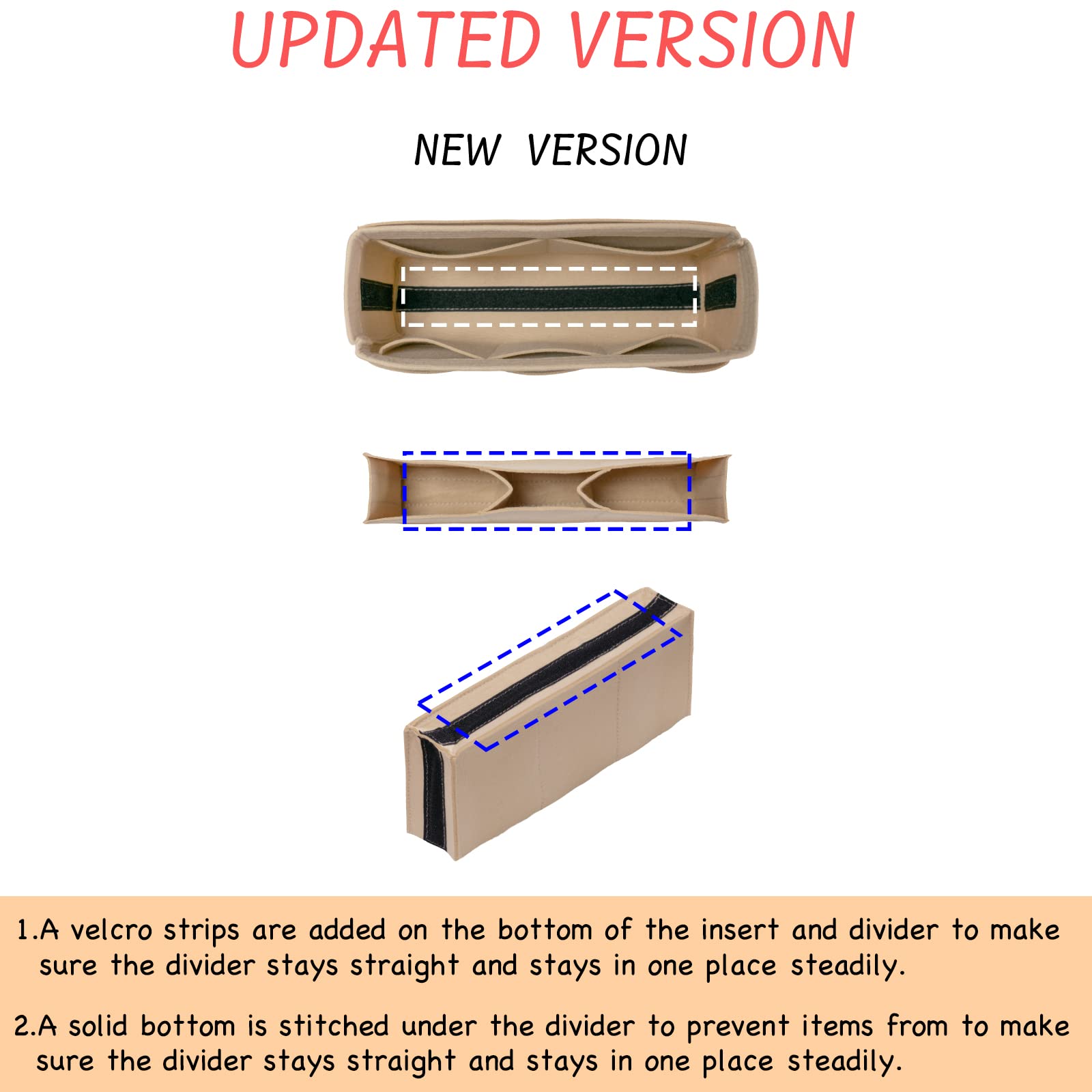 【UPDATED TOTE BAG INSERT】As you can see in the product pictures, two long magic straps are added on the bottom of the removeable divider to make sure it will stay straight and stay in place steadily. A solid bottom is stitched under the divider to prevent items from rolling or losing into other section underneath. You can also remove the divider to offer more space if needed, or it can be used as an insert in a small purse if its size is right for your small purse.