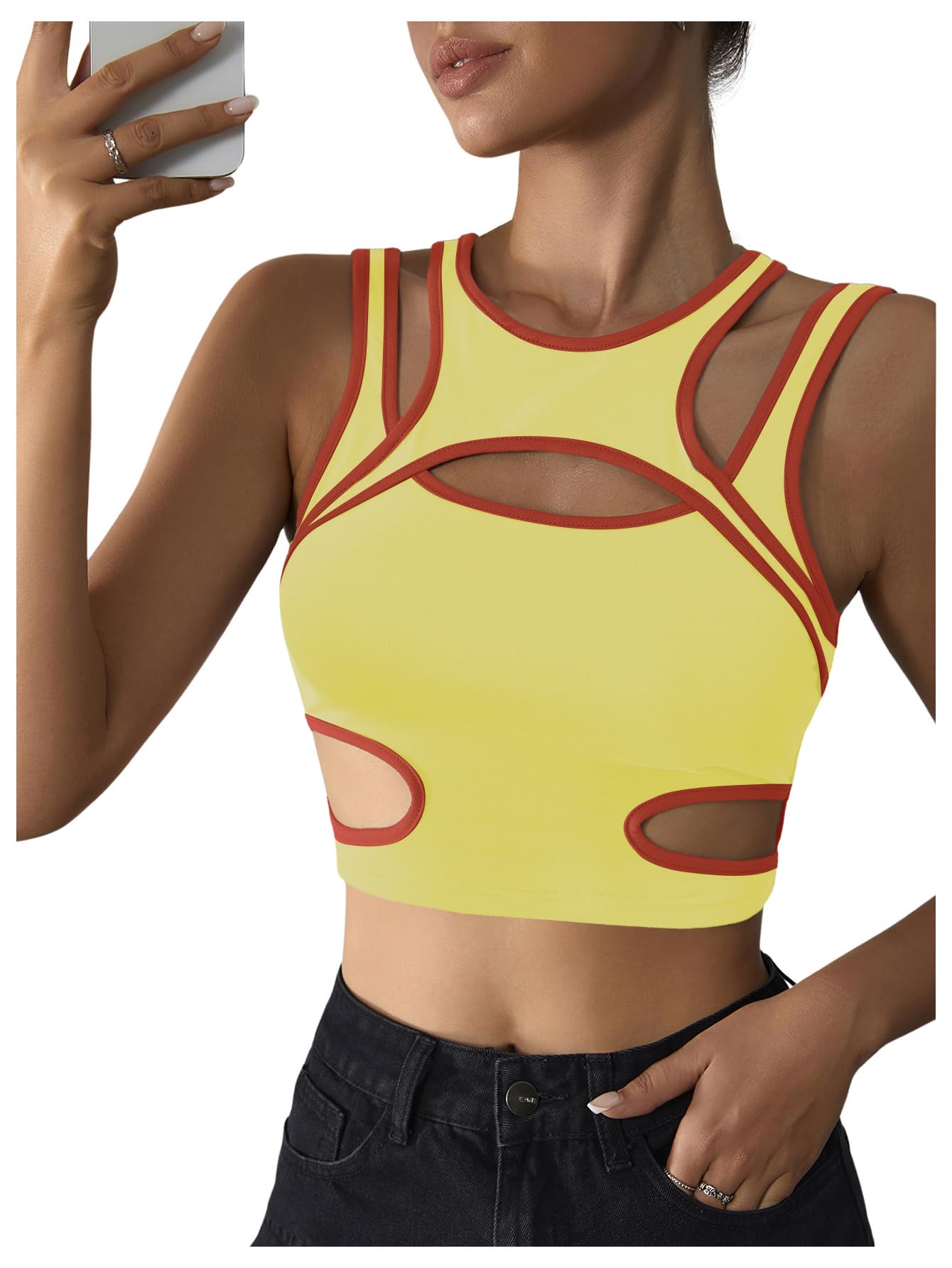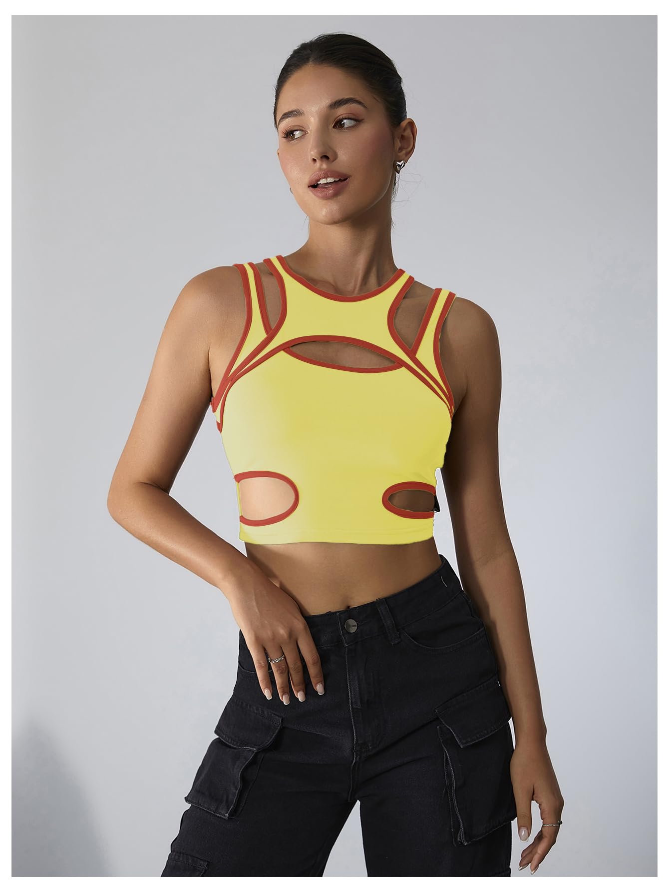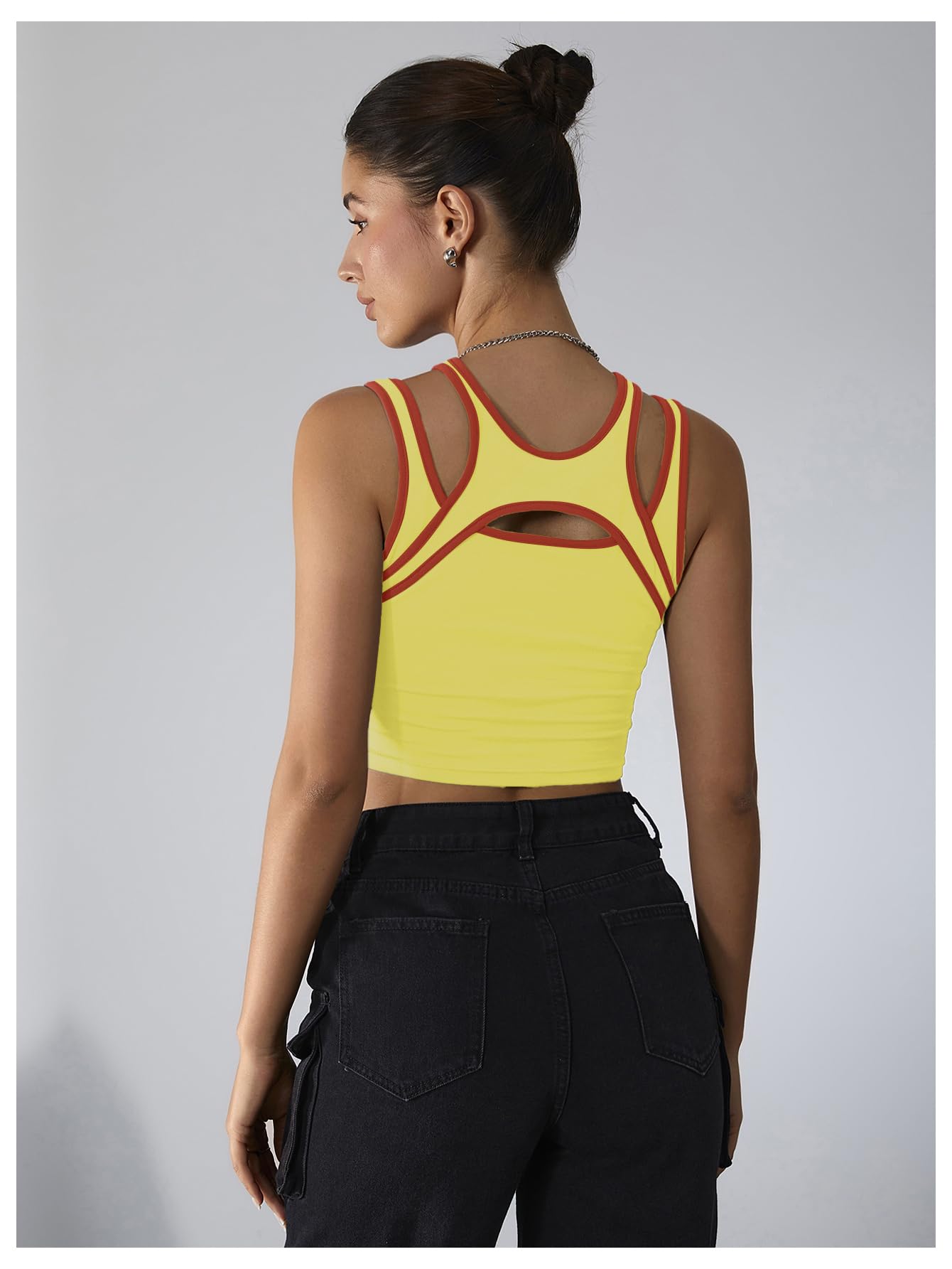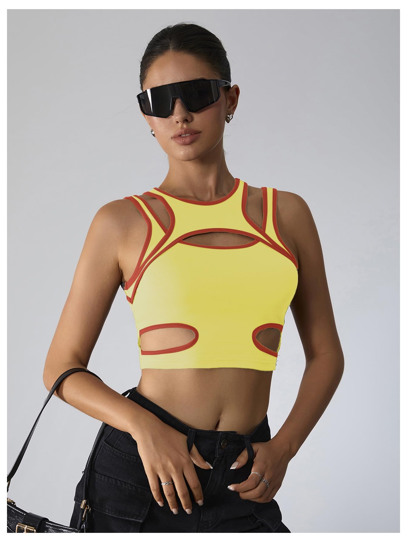 Feature: Cut Out, Sleeveless, Round Neck, Slim Fitted, Plain, Cropped Length, Trendy Tank Tops for Women