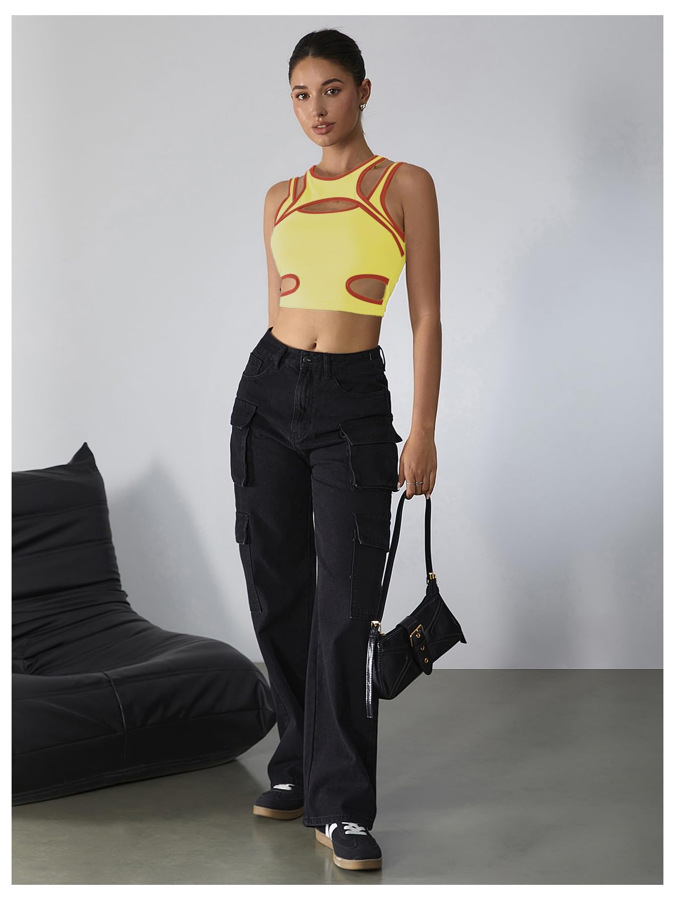 Match: You can pair this cut out tank top with high waisted pants, jeans, cargo pants or skirts for a chic look