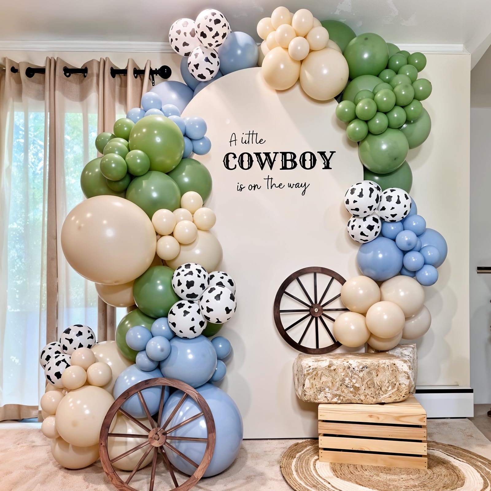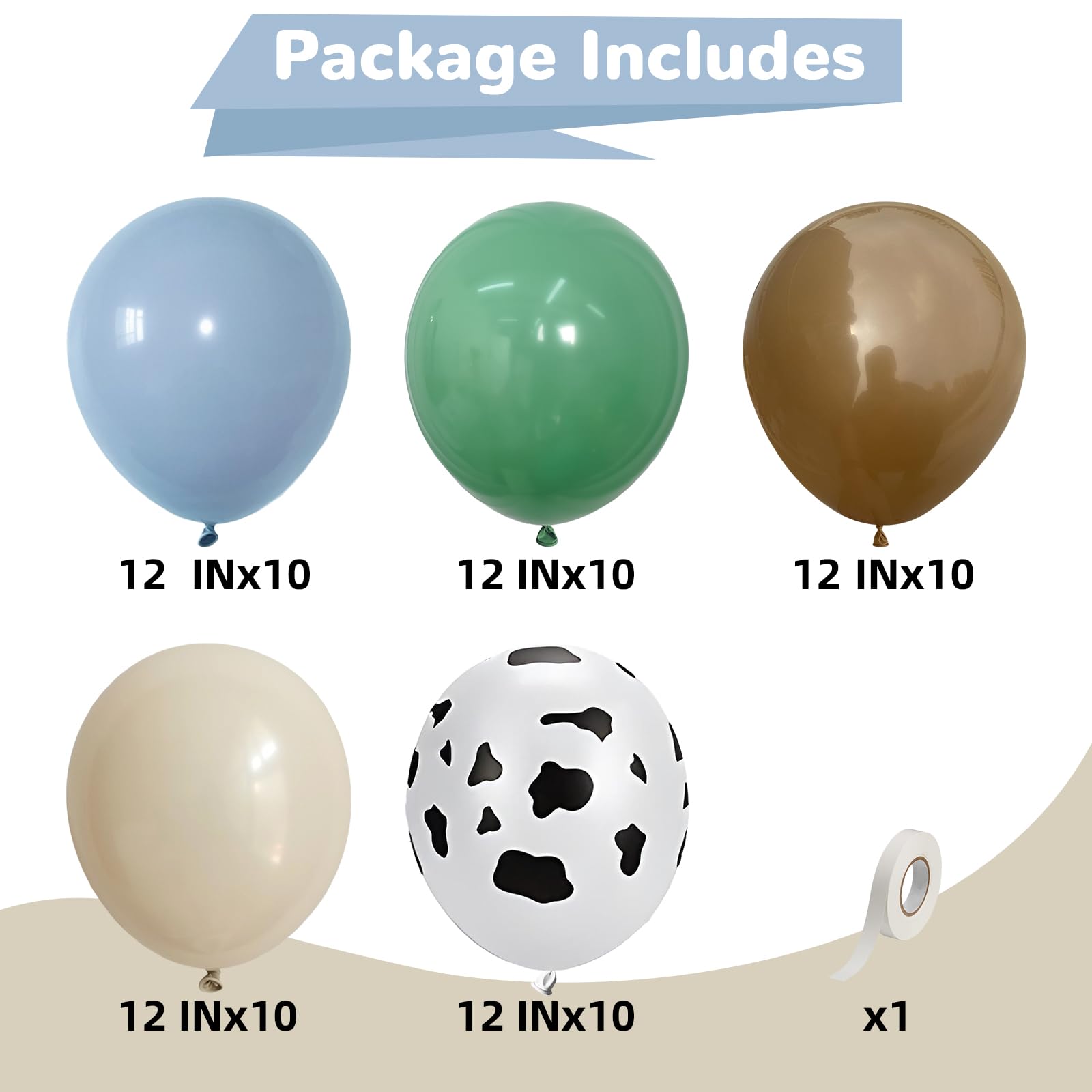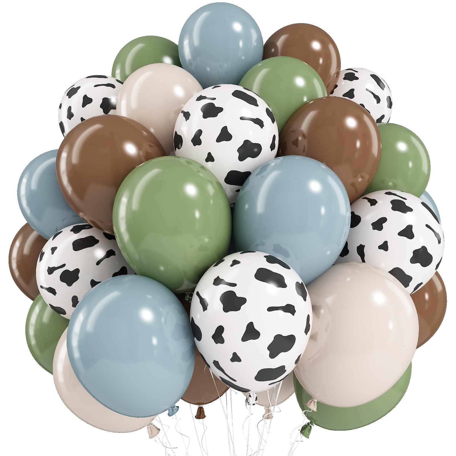 Cowboy Party Decorations: Includes 12 inch 10 pcs slate blue balloons, 12 in 10 pcs sage balloons, 12 in 10 pcs brown balloons, 12 in 10 pcs white sand balloon, 12 in 8 pcs cow print balloons and a roll of balloon ribbon