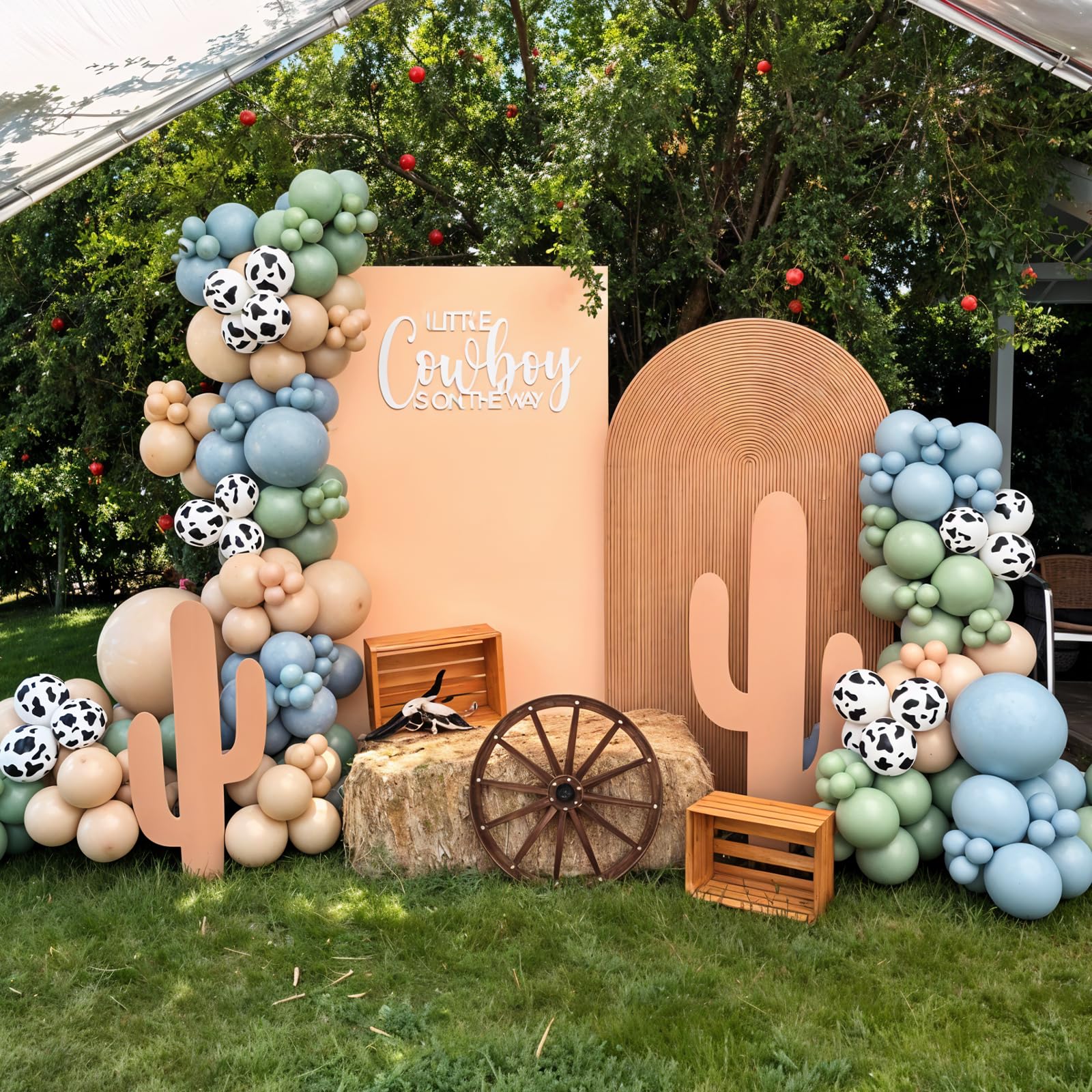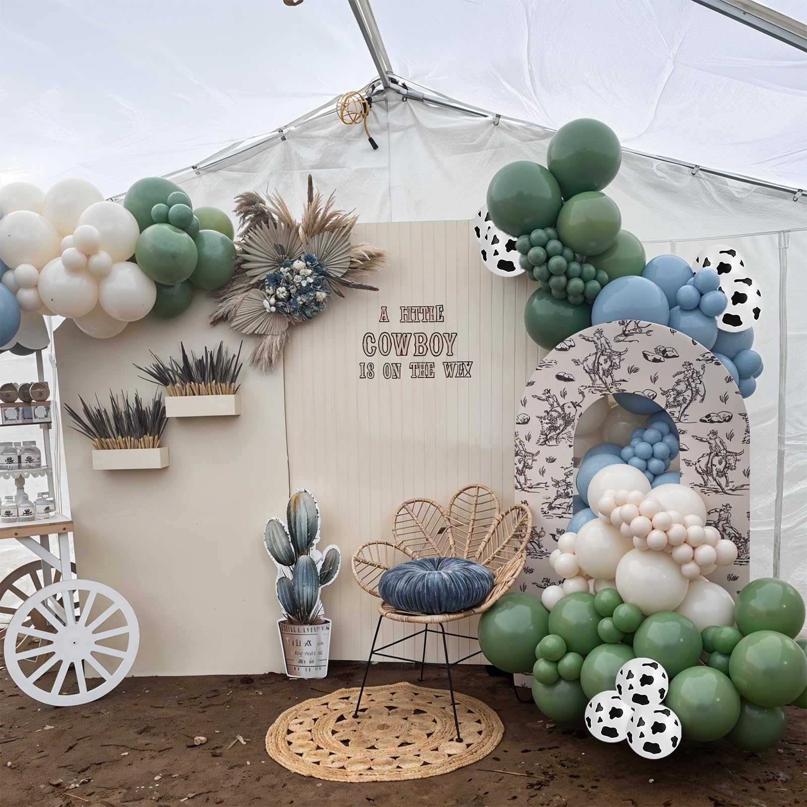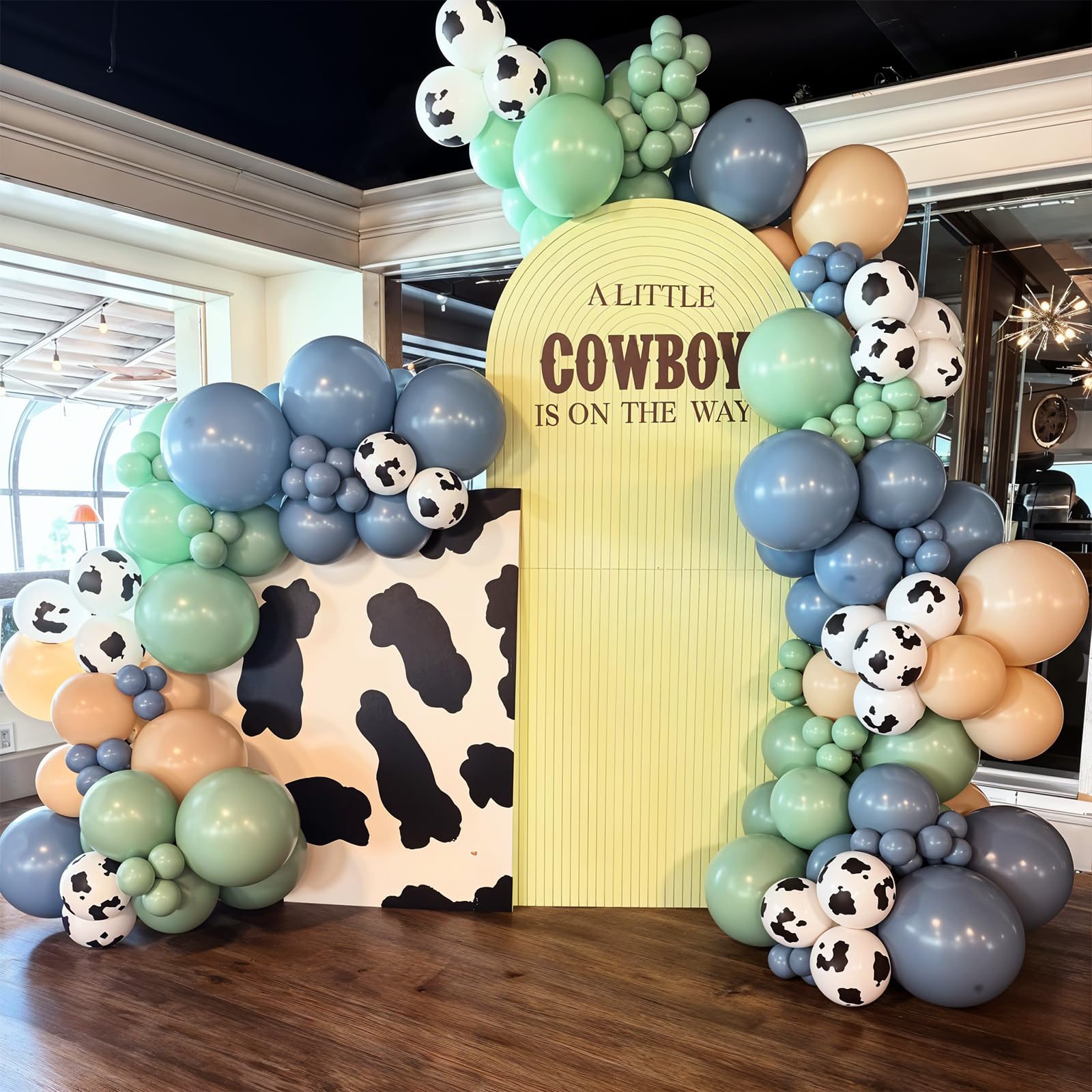 Cowboy Party Decorations: Includes 12 inch 10 pcs slate blue balloons, 12 in 10 pcs sage balloons, 12 in 10 pcs brown balloons, 12 in 10 pcs white sand balloon, 12 in 8 pcs cow print balloons and a roll of balloon ribbon