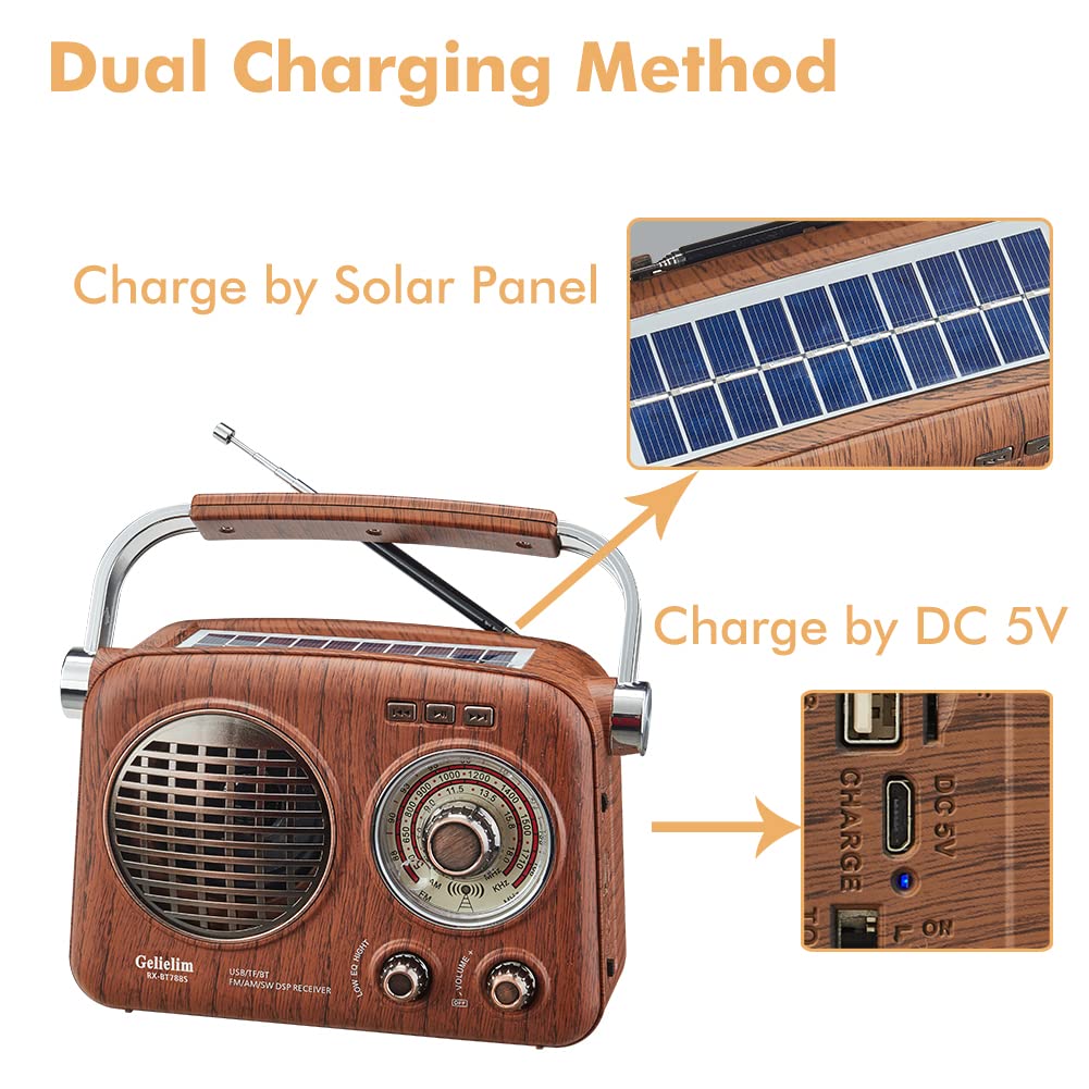 【Two Types of Power Source】Designed with convenience in mind, this am/fm portable radio features a built-in 1200mAH rechargeable battery and a solar panel. It can be easily charged via the DC 5V port or solar energy. When you are outdoor or if there power outage, just charge the radio via solar energy so that you can connect and get broadcast news or music in real-time. So good a rechargeable battery radio !