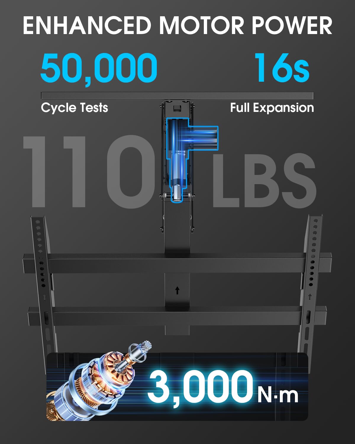 Powerful Motor for Effortless Motion: Experience smooth, quiet performance with a high-torque 3,000 N·m motor that expands fully in just 21 seconds. This electric ceiling TV mount combines speed and precision with ±3° screen leveling. Engineered for durability and reliability, it has passed 50,000 cycle tests—making it the most dependable drop down TV mount for long-term everyday use.