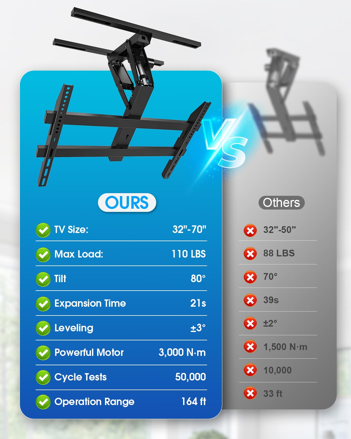 Easy Installation, Universal Fit: Compatible with 32–70 inch TVs and VESA 200x100mm to 600x400mm, this ceiling mount TV bracket fits most popular brands. All hardware and step-by-step instructions are included for wood or concrete ceilings. With its fast setup and smart engineering, this motorized ceiling TV mount brings luxury viewing to any room—effortless, elegant, and secure.
