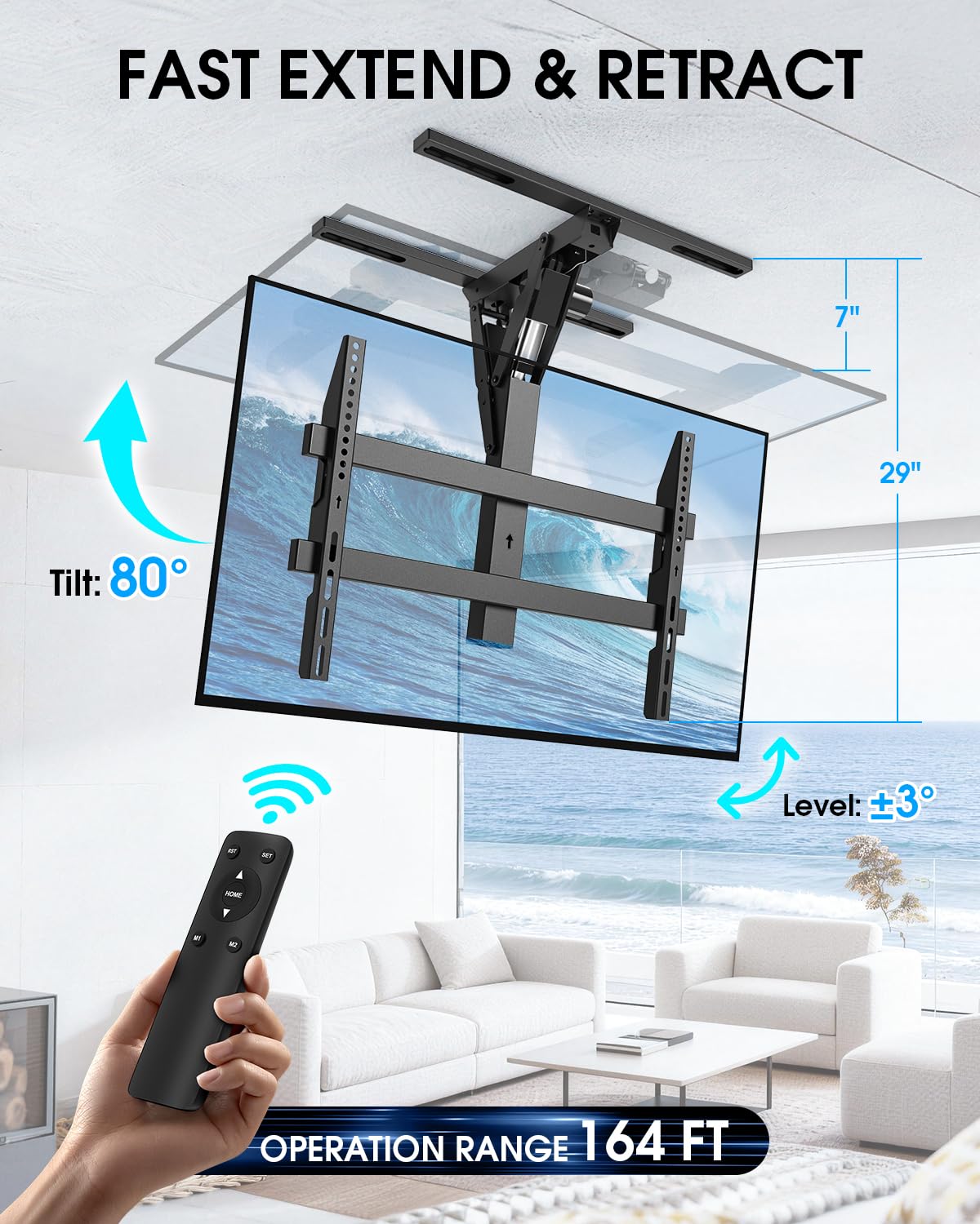 Built to Last with Unmatched Stability: Crafted from premium heavy-duty steel, this full motion ceiling TV mount securely supports TVs up to 110 lbs. The reinforced structure and steady motor movement ensure long-term stability without sagging or shaking. Perfect for both indoor and covered outdoor setups, this electric ceiling TV mount guarantees peace of mind and flawless performance.