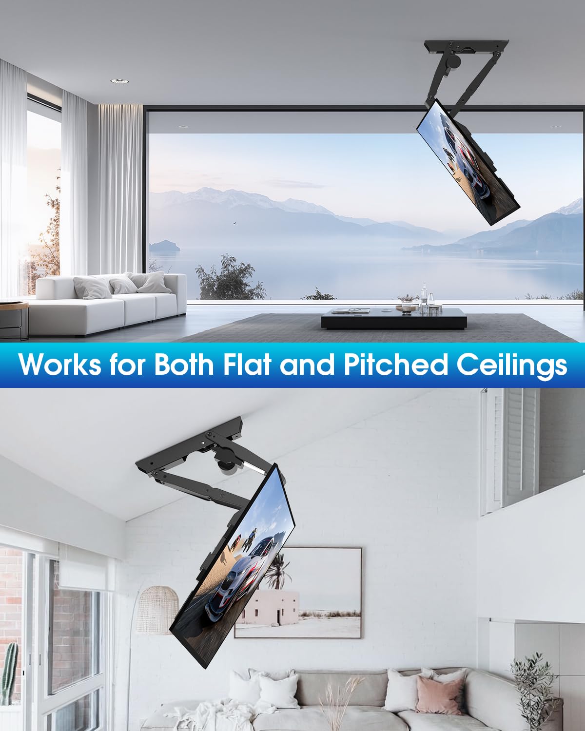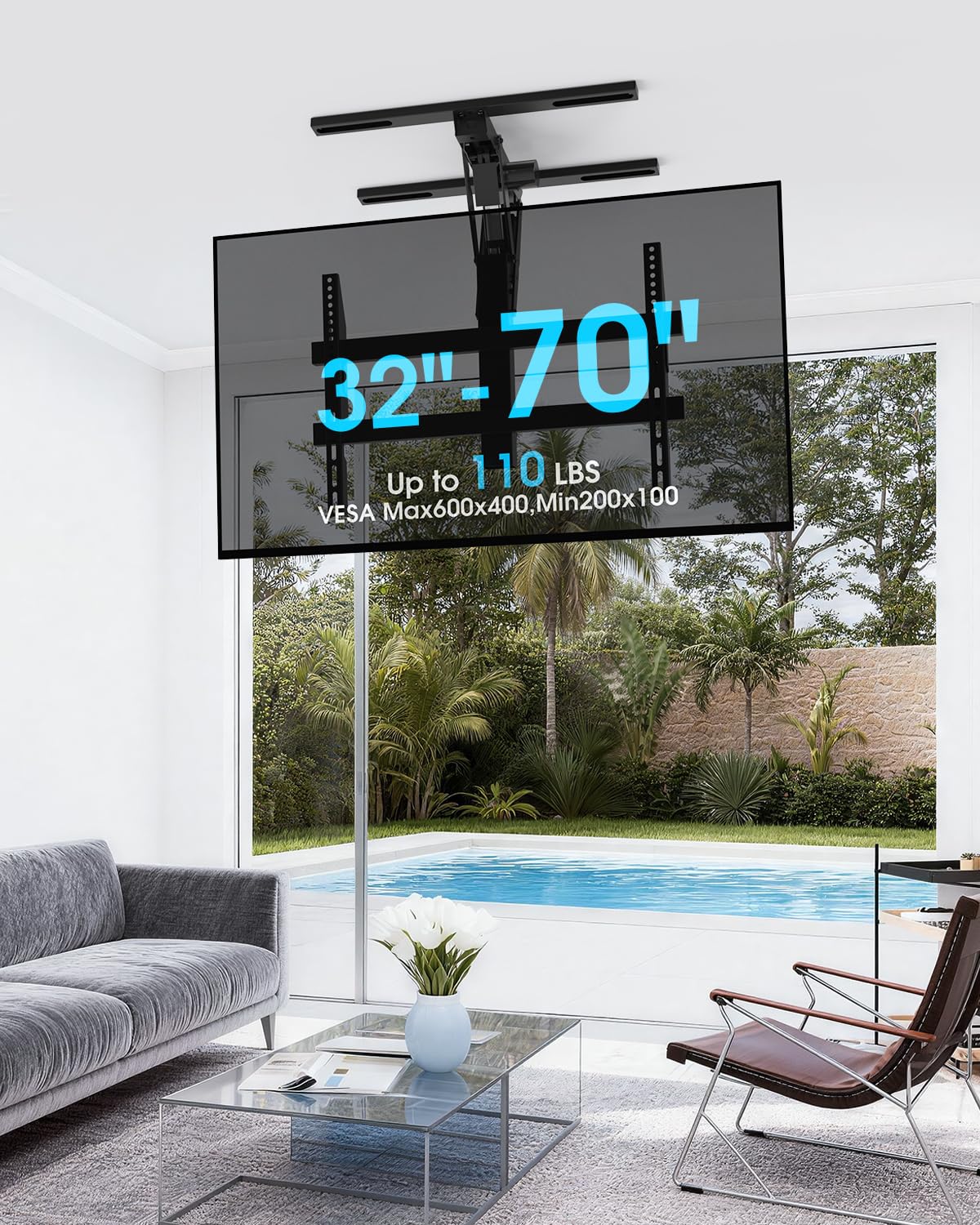Elevate Your Entertainment Experience: Upgrade your setup with this premium motorized ceiling TV mount, built to impress in both performance and style. Supporting 32–70 inch flat or curved TVs up to 110 lbs, this ceiling mount TV bracket smoothly flips 0°–80°. Designed for flat and pitched ceilings, it’s the perfect electric adjustable flip down TV mount for a clean, modern home or office look.