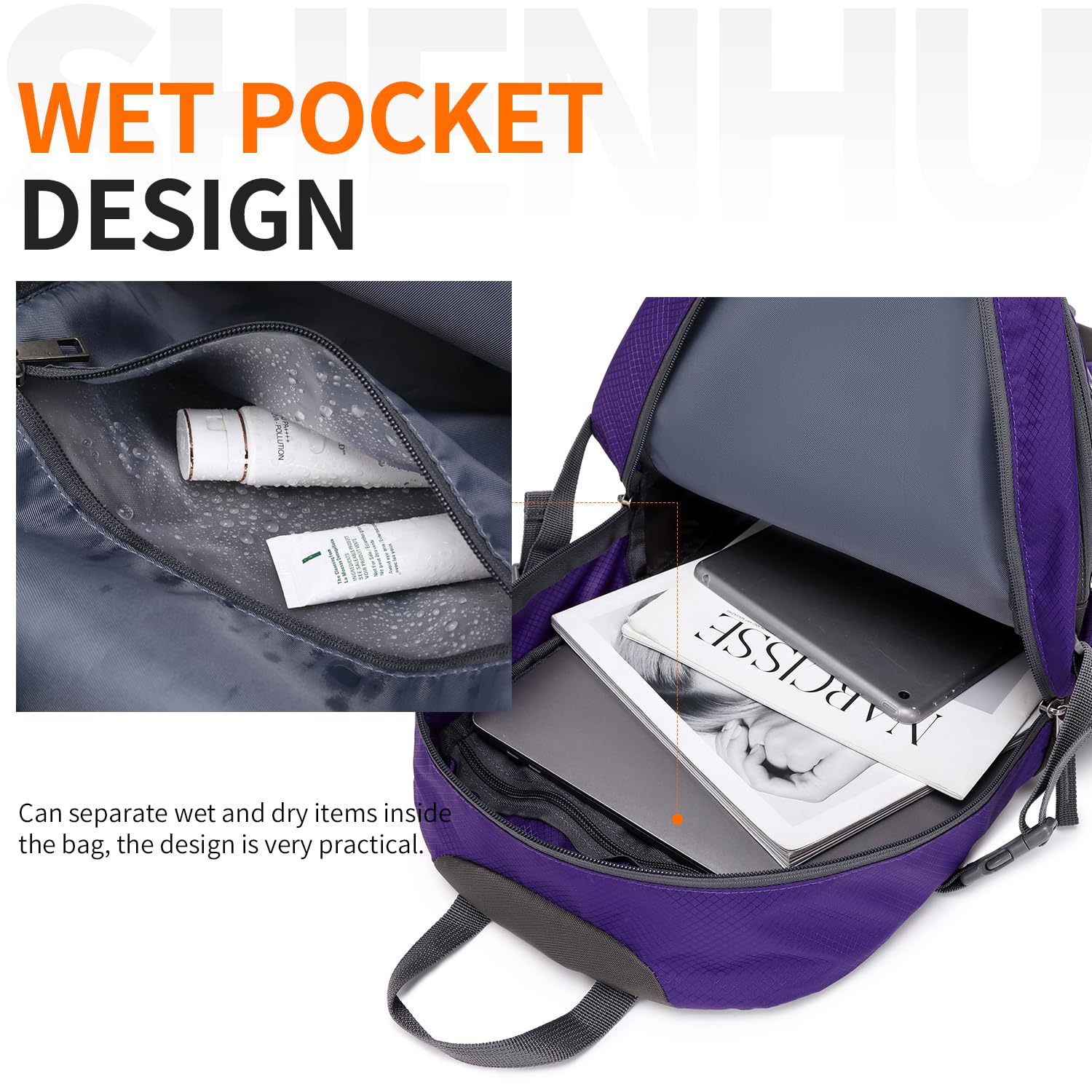 Wet Pocket Design: stands out with more humane design for easy and convenient use. One big waterproof wet pocket is added to the front compartment, can let to the internal wet pocket, to better separate sweaty clothes, towels or other personal things after swimming or taking exercise.