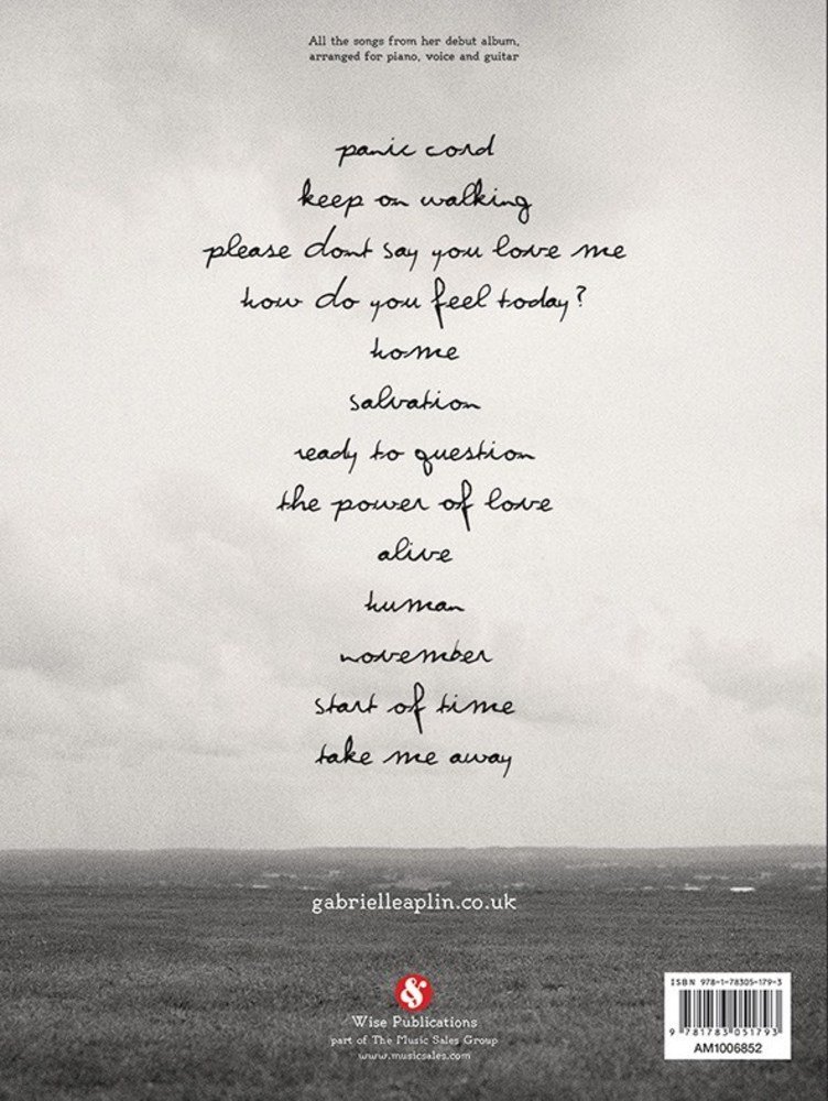 DescriptionGabrielle Aplin is the singer who sprung to fame with her chilled-out piano cover of the classic '80s power ballad, The Power of Love. Her début album, English Rain, includes that song plus three more singles: Please Don't Say You Love Me, Panic Cord and Home.This matching songbook contains all the songs from English Rain, presented in expert arrangements for Piano, Voice and Guitar.SonglistAliveHomeHow Do You Feel Today?HumanKeep On WalkingNovemberPanic CordPlease Don't Say You Love MeReady to QuestionSalvationStart of TimeThe Power Of Love
