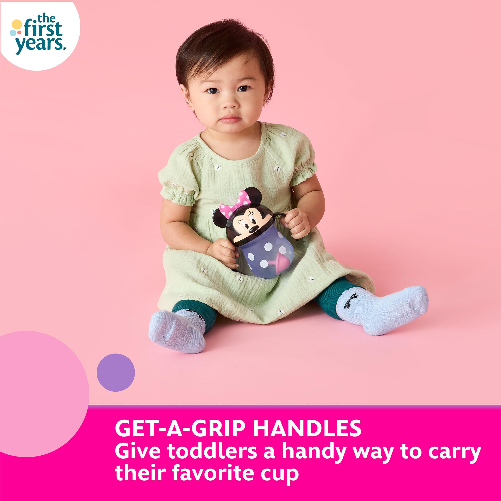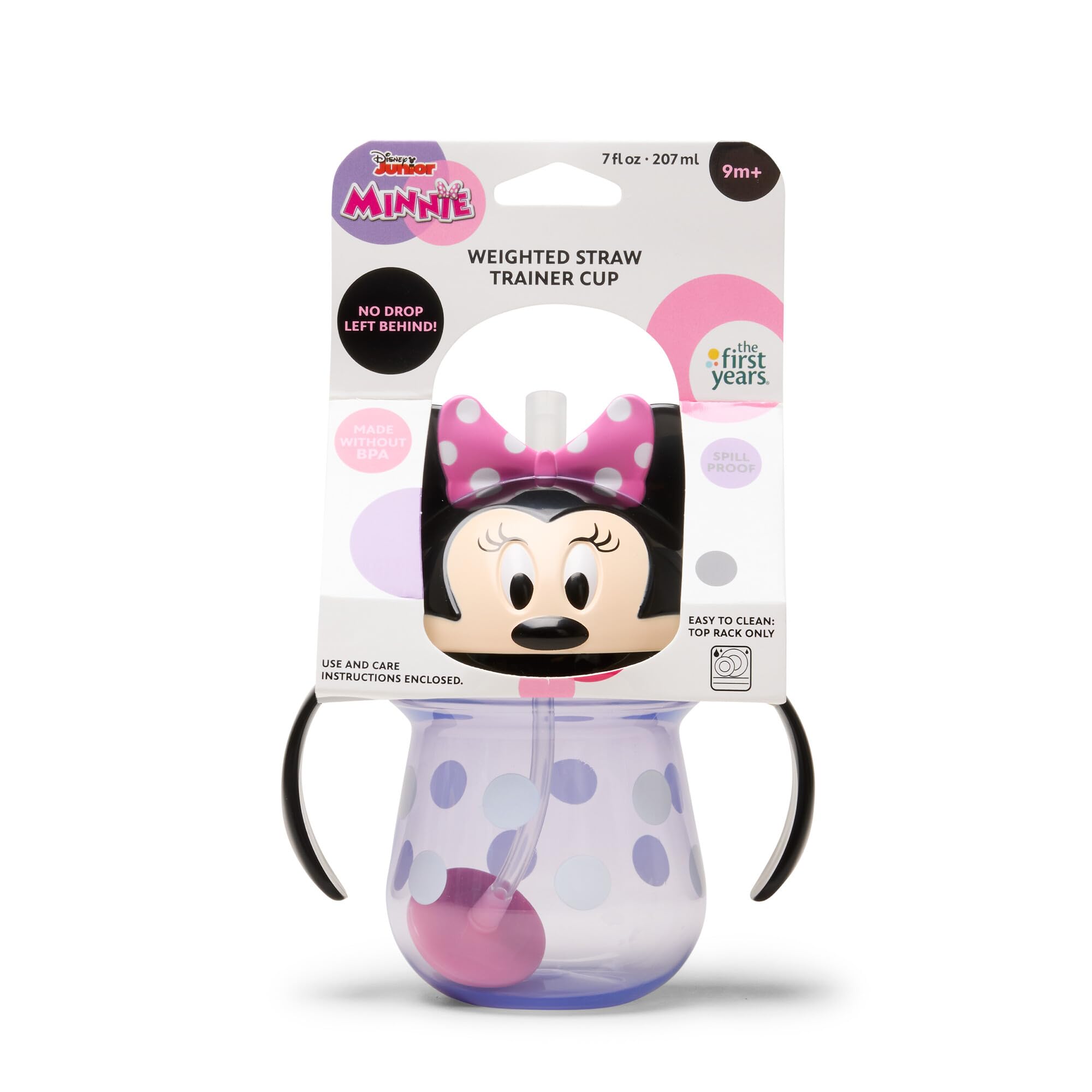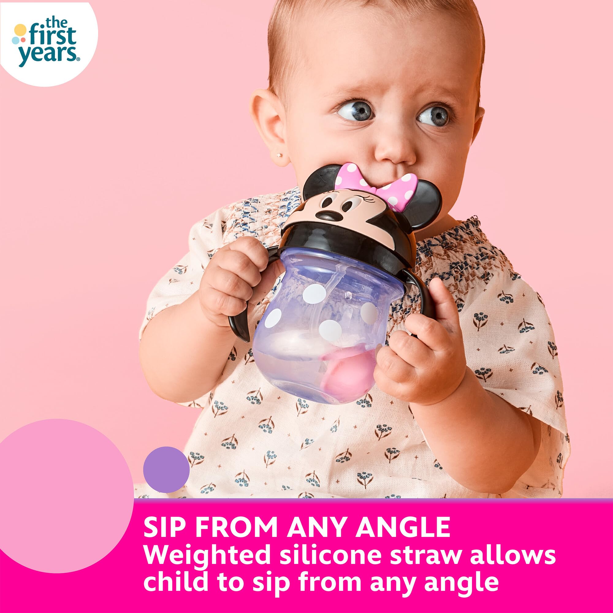 Minnie helps babies learn to sip from a straw with The First Years Weighted Straw Sippy Cup! This baby sippy cup makes sure no drop is left behind thanks to the weighted straw that stays in the liquid for easy sipping as your baby learns to drink. Even if the straw cup tips from side to side, the weight stays in the right place, making it easy for toddlers to get a sip whenever they want one. Whether they're spending the day in at home, out at the park, or heading to daycare, this toddler cup's training handles are designed for little hands to hold on to. Their new favorite sippy cup also has a flip-top cover over the straw that does double duty by keeping the straw clean and the drink inside the cup. (Great for your toddler on the go!) Your little one will love having Minnie by their side as they sip, and you'll love the dishwasher-safe design that makes this trainer cup easy to keep clean. This spill proof sippy cup is made without BPA for toddlers learning to sip ages 6 months and up.